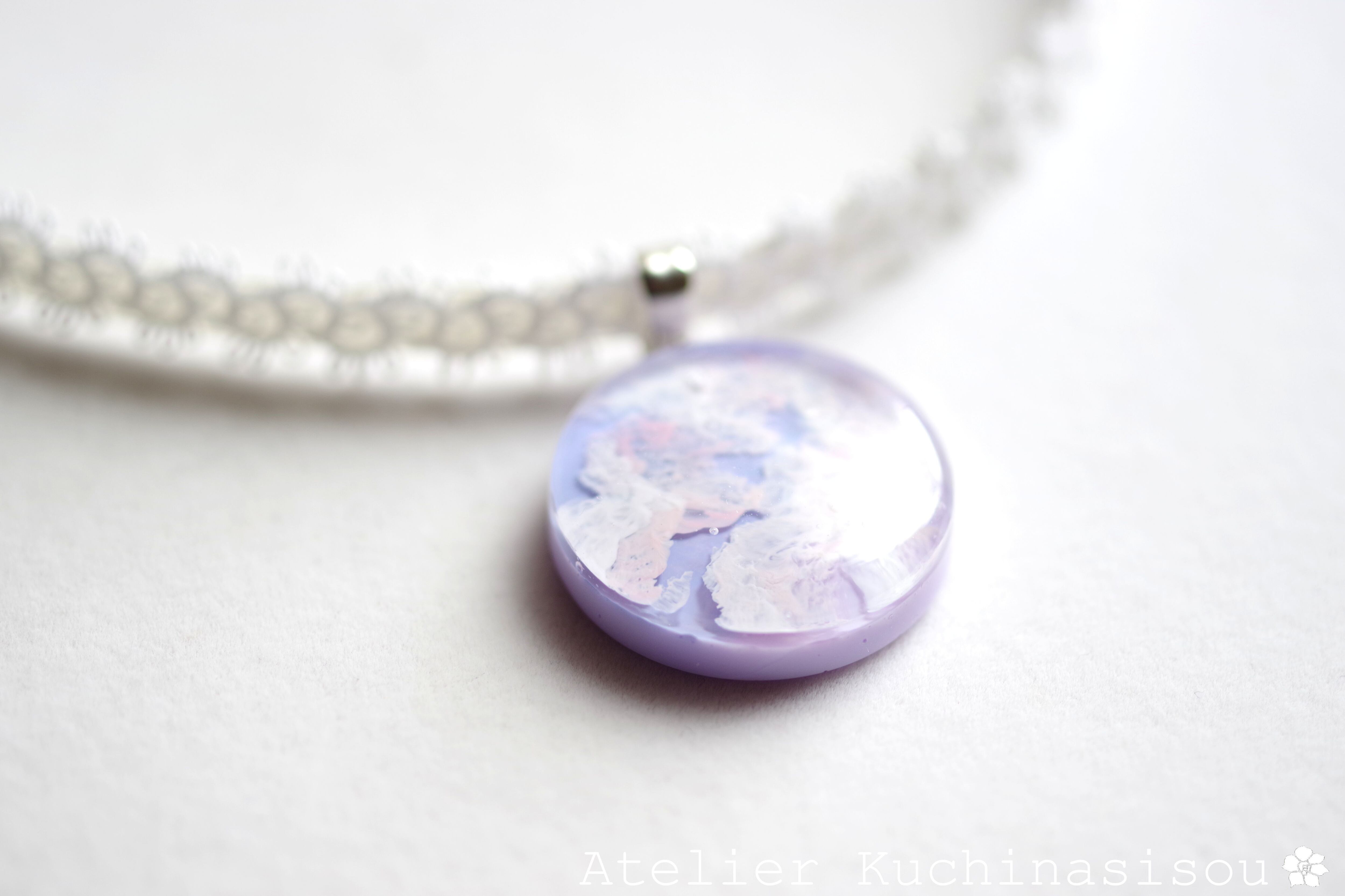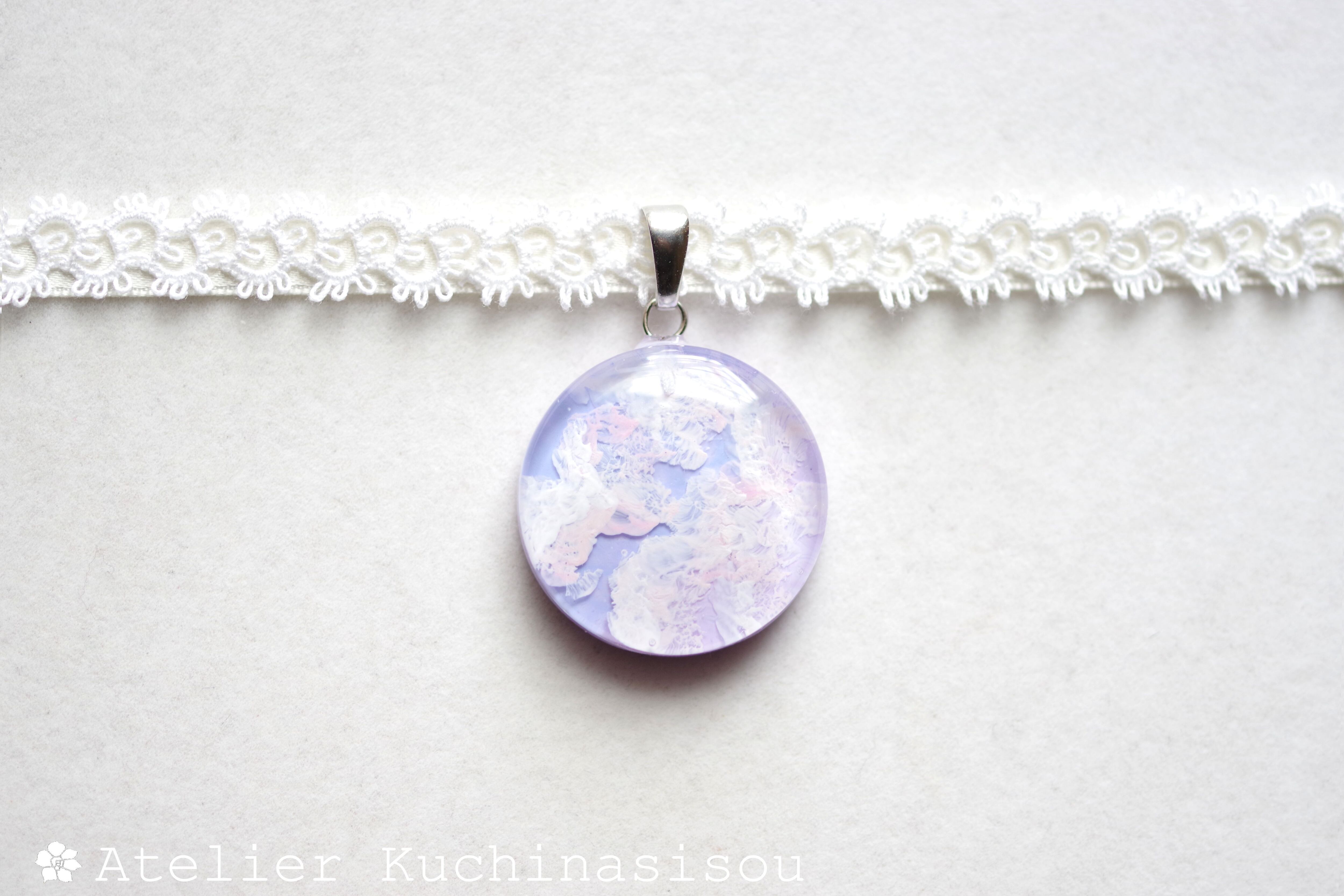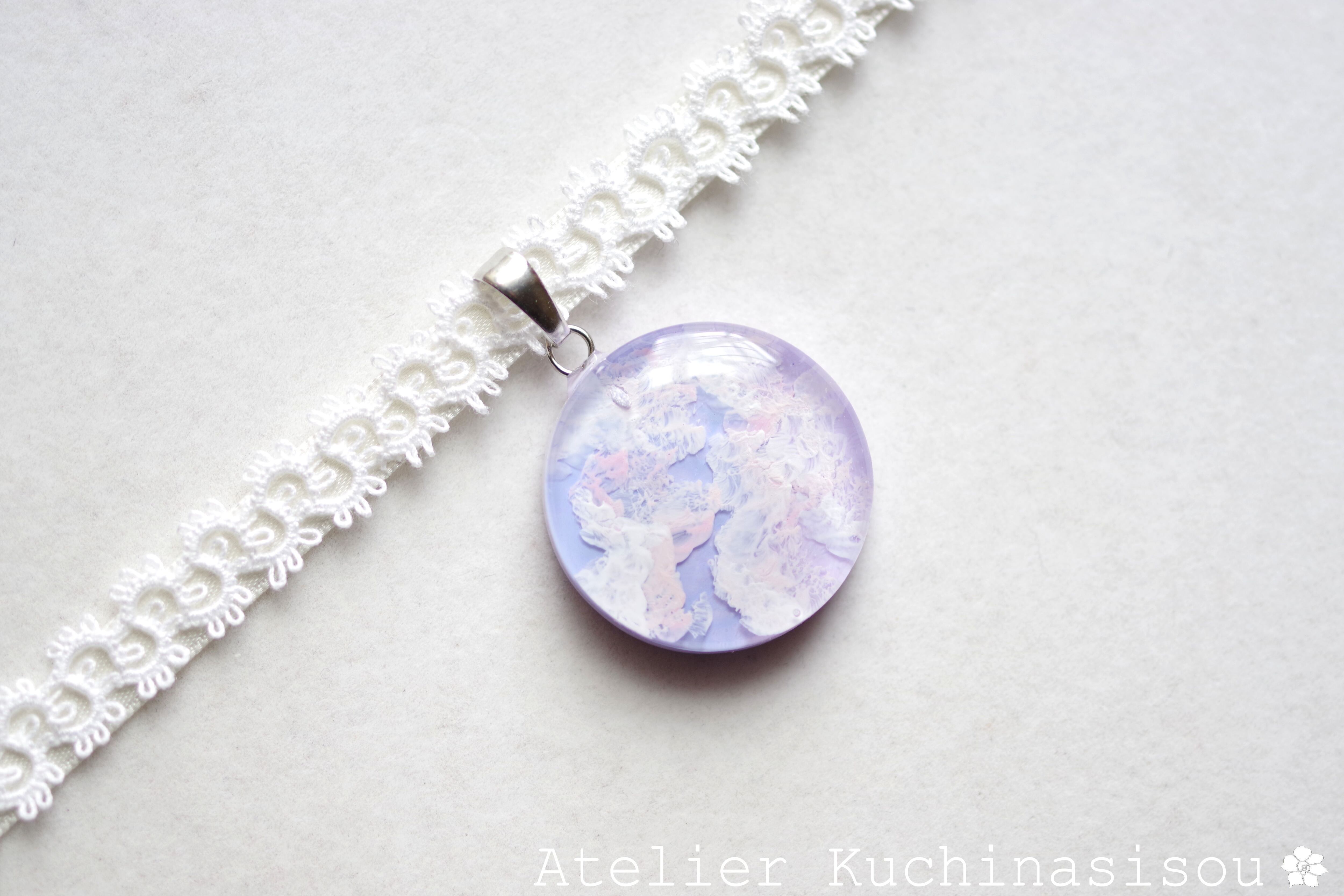 明け方のようにも黄昏のようにも見える、紫色にほのかにピンクが混じった雲に覆われた空を思わせるレジンを、サテンリボンにタティングレースで装飾を施したチョーカーに仕上げました。