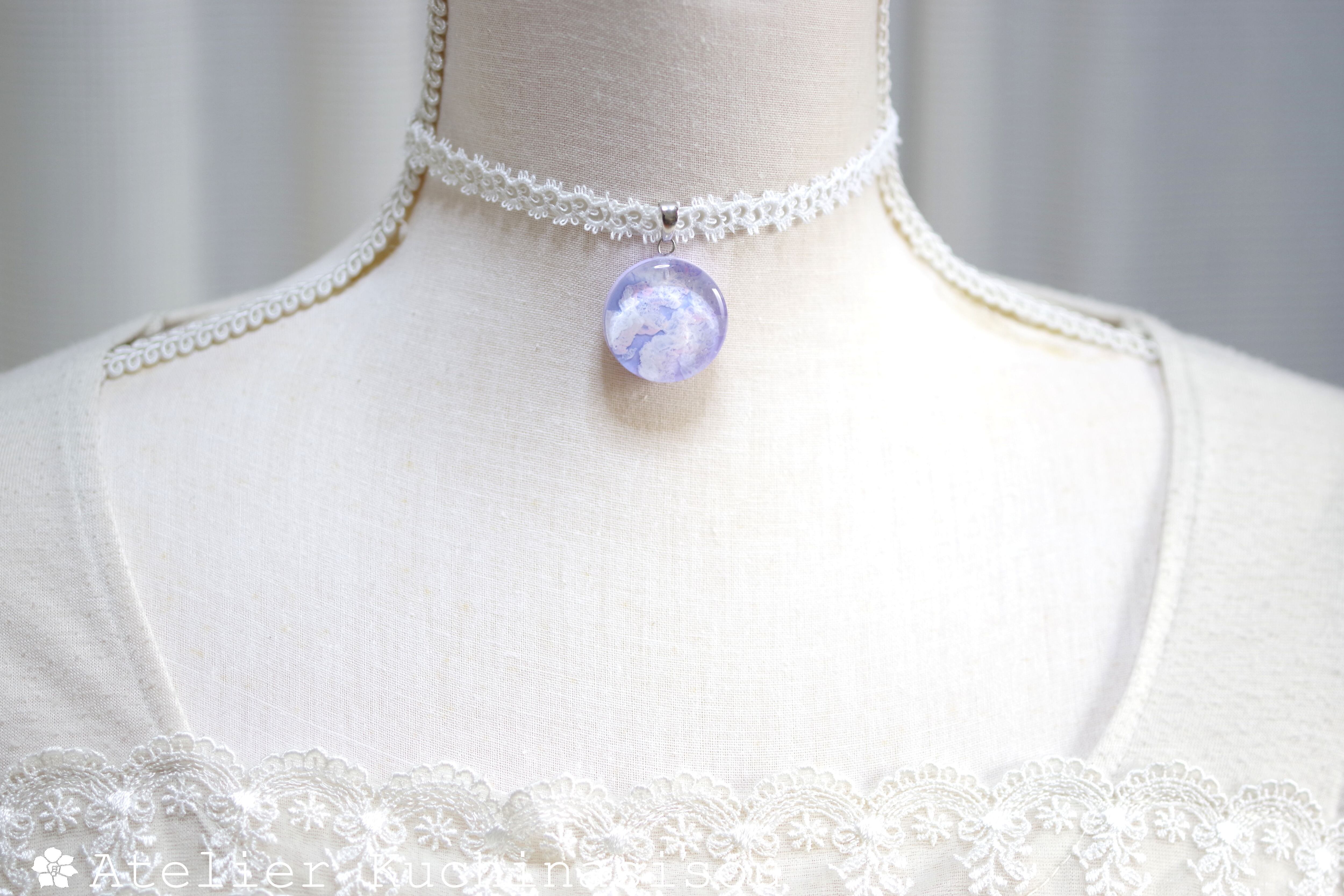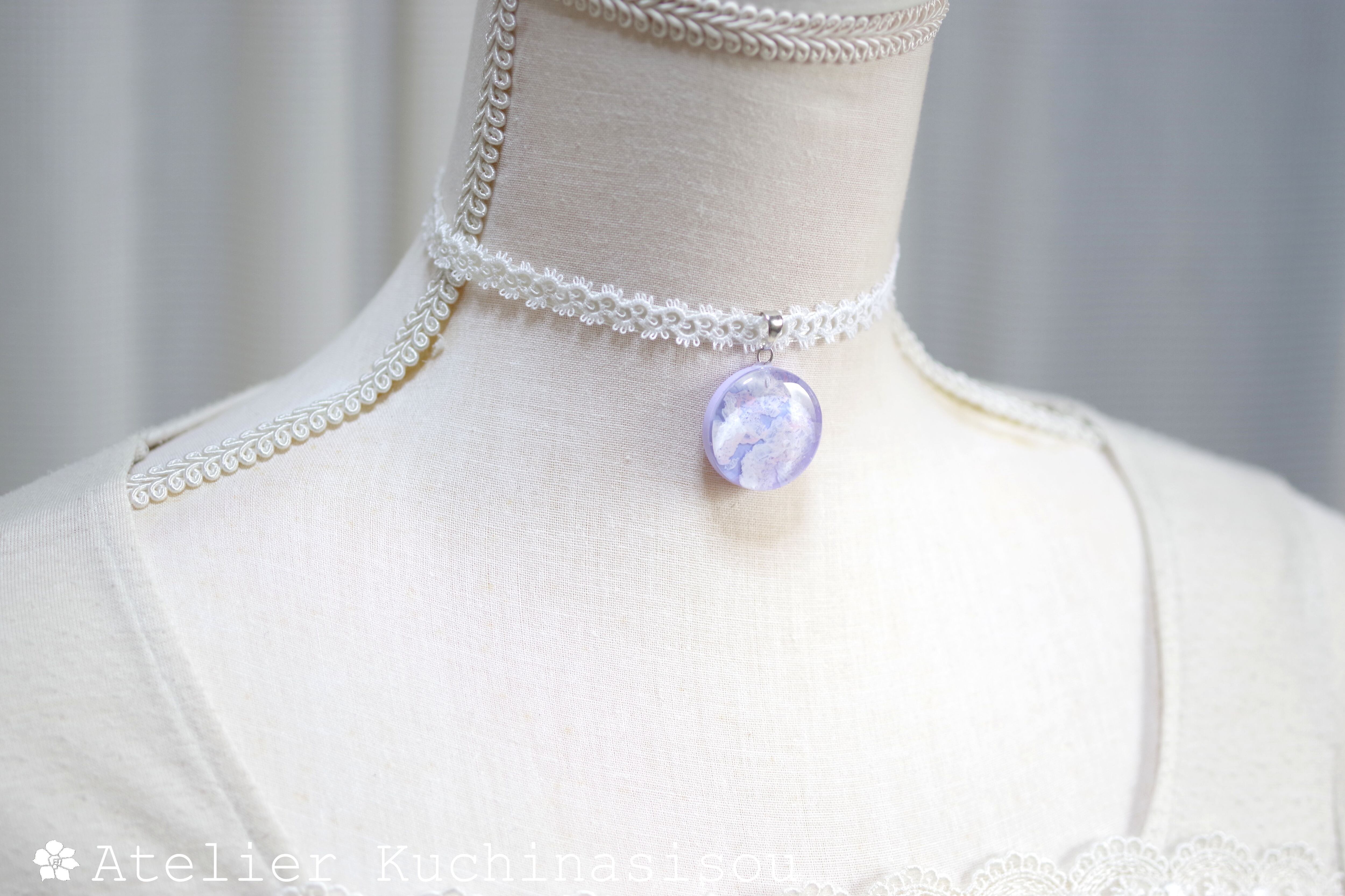 【受注製作】レジンアート ラウンドモチーフとタティングレースとサテンリボンのチョーカー〈紫雲②〉25㎜