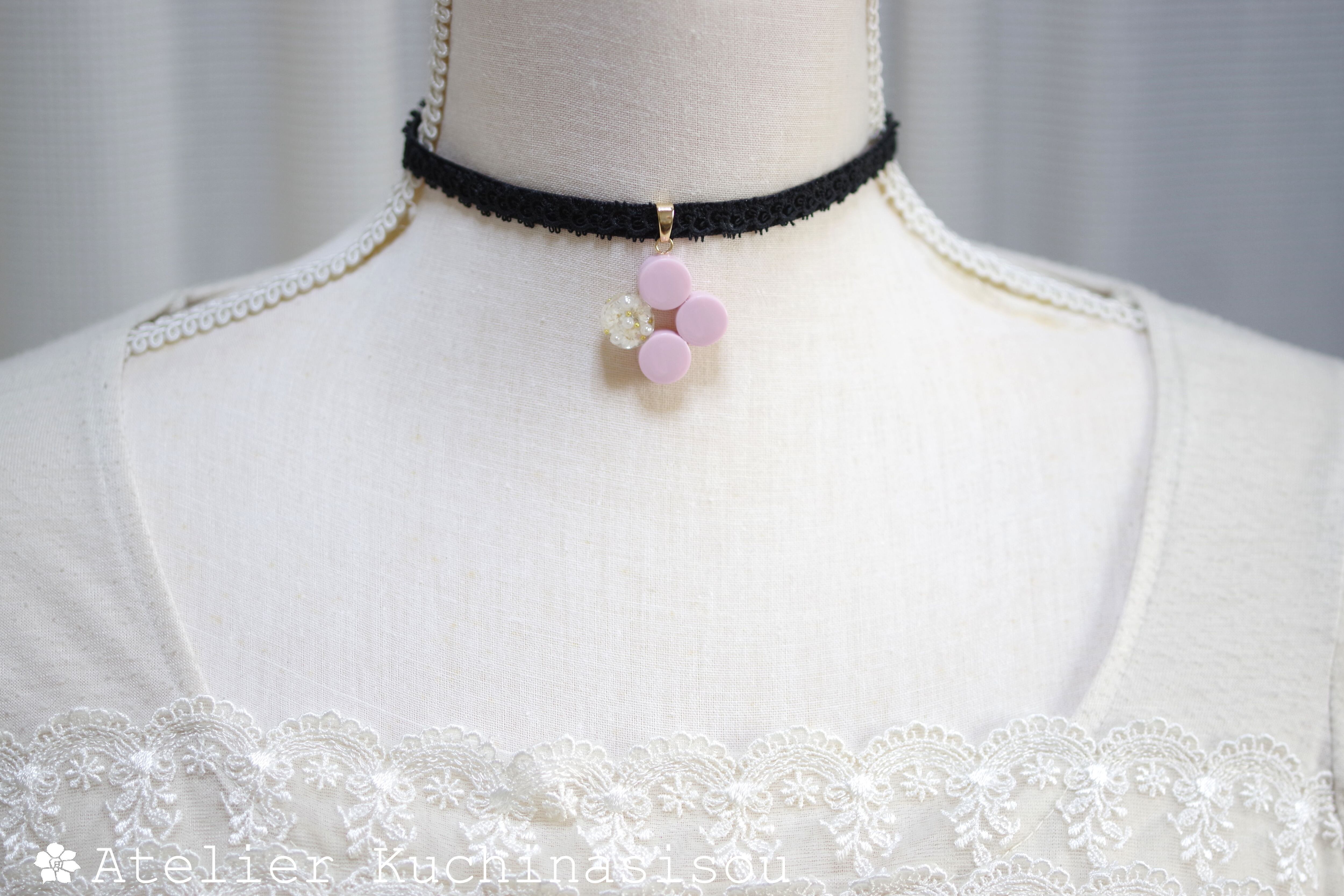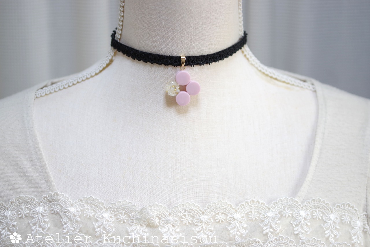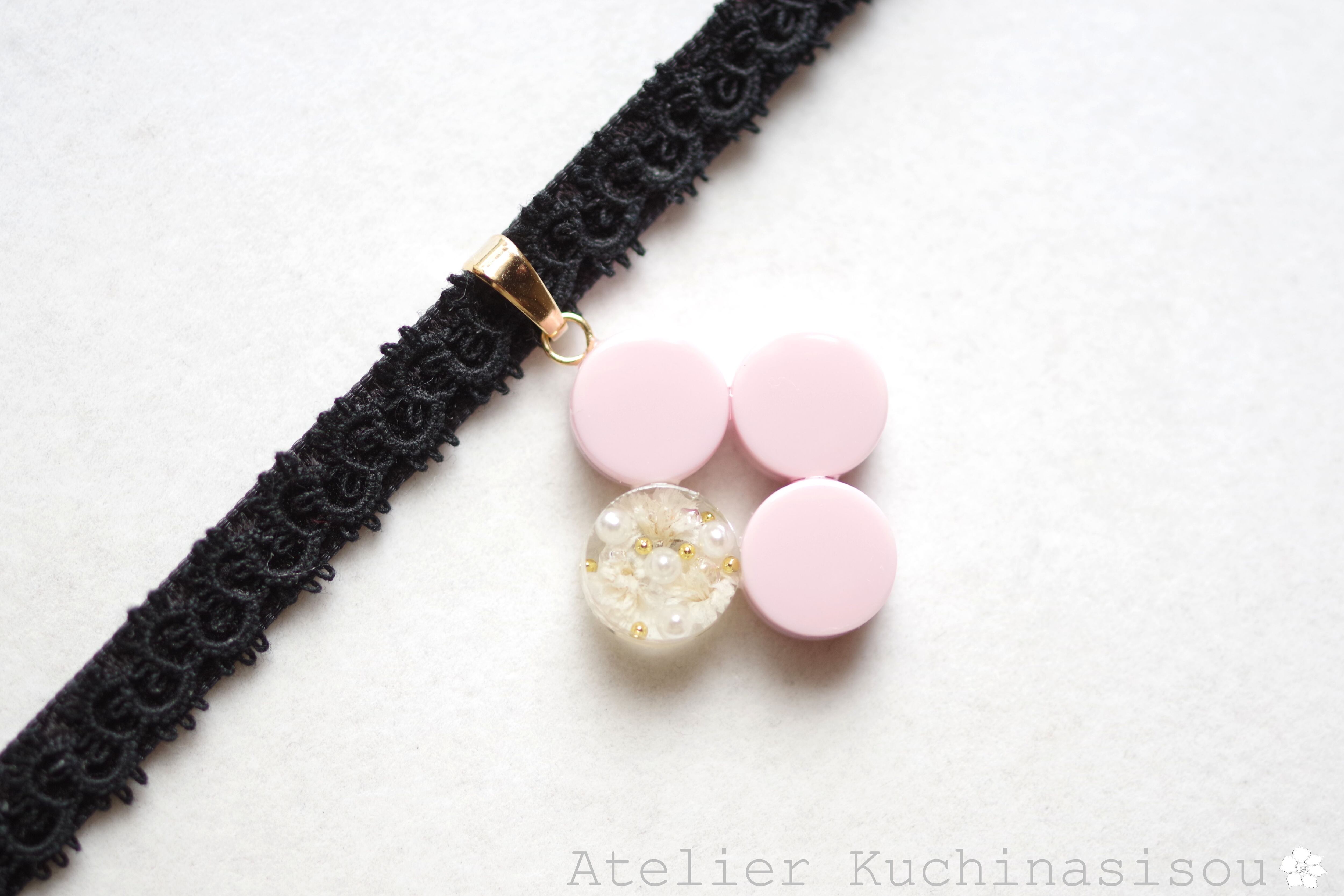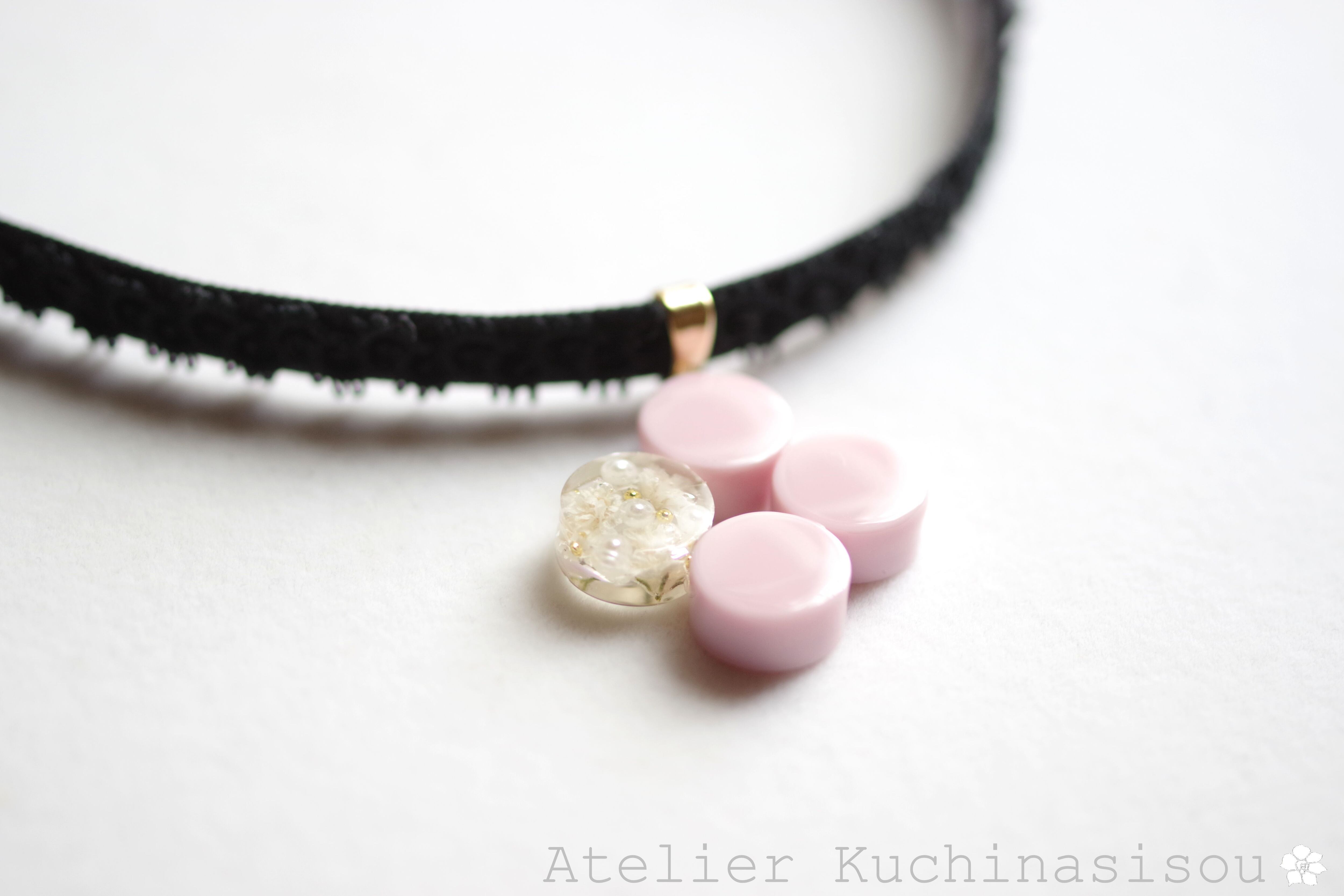 不透明なピンクの粒を三つ、そしてお花にパール、ブリオンを沈めた透明の粒を一つアクセントに連ねた可憐なレジンを、ベルベットリボンにタティングレースで装飾を施したチョーカーに仕上げました。