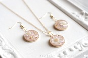 優しいピンクの背景に大きなお花を一輪と、ピンクの花びら、金箔とブリオンを散らした、華やかなペンダントです。