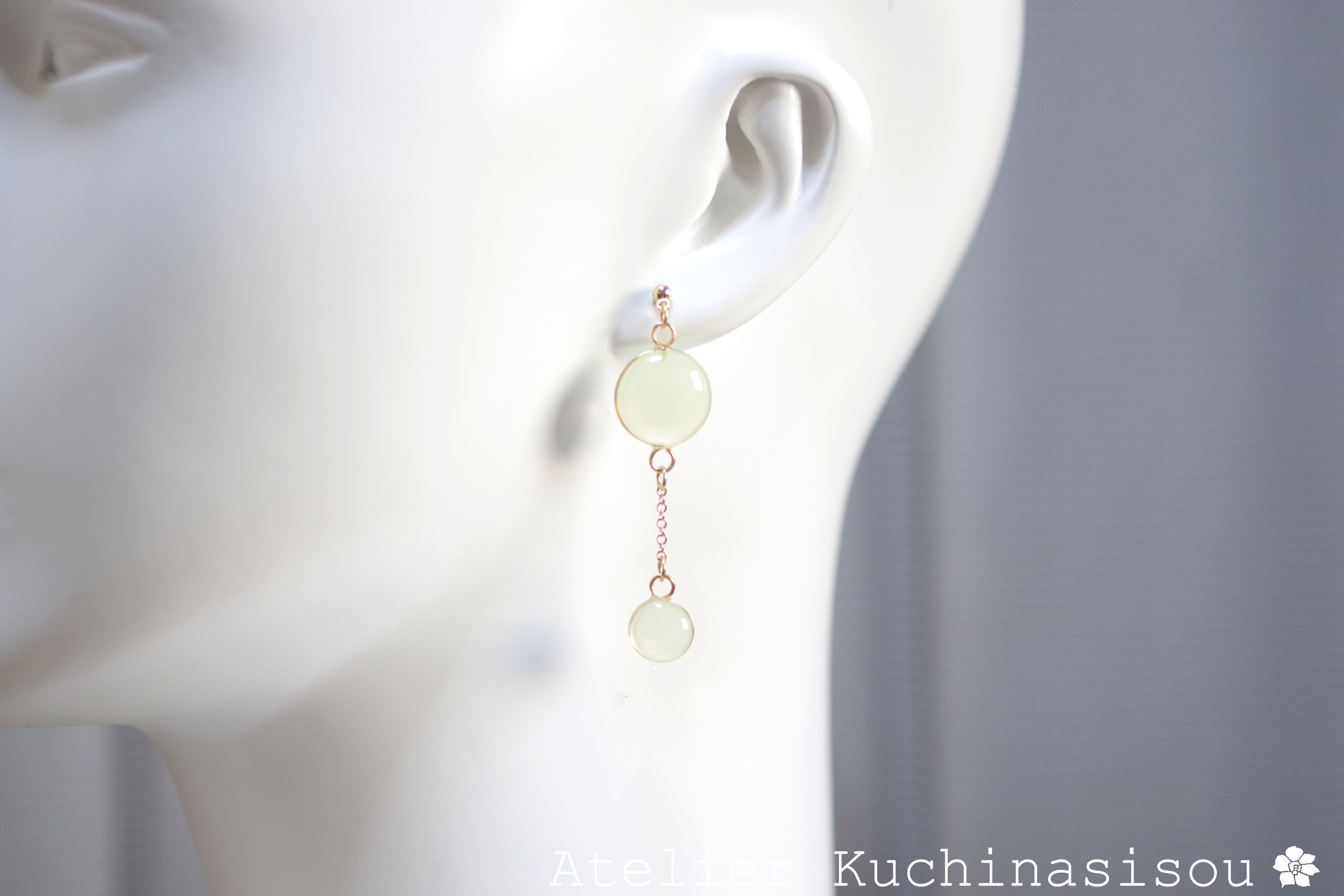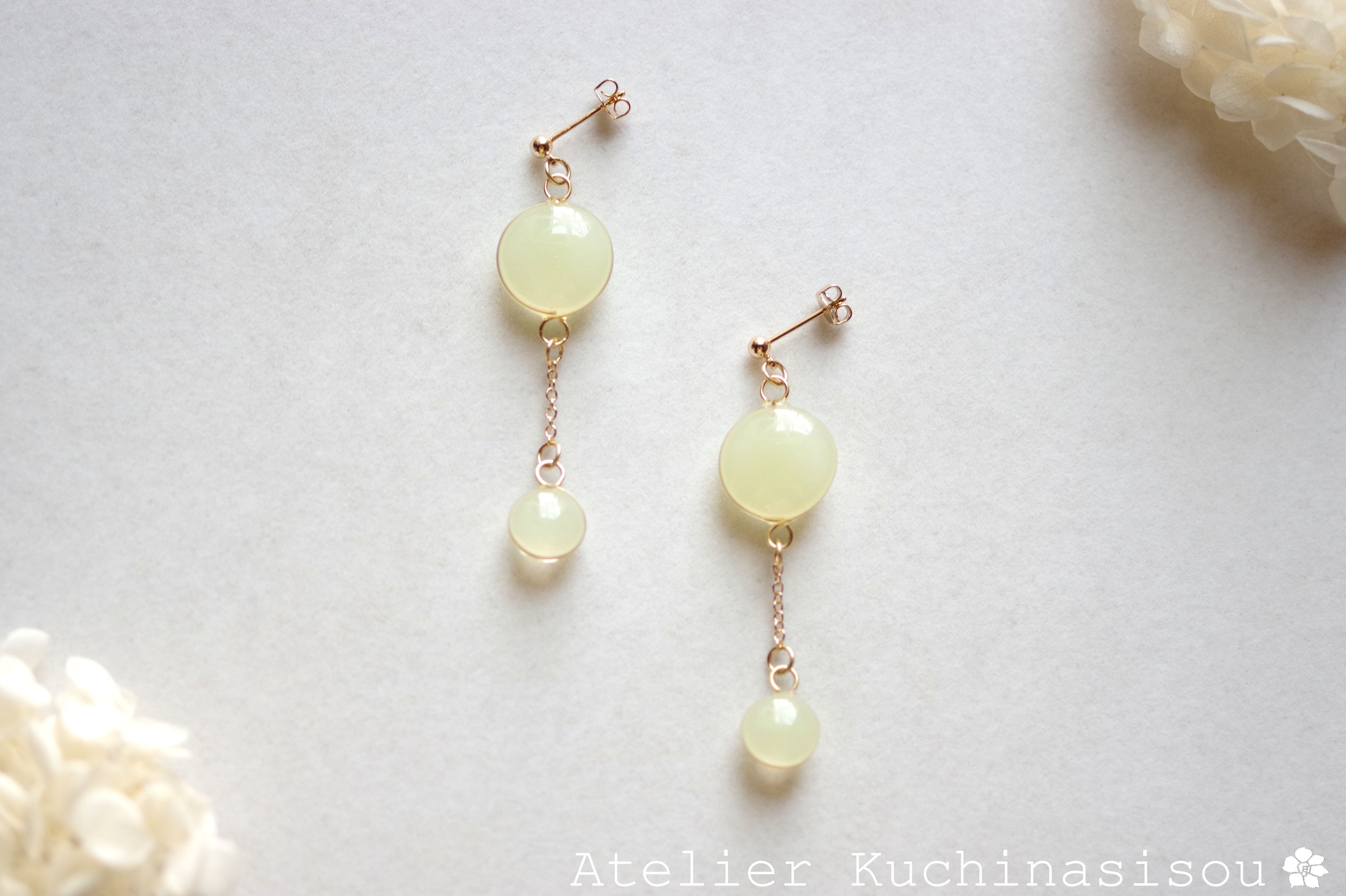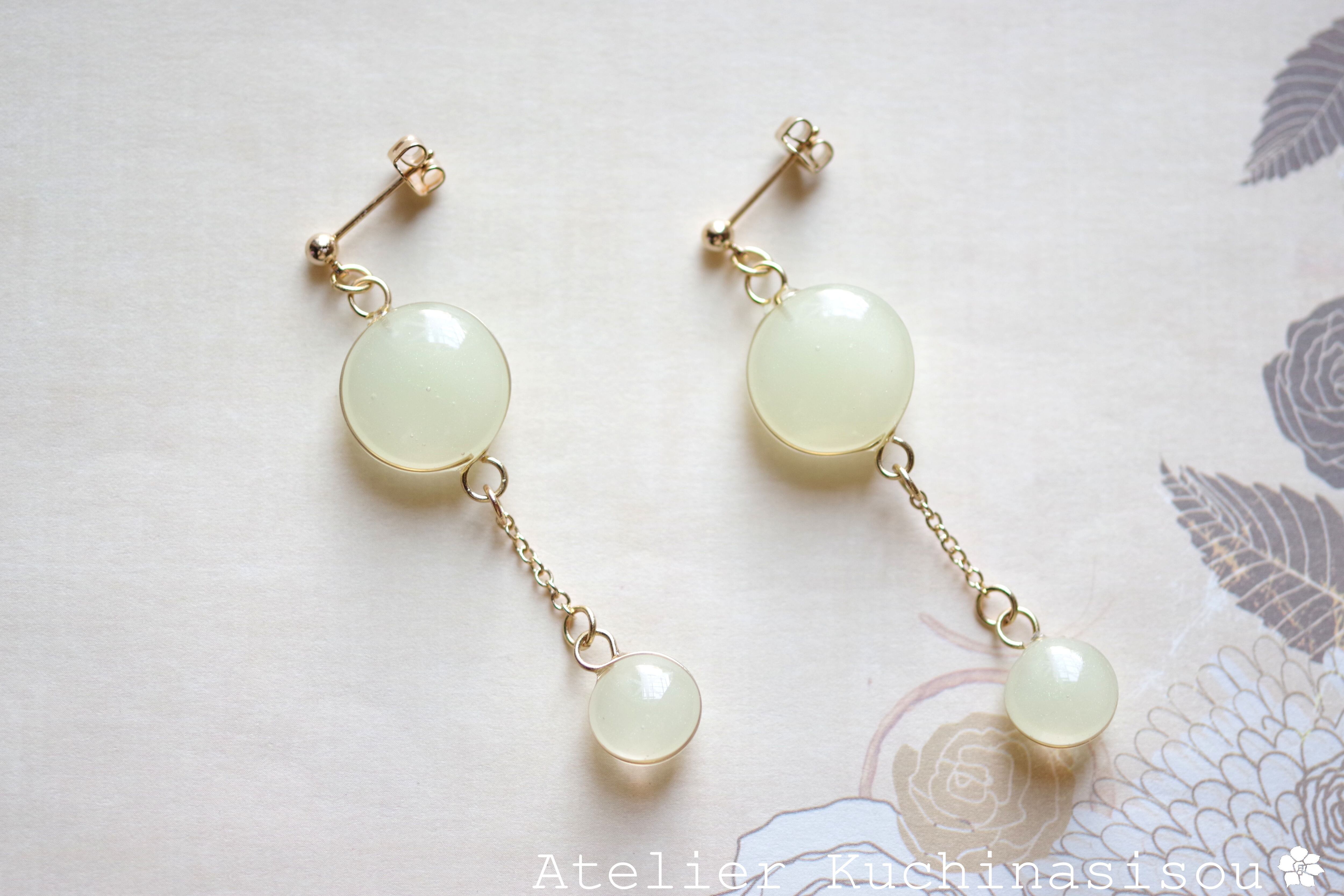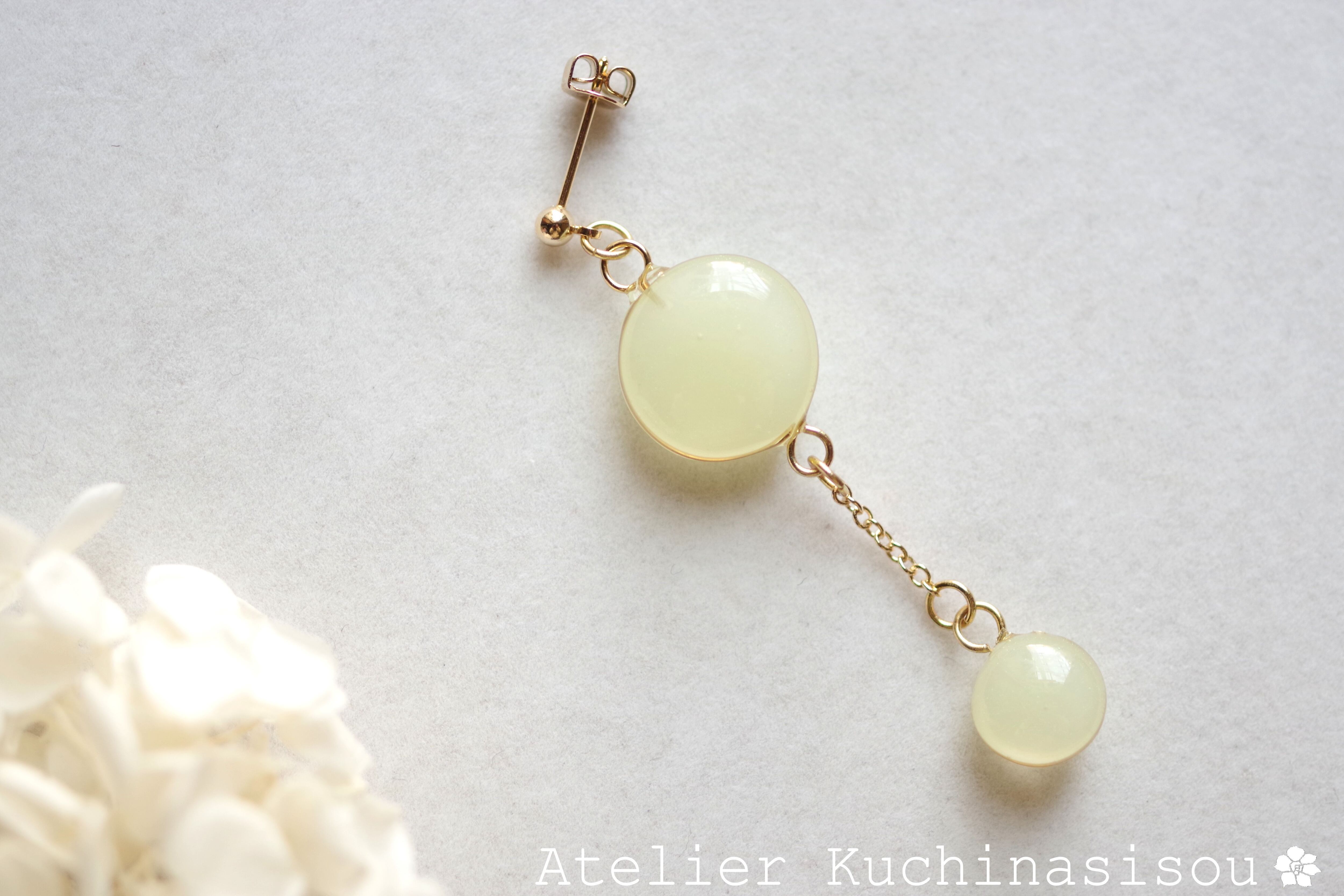 ぷっくり張りつめた大小の水滴のようなレジンの艶めきに魅入ってしまうピアス。