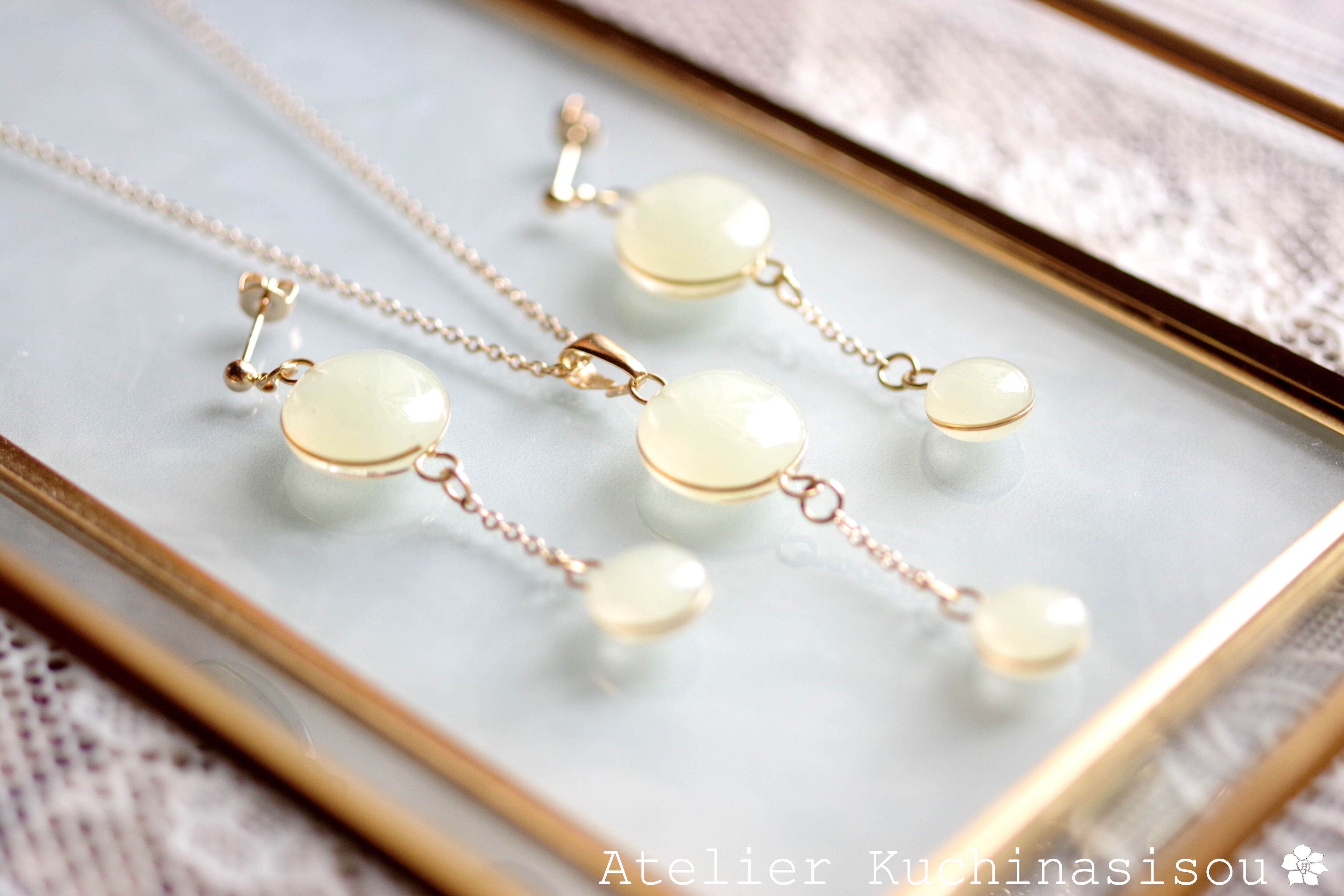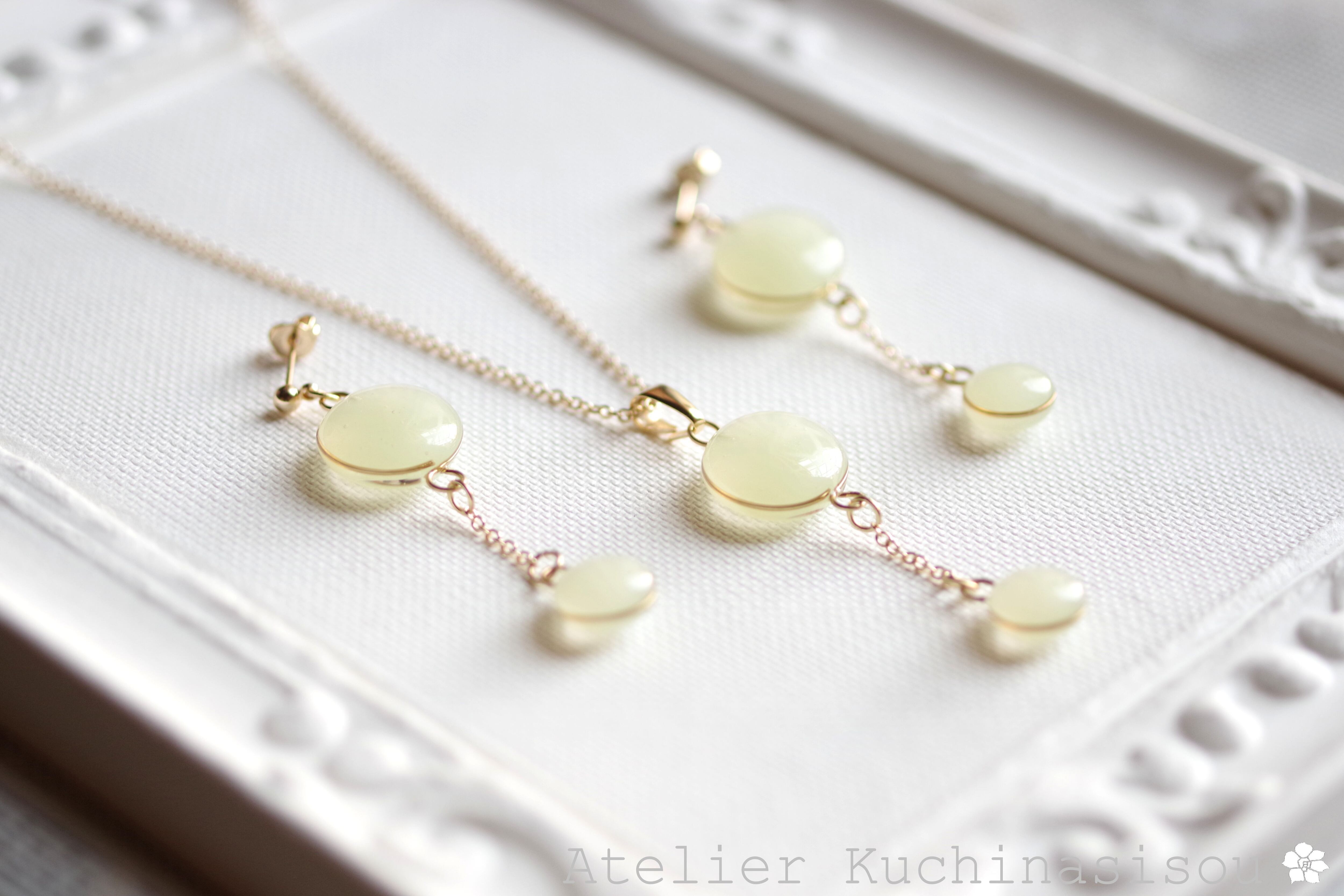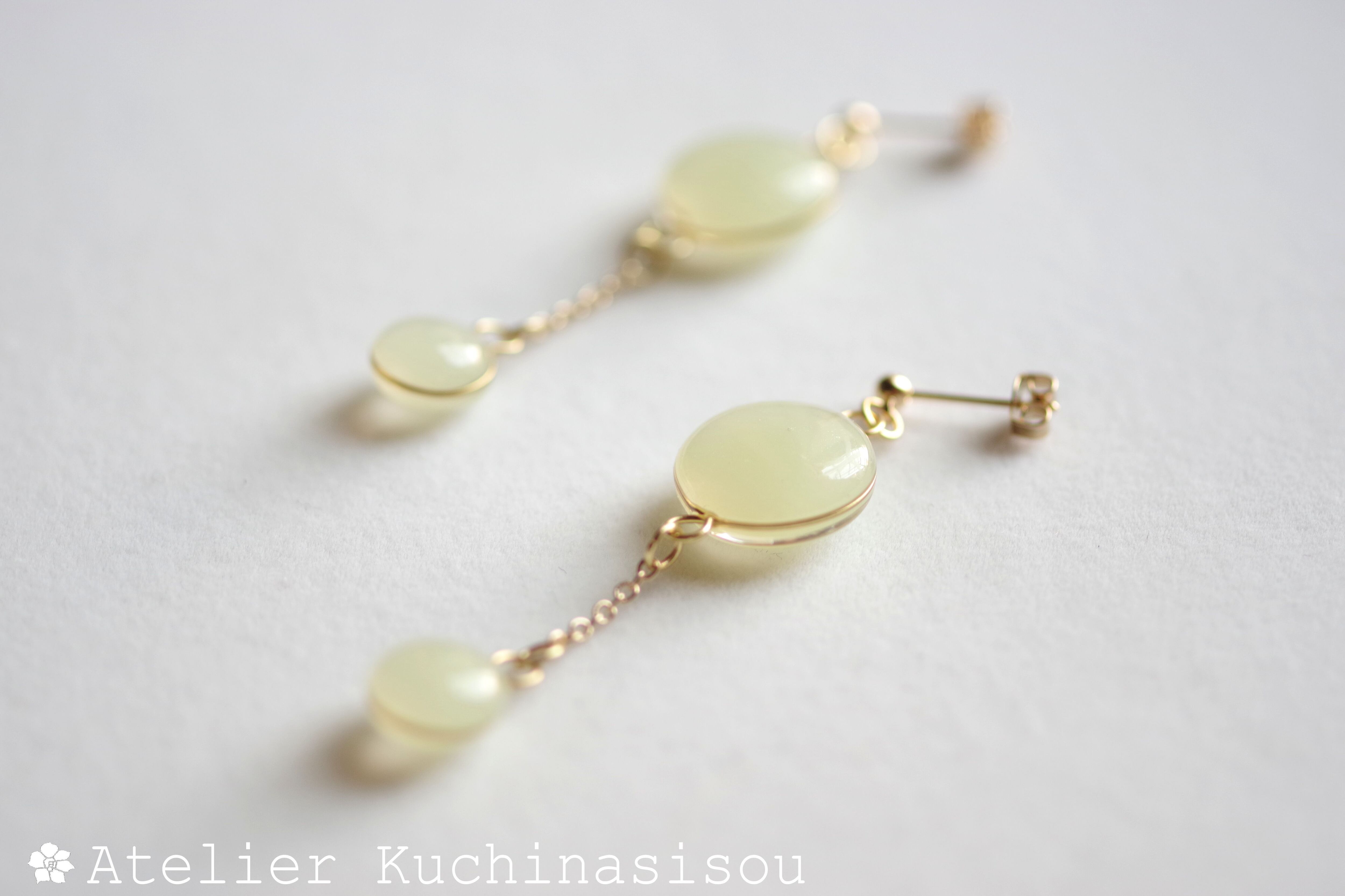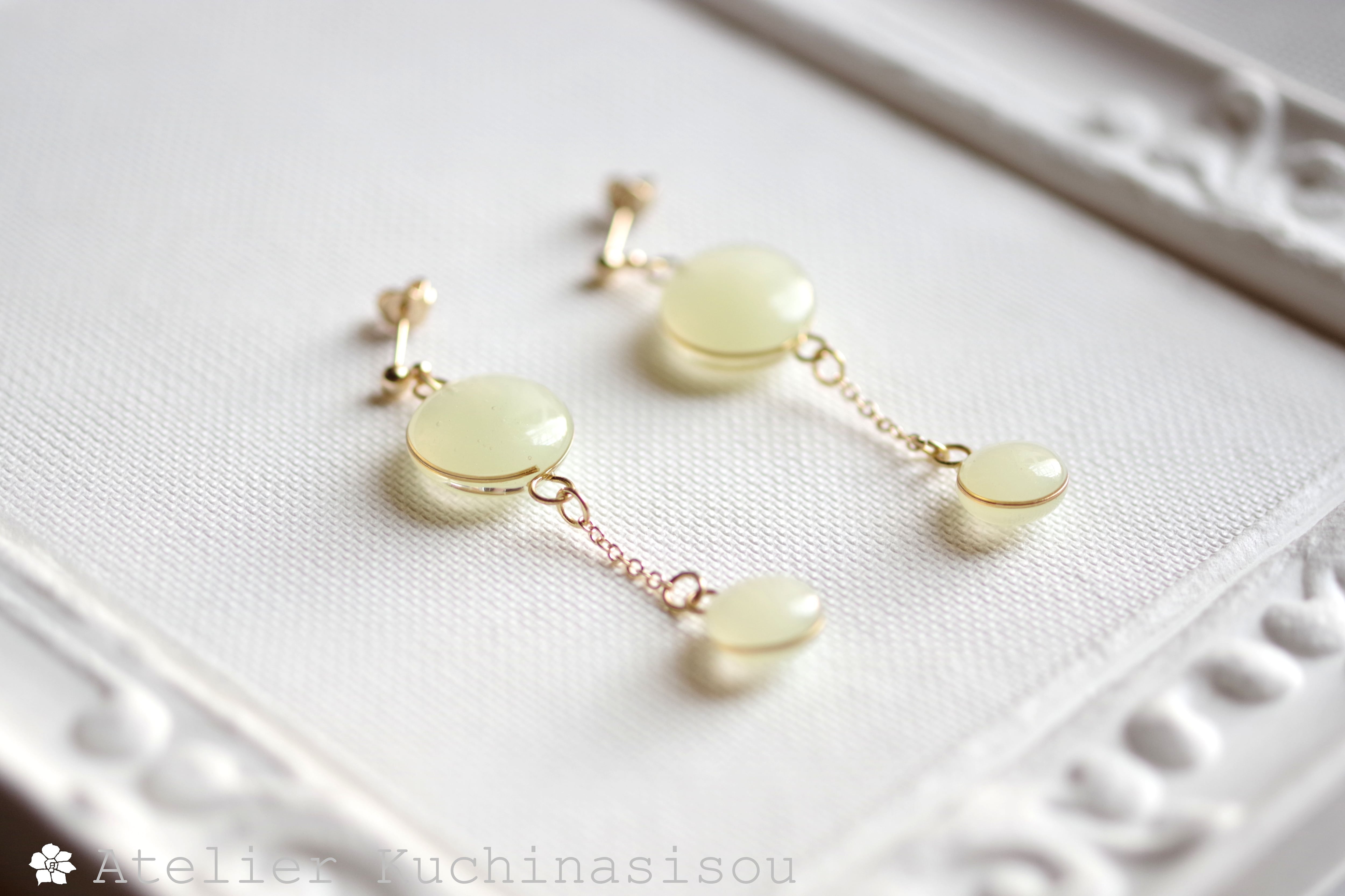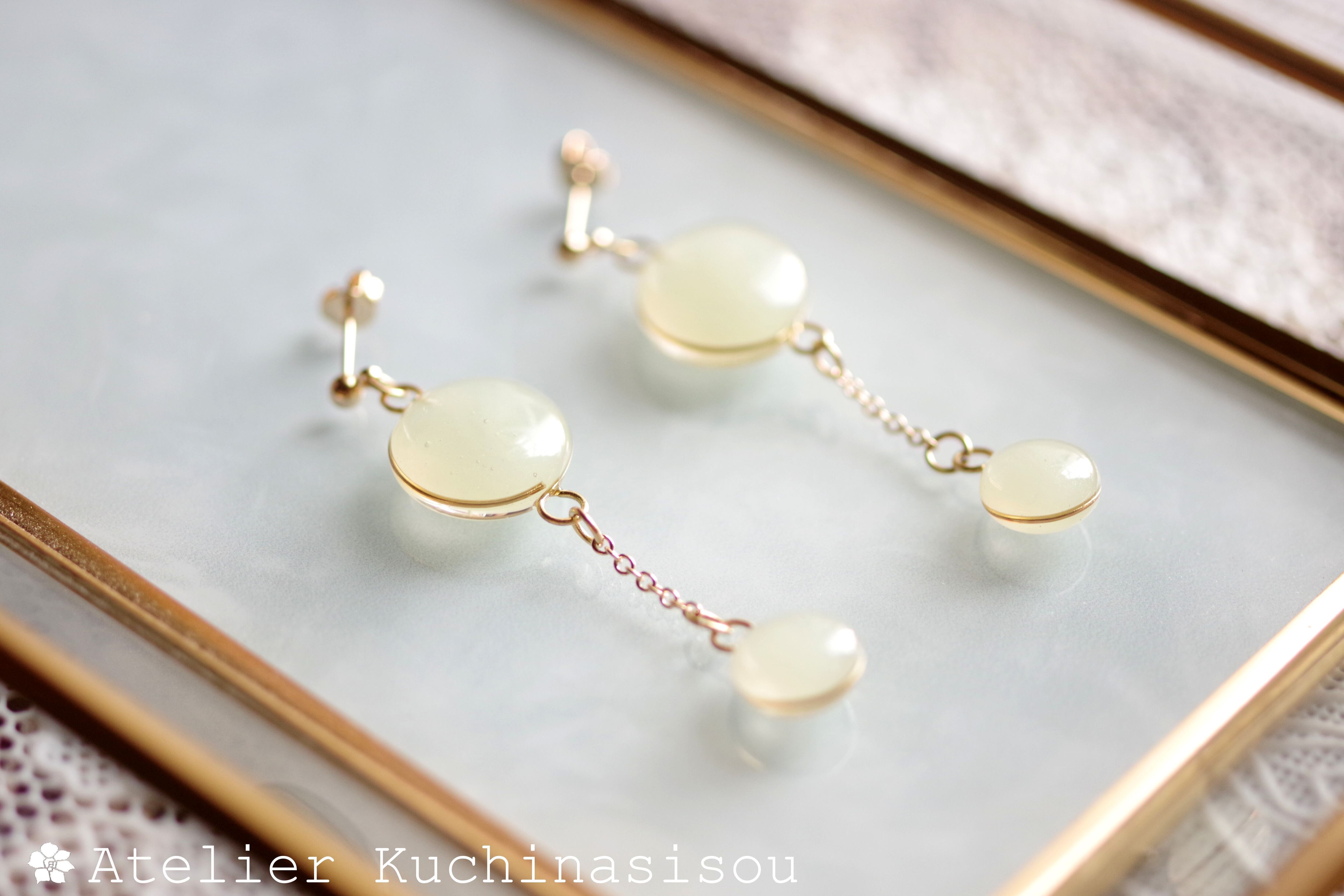 ぷっくり張りつめた大小の水滴のようなレジンの艶めきに魅入ってしまうピアス。