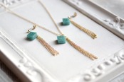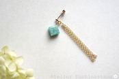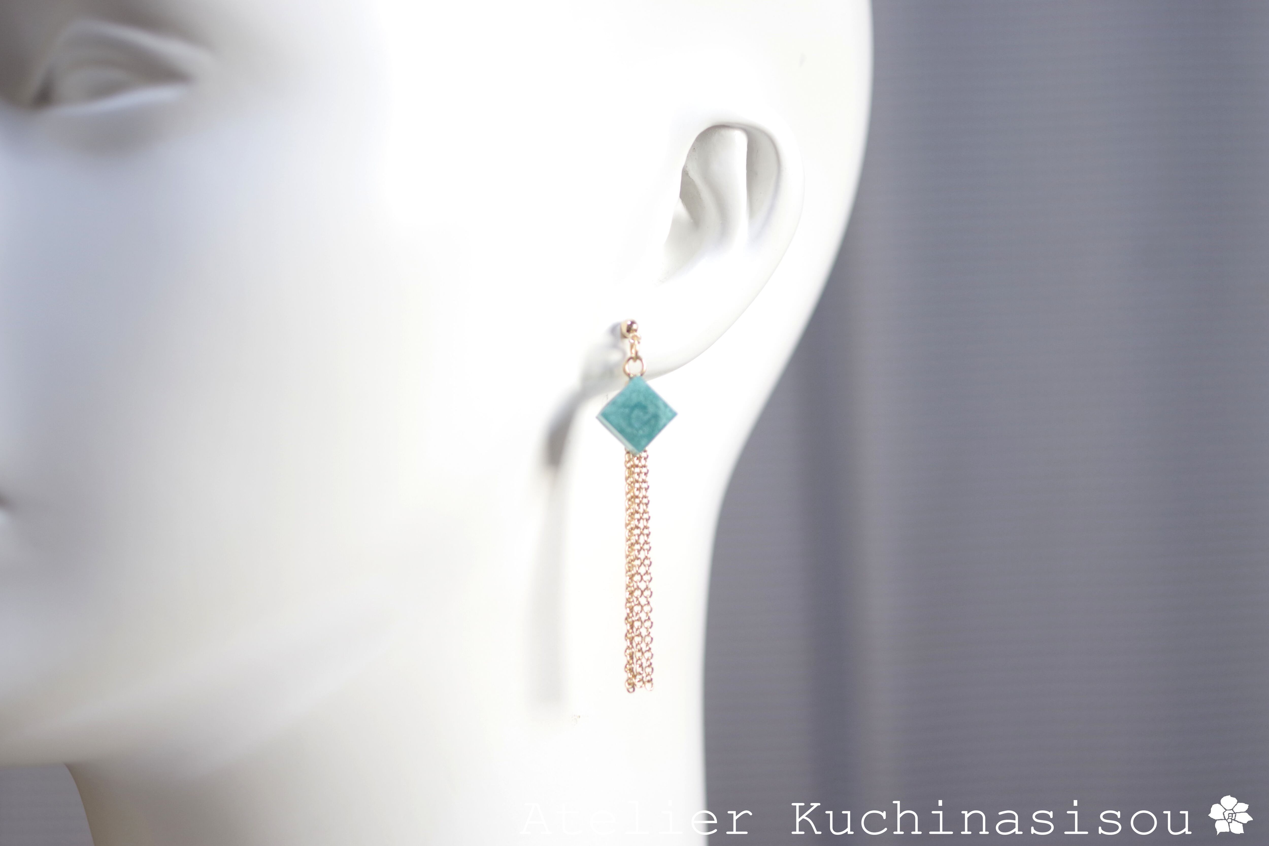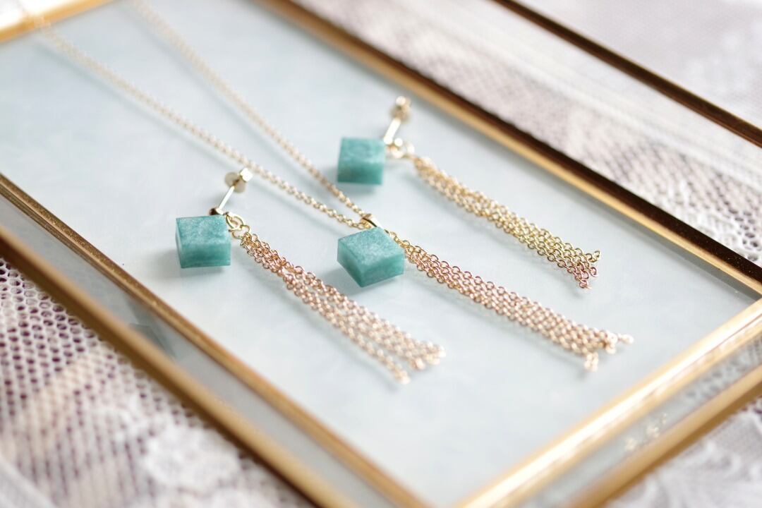 光沢のあるモスグリーンのキューブとゴールドのフリンジが耳元で揺れる様子が可憐なピアス。