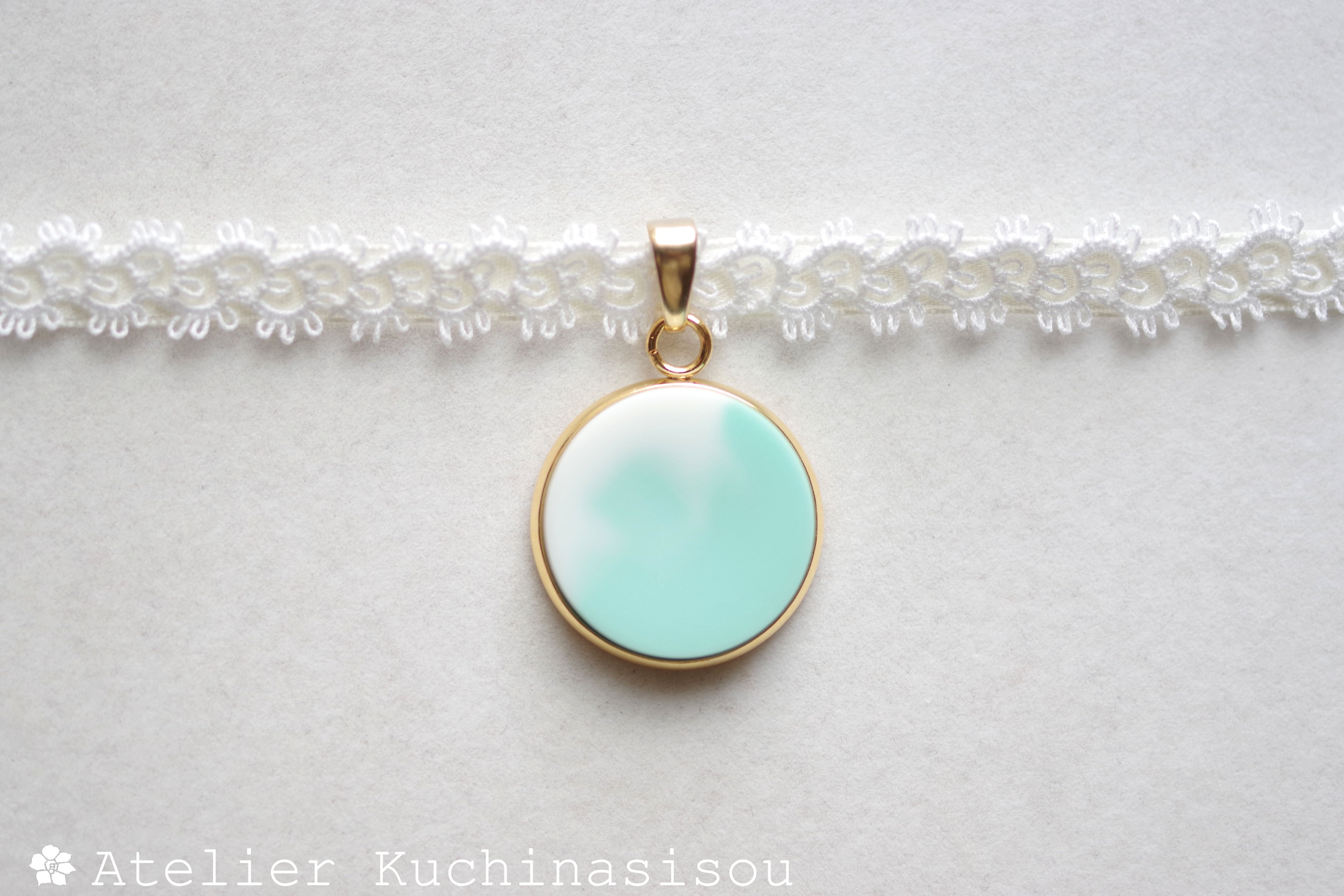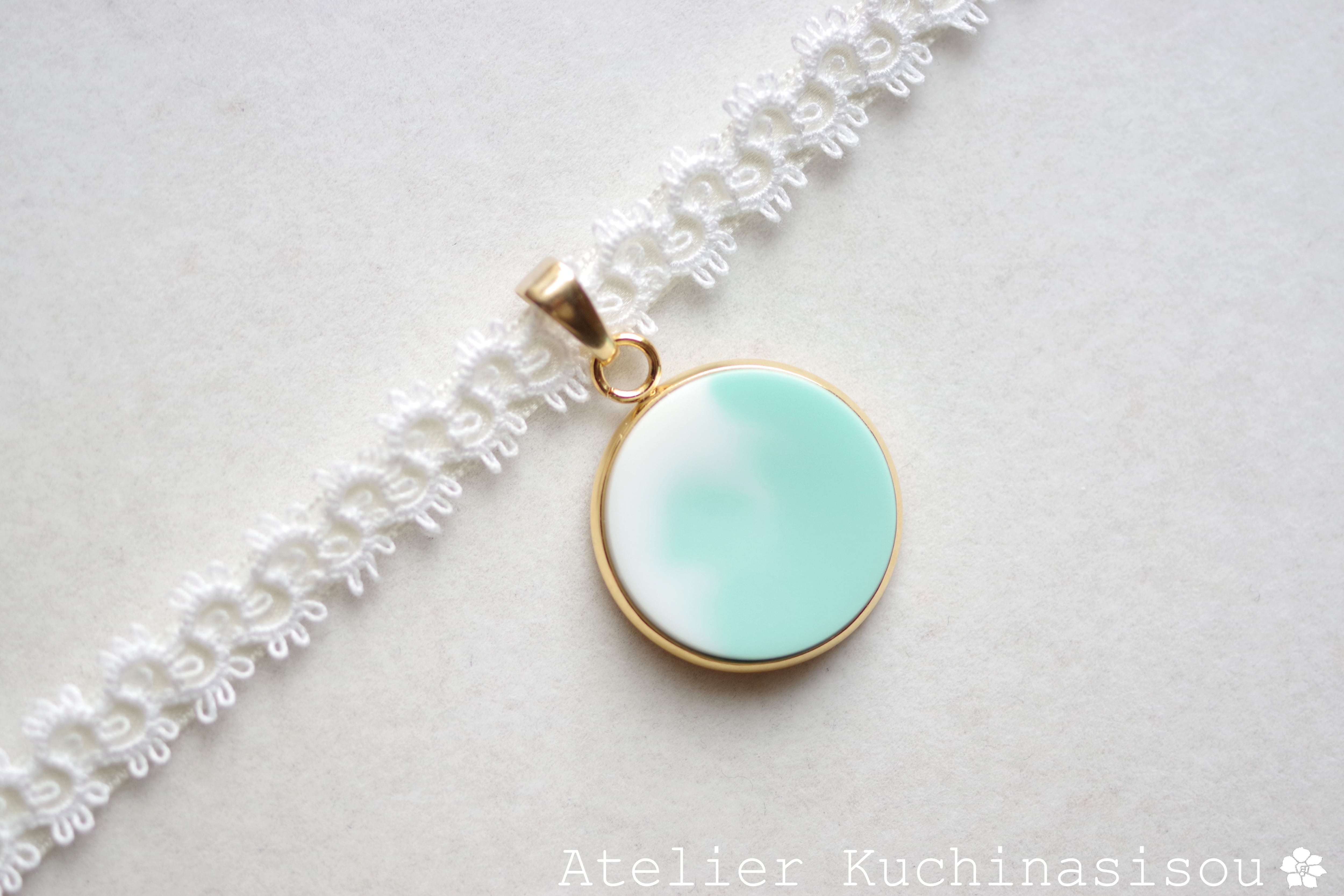 緑が萌え花が咲く爽やかな初夏という時をイメージして制作したレジンを、サテンリボンにタティングレースで装飾を施したチョーカーに仕上げました。
