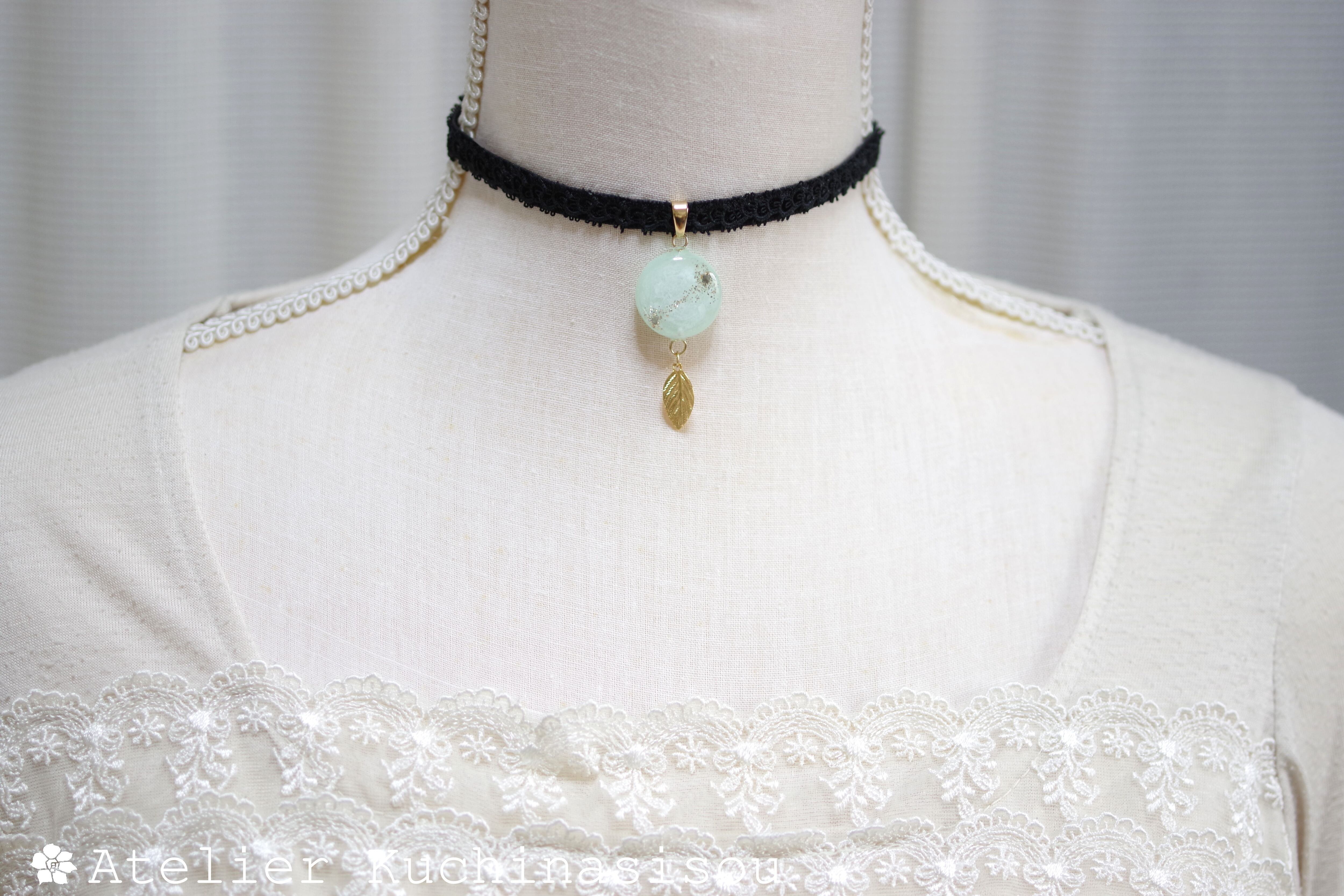 繊細で淡いグリーンがなんとも初々しく、可憐なカラーリングのレジンを、ベルベットリボンにタティングレースで装飾を施したチョーカーに仕上げました。