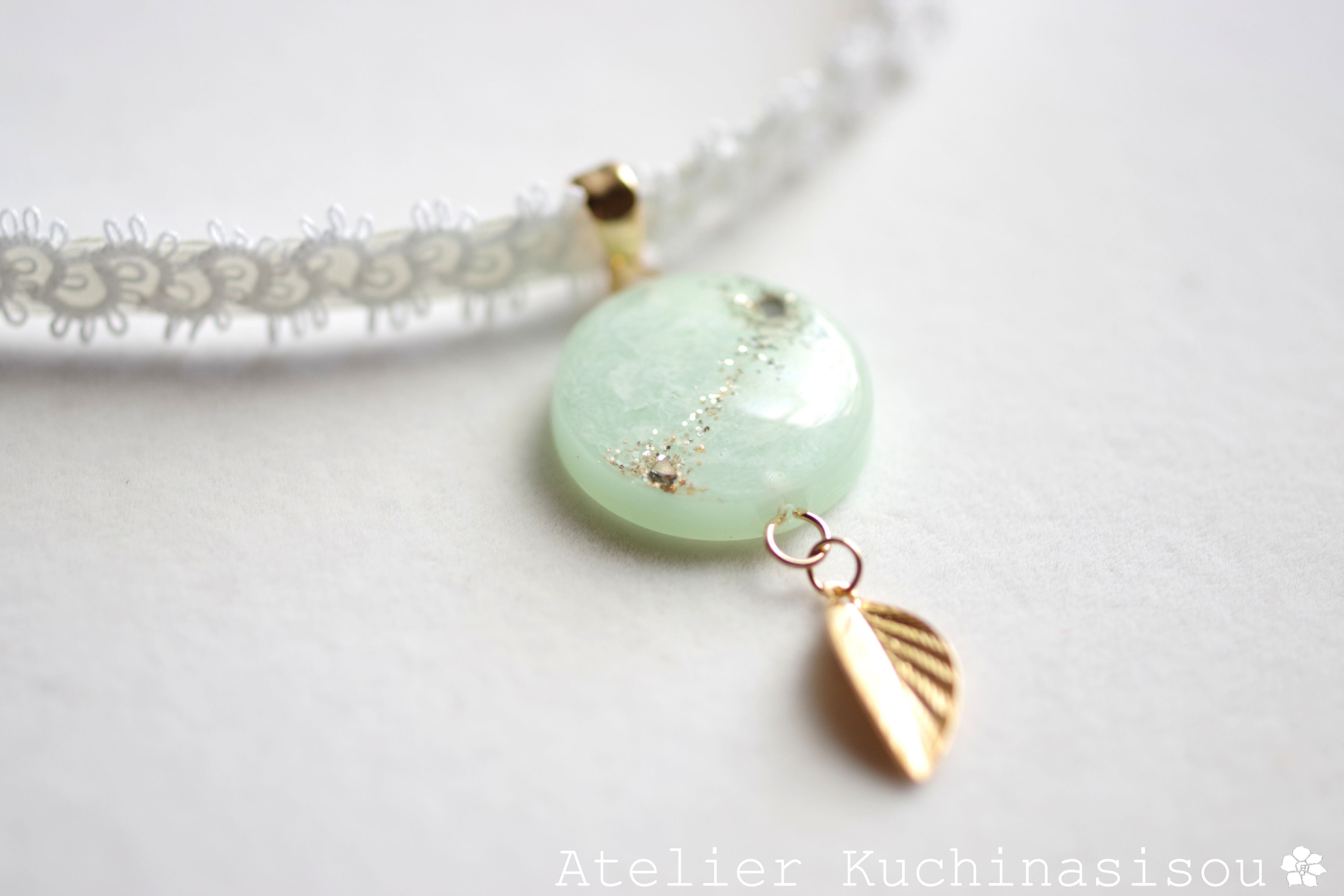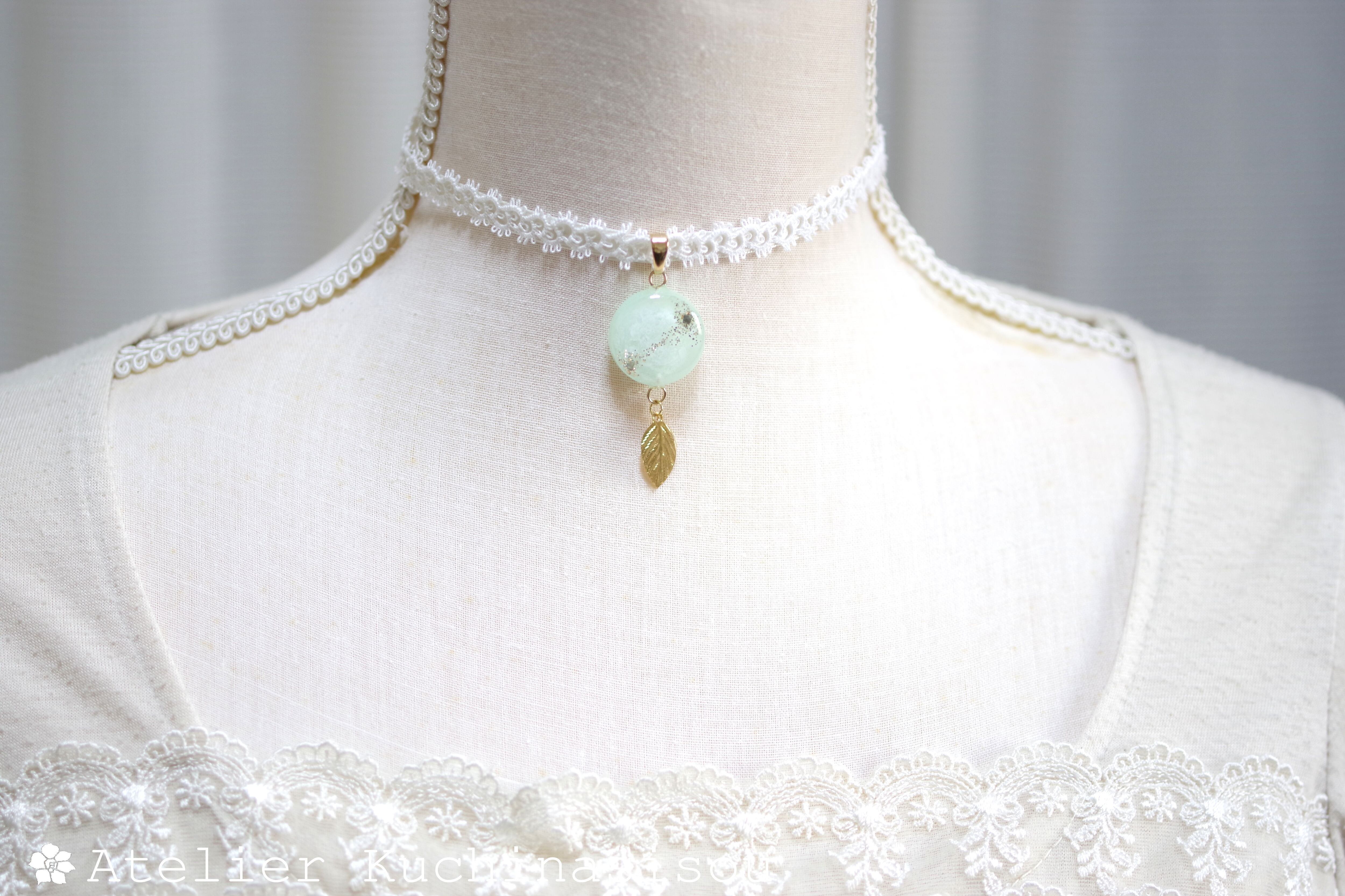 繊細で淡いグリーンがなんとも初々しく、可憐なカラーリングのレジンを、サテンリボンにタティングレースで装飾を施したチョーカーに仕上げました。