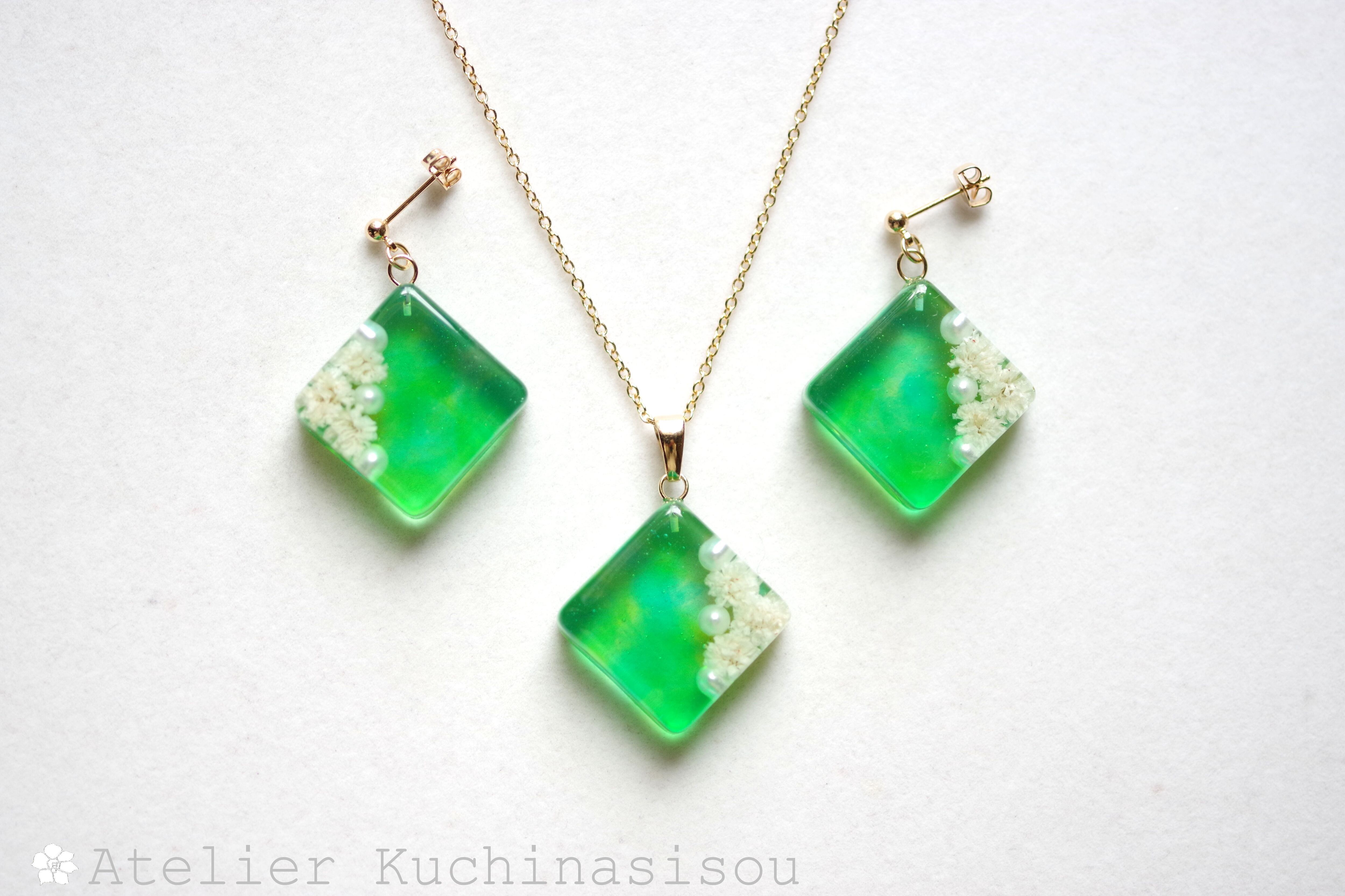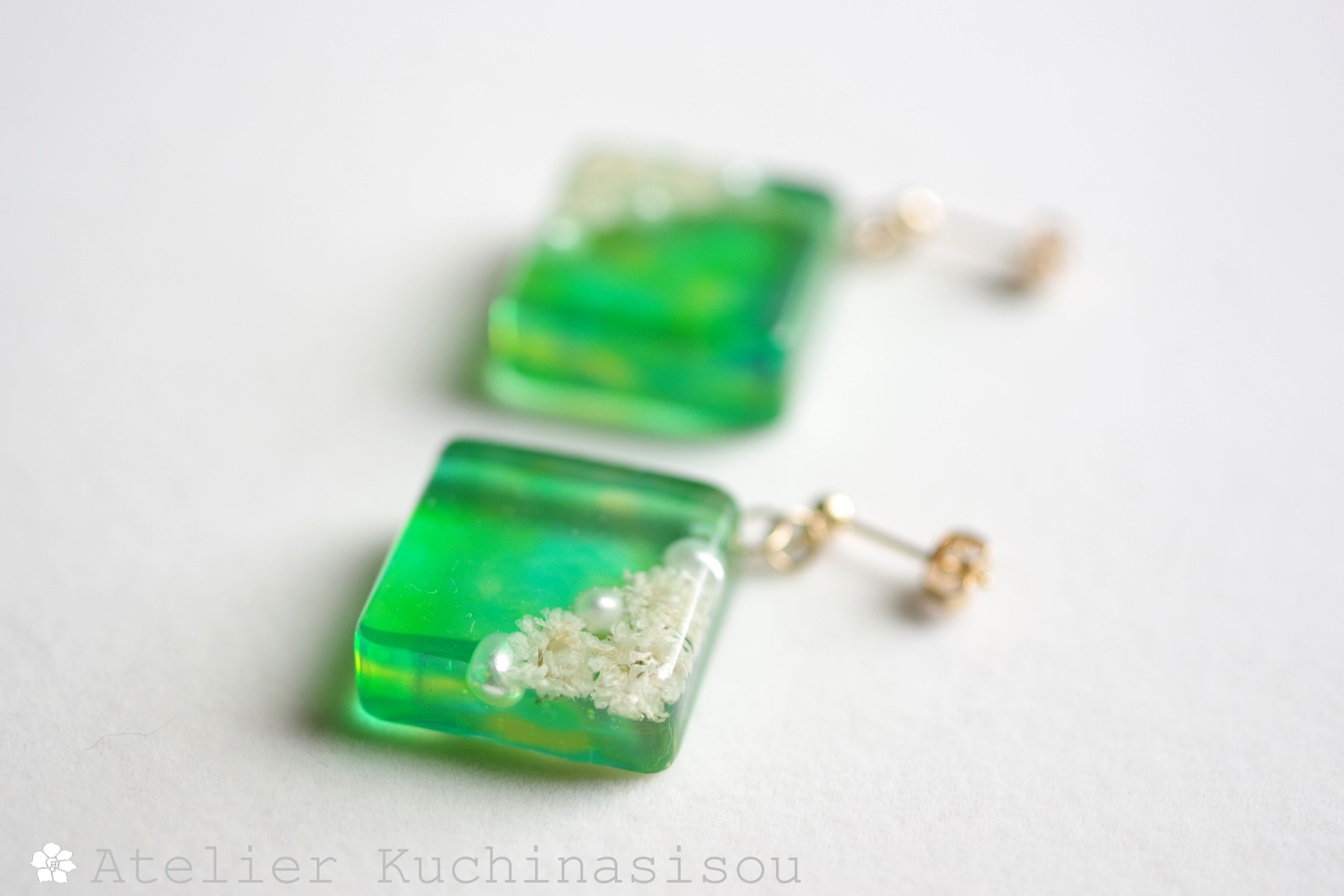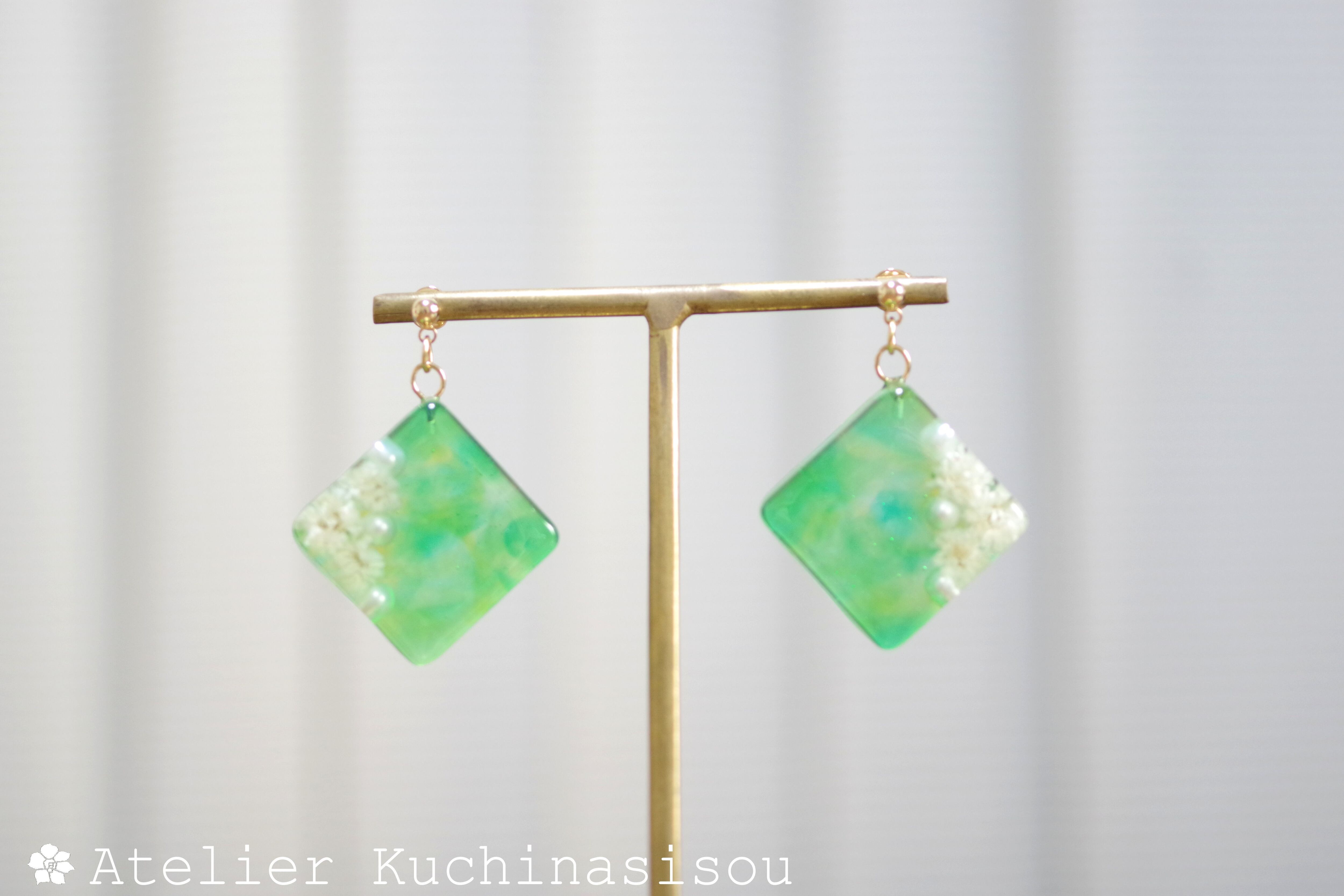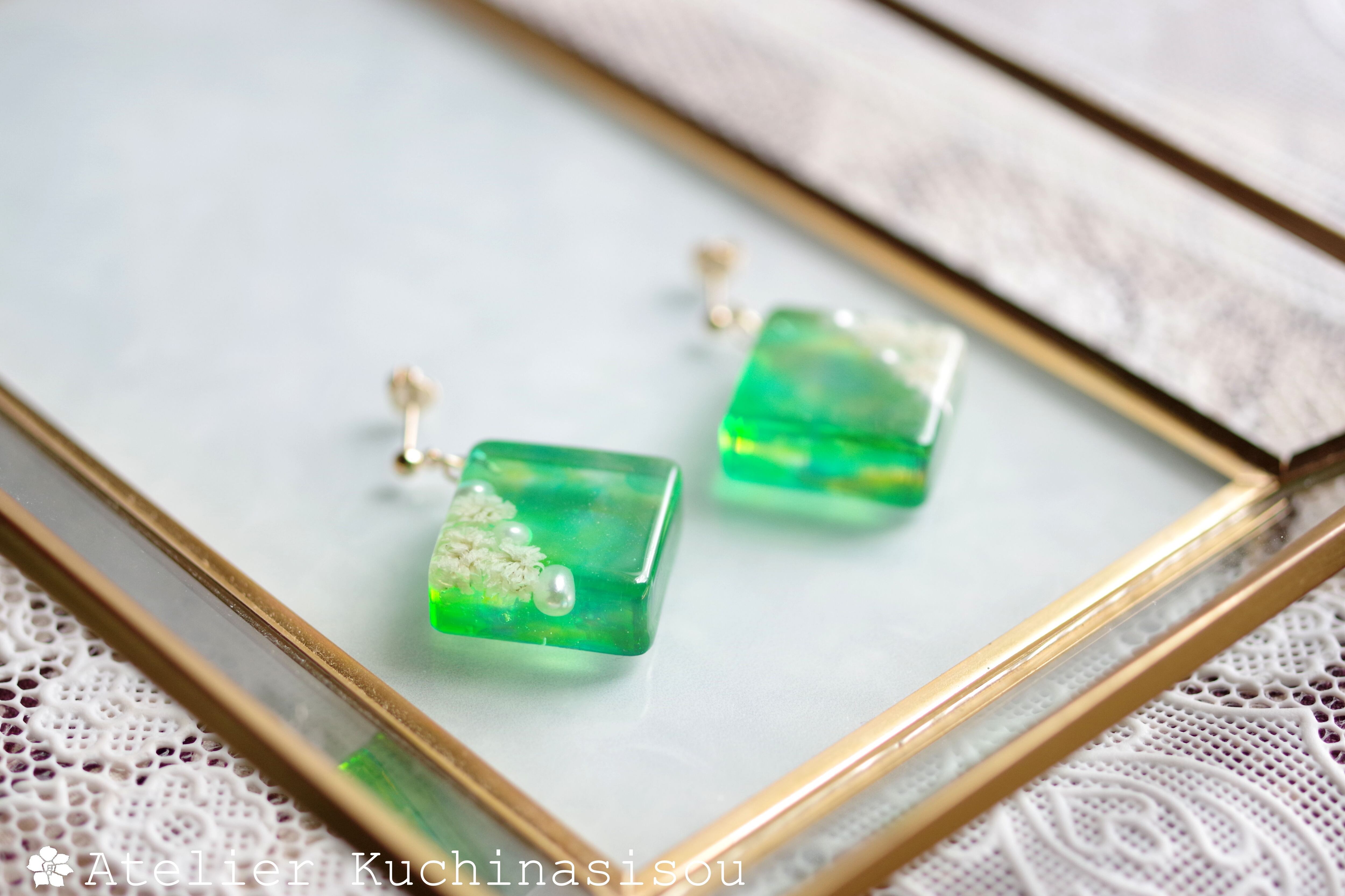 パールとお花をスクエア型のレジンに封じ込め、グリーンとオレンジで着色したピアス。