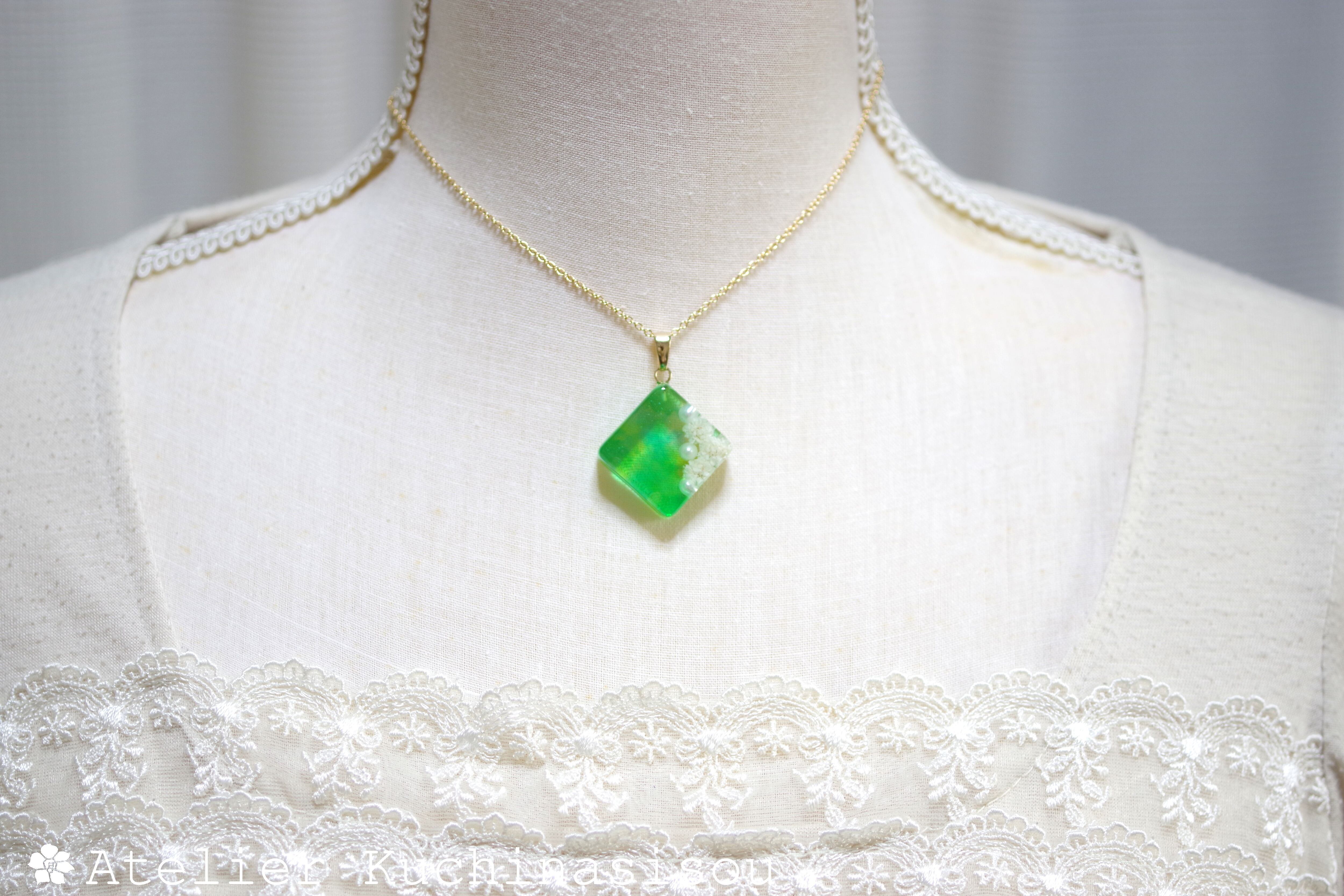 パールとお花をスクエア型のレジンに封じ込め、グリーンとオレンジで着色したペンダント。
