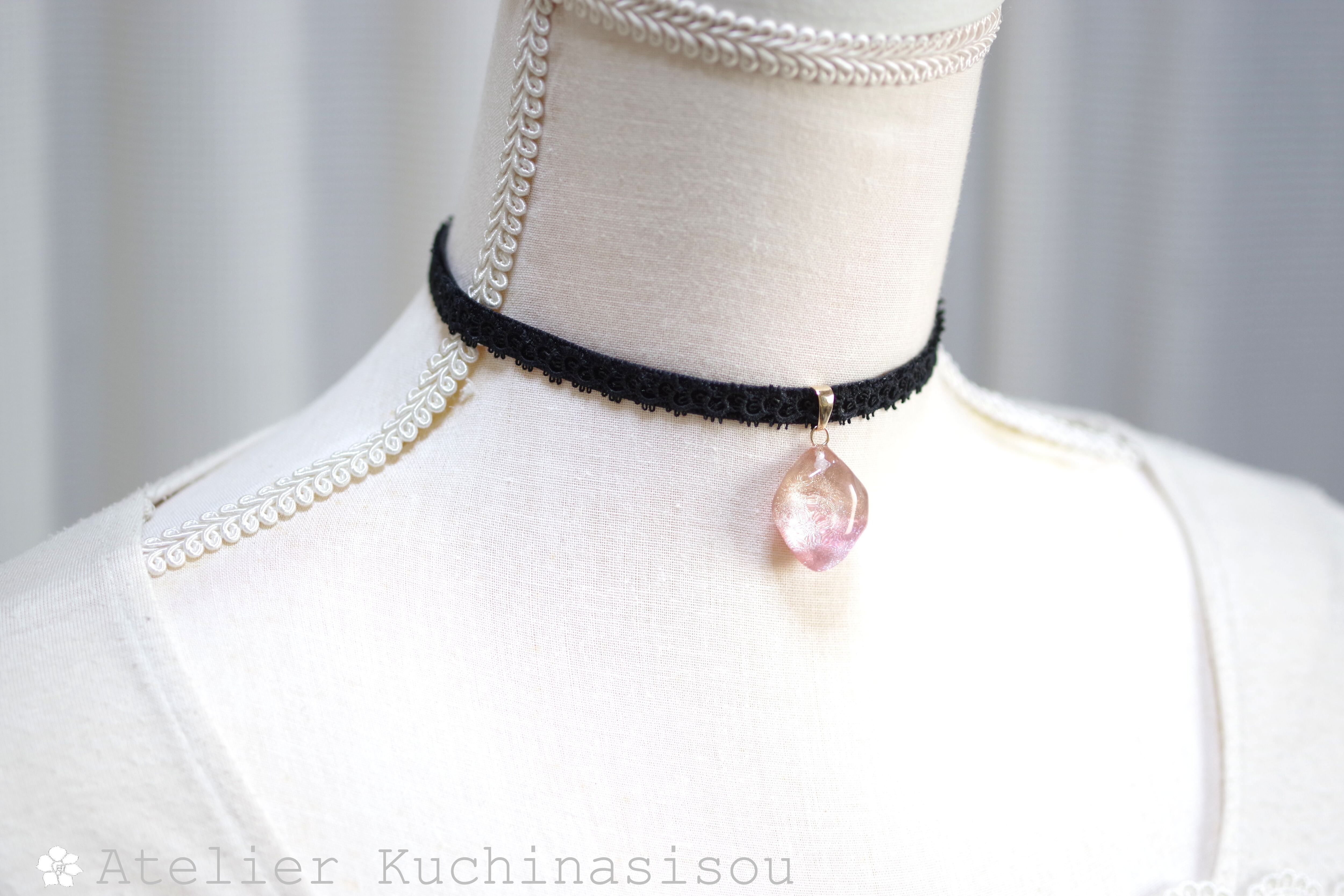 二種類のピンクが作る水面をのぞき込んだような、うららかなカラーリングのレジンを、ベルベットリボンにタティングレースで装飾を施したチョーカーに仕上げました。