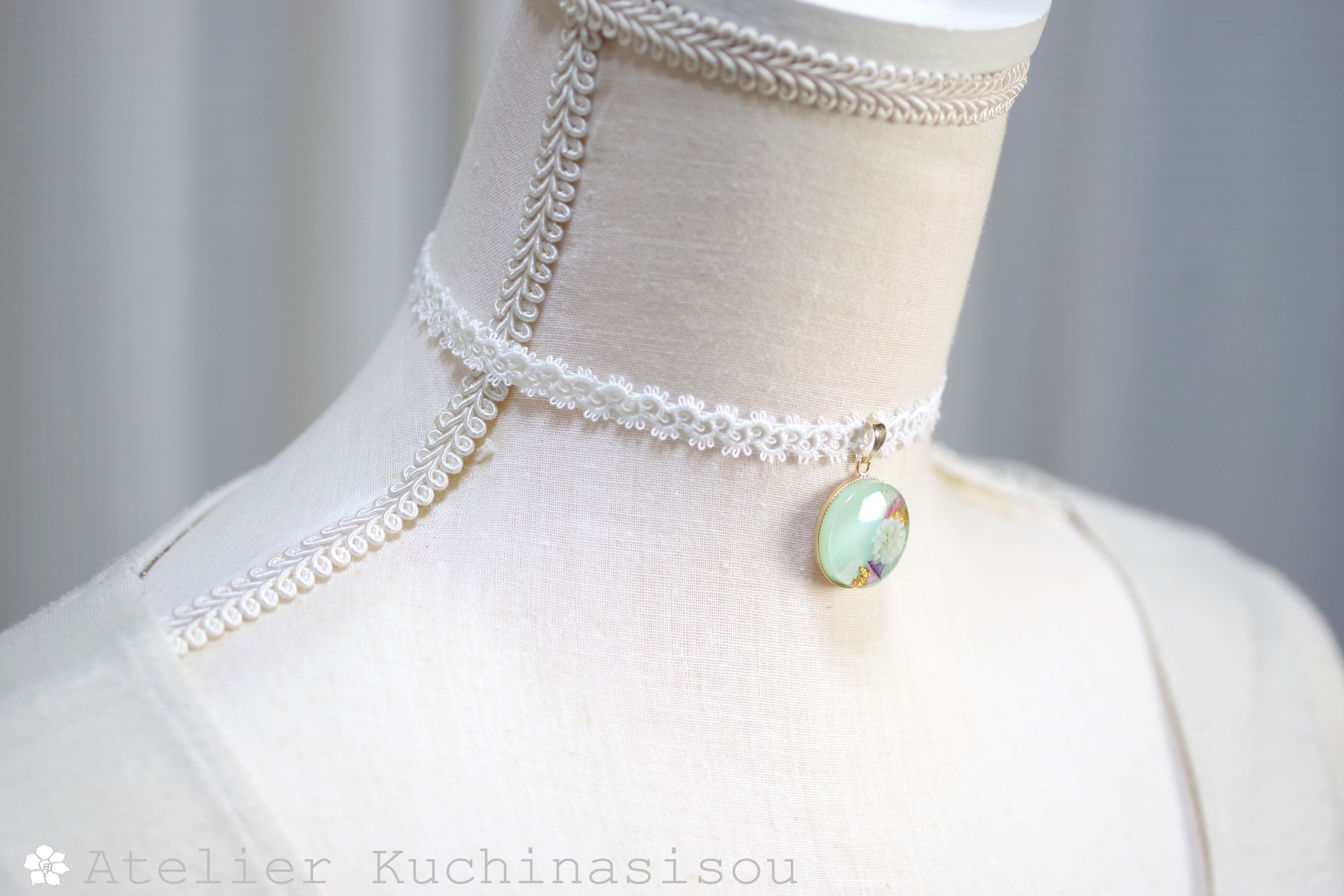 【受注製作】レジンアート ラウンドモチーフとタティングレースとサテンリボンのチョーカー〈ブーケ・グリーン〉