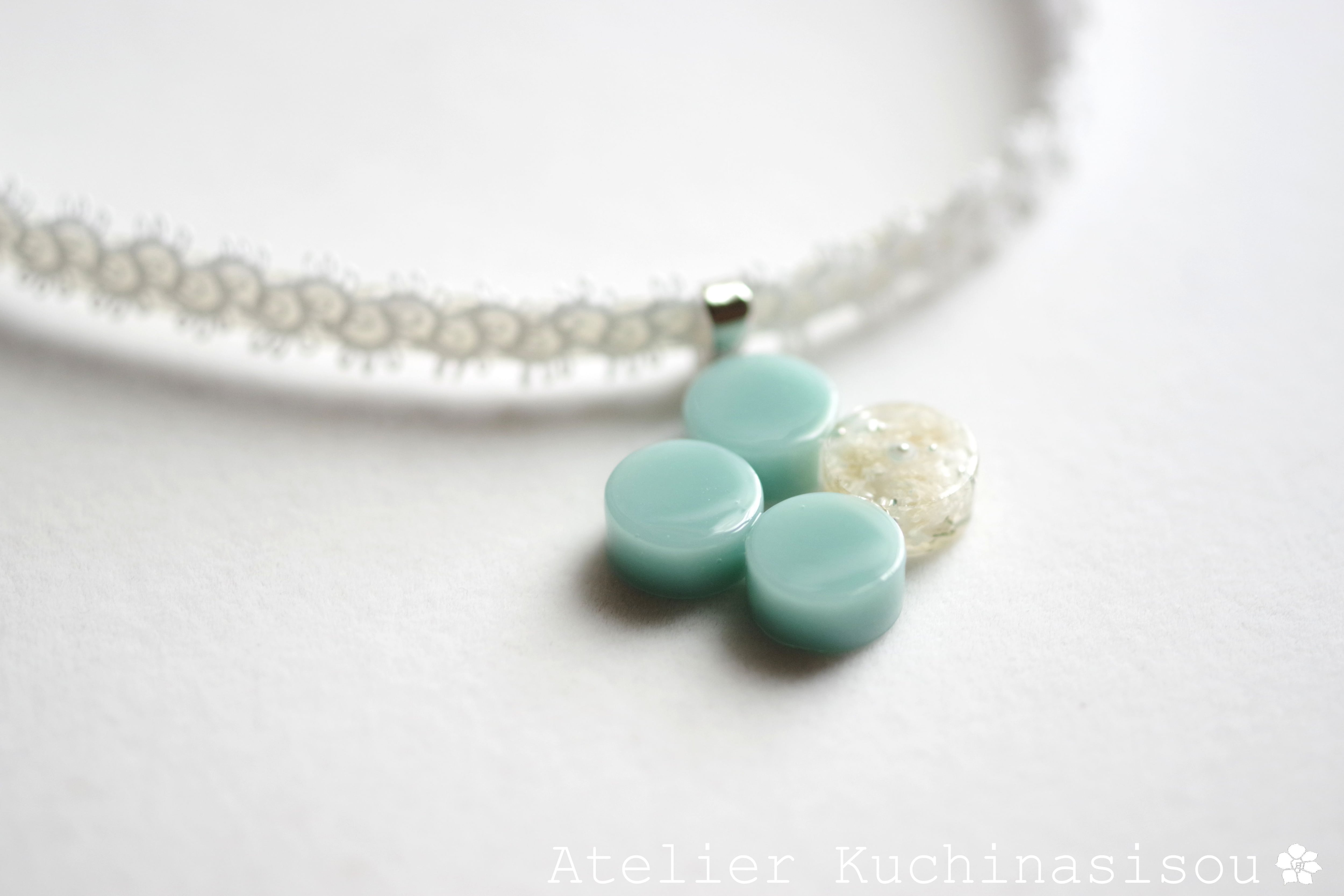 不透明なブルーの粒を三つ、そしてお花にパール、ブリオンを沈めた透明の粒を一つアクセントに連ねた可憐なレジンを、サテンリボンにタティングレースで装飾を施したチョーカーに仕上げました。