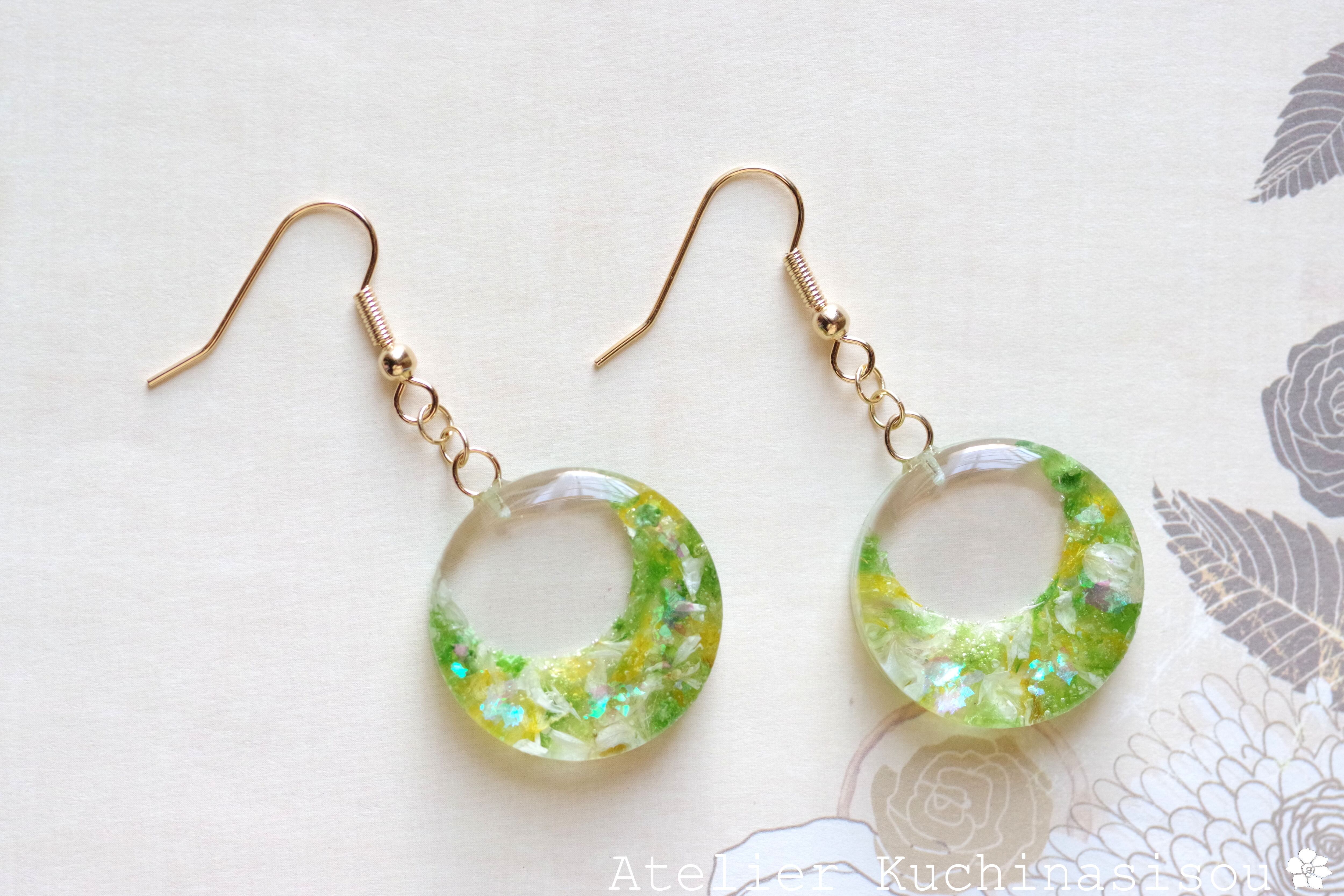 黄色と緑のお花の花びらを敷き詰め、緑のラメを乗せたピアス。
