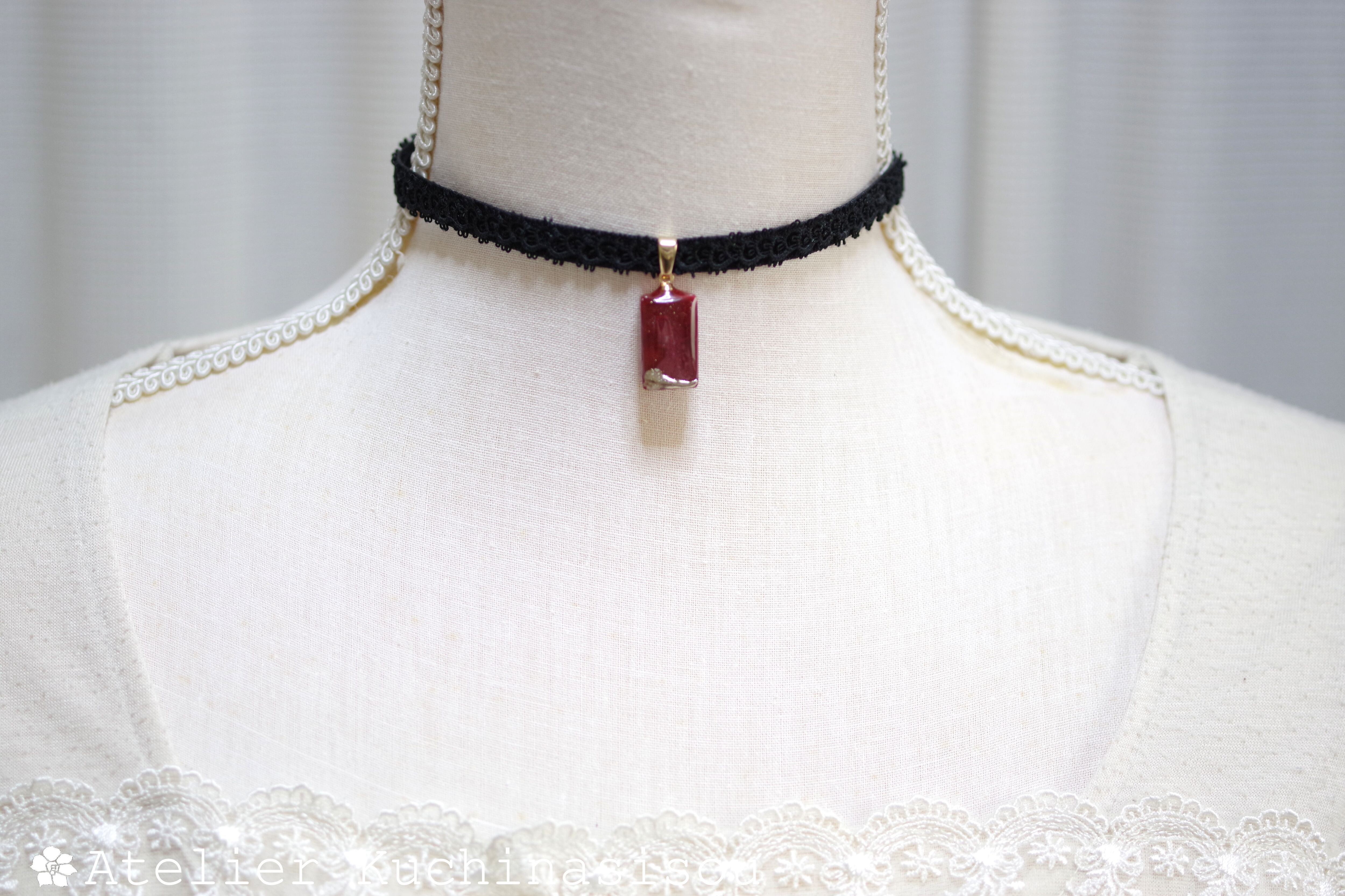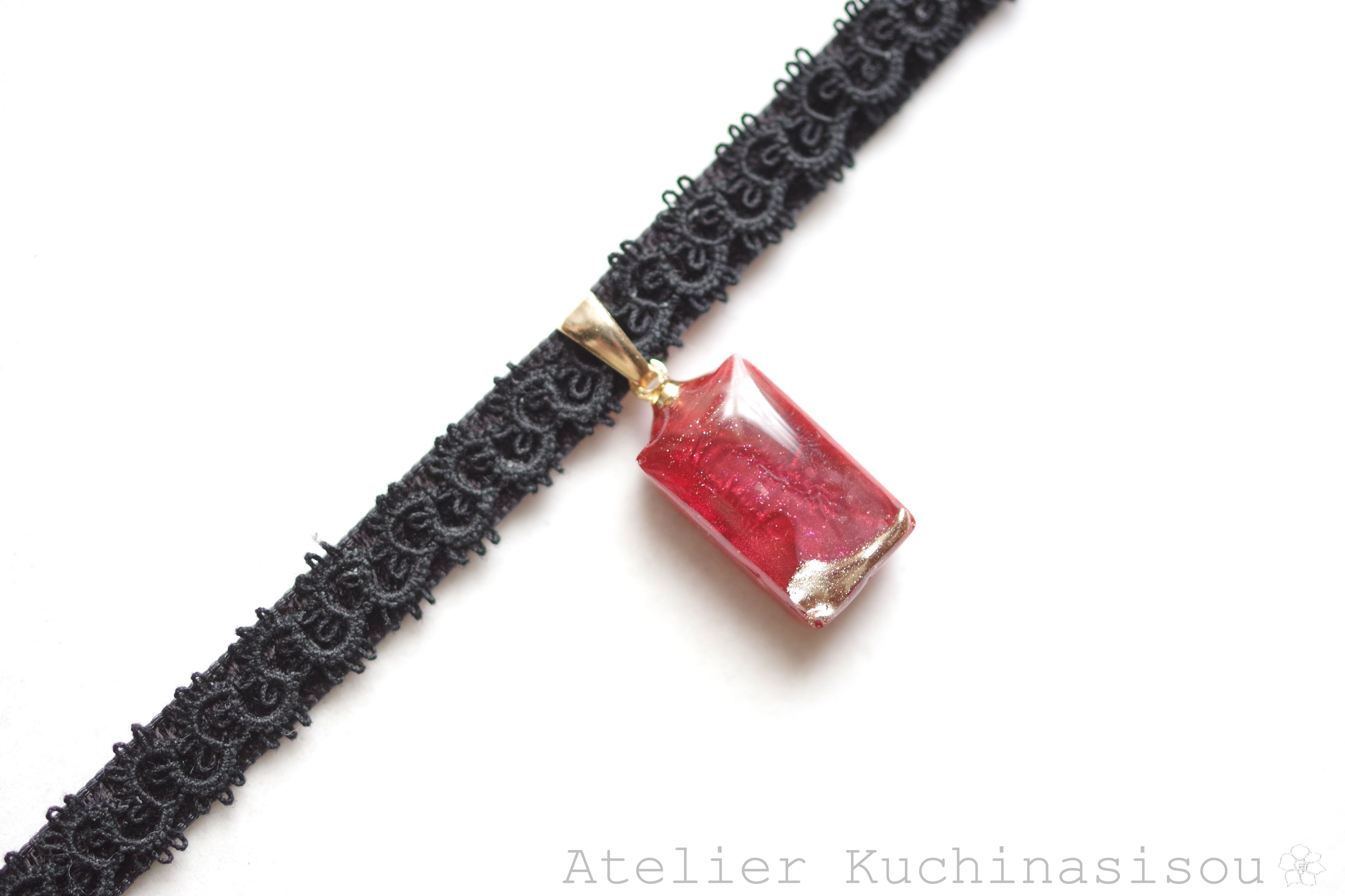 鮮やかな深紅に微細なラメが輝くうっとりするほど美しいレジンを、ベルベットリボンにタティングレースで装飾を施したチョーカーに仕上げました。