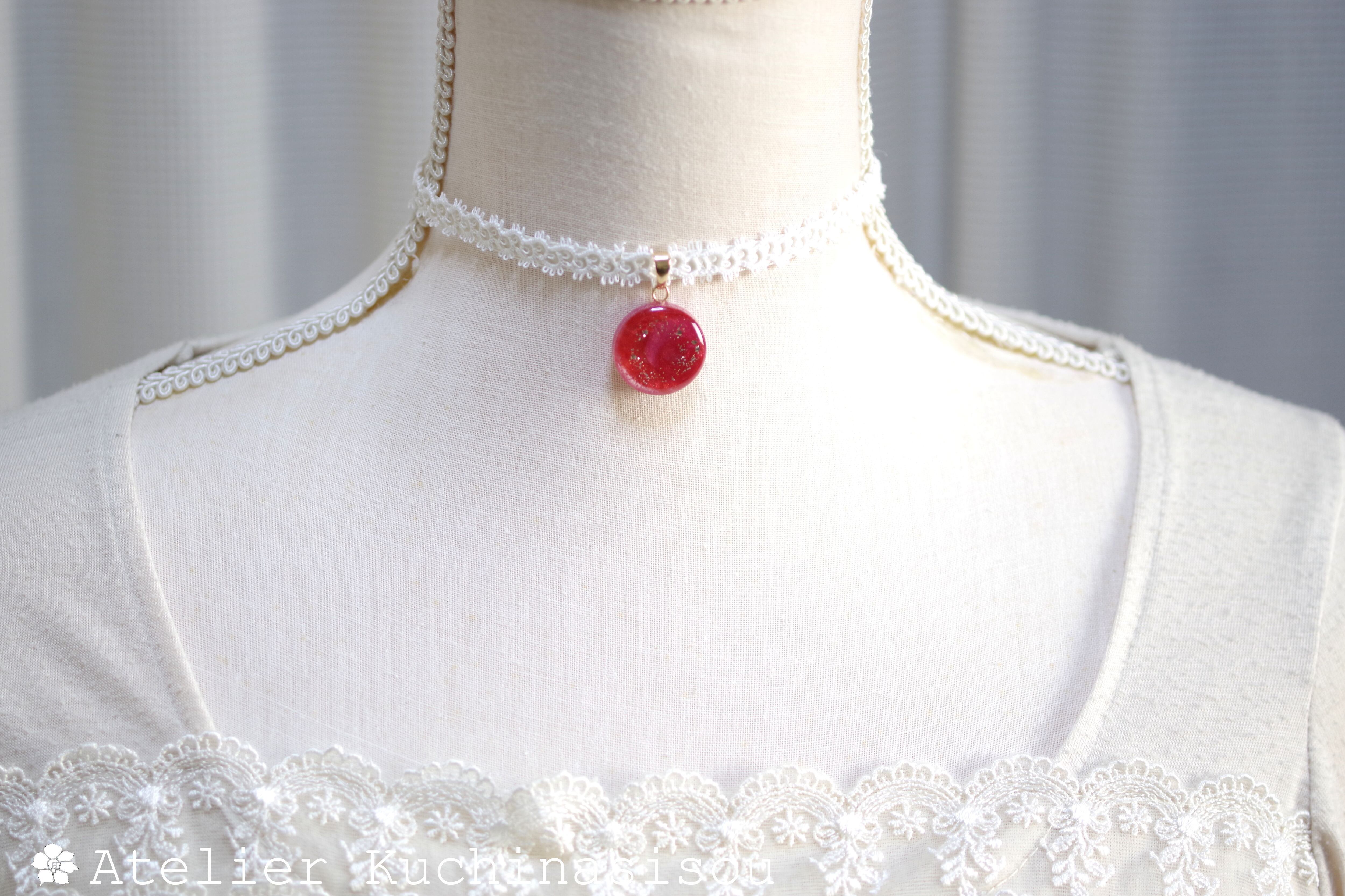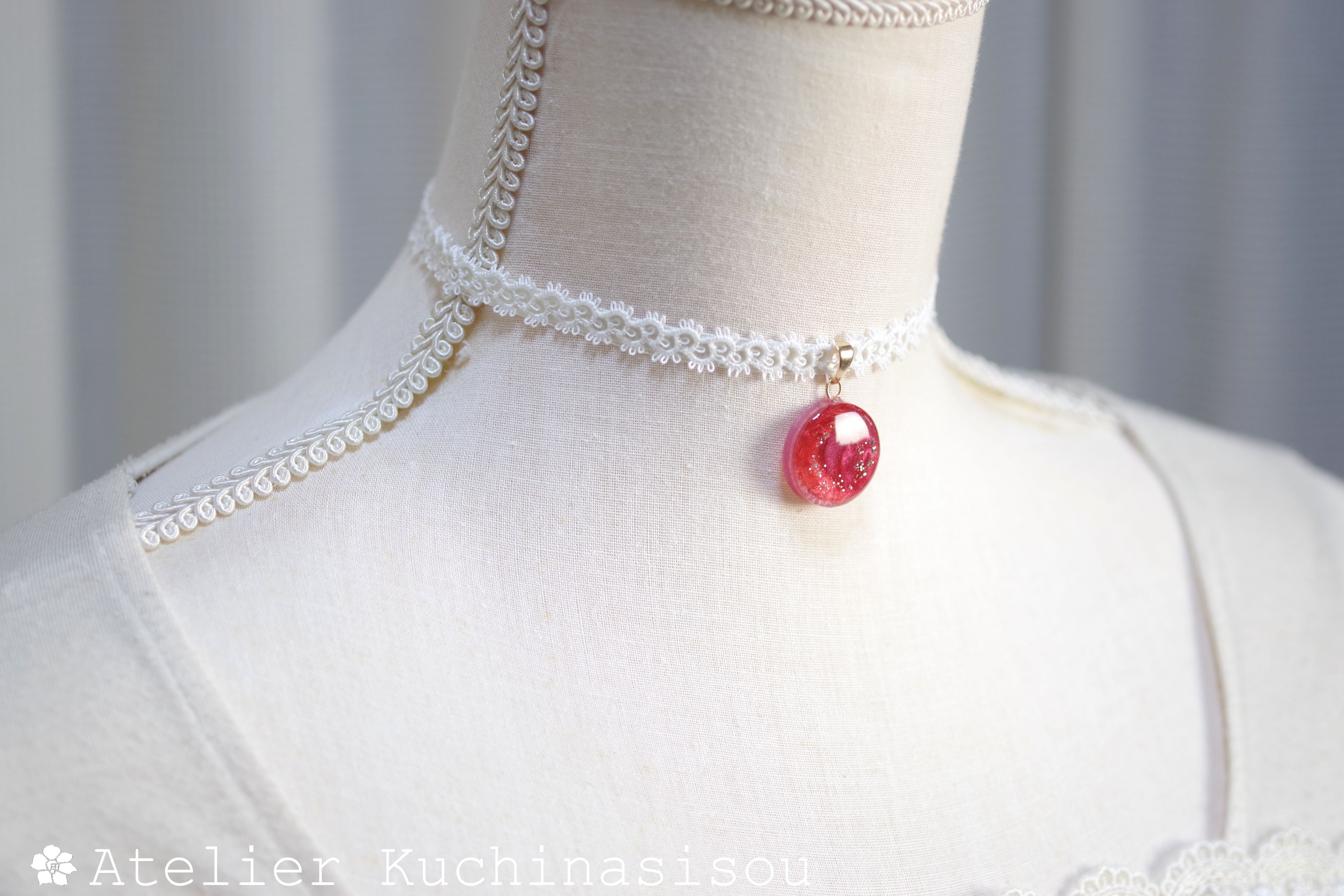 数種類の赤とピンクが描くマーブル模様が、まるで真っ赤な薔薇の咲く花園に迷い込んだような気分を抱かせるレジンを、サテンリボンにタティングレースで装飾を施したチョーカーに仕上げました。