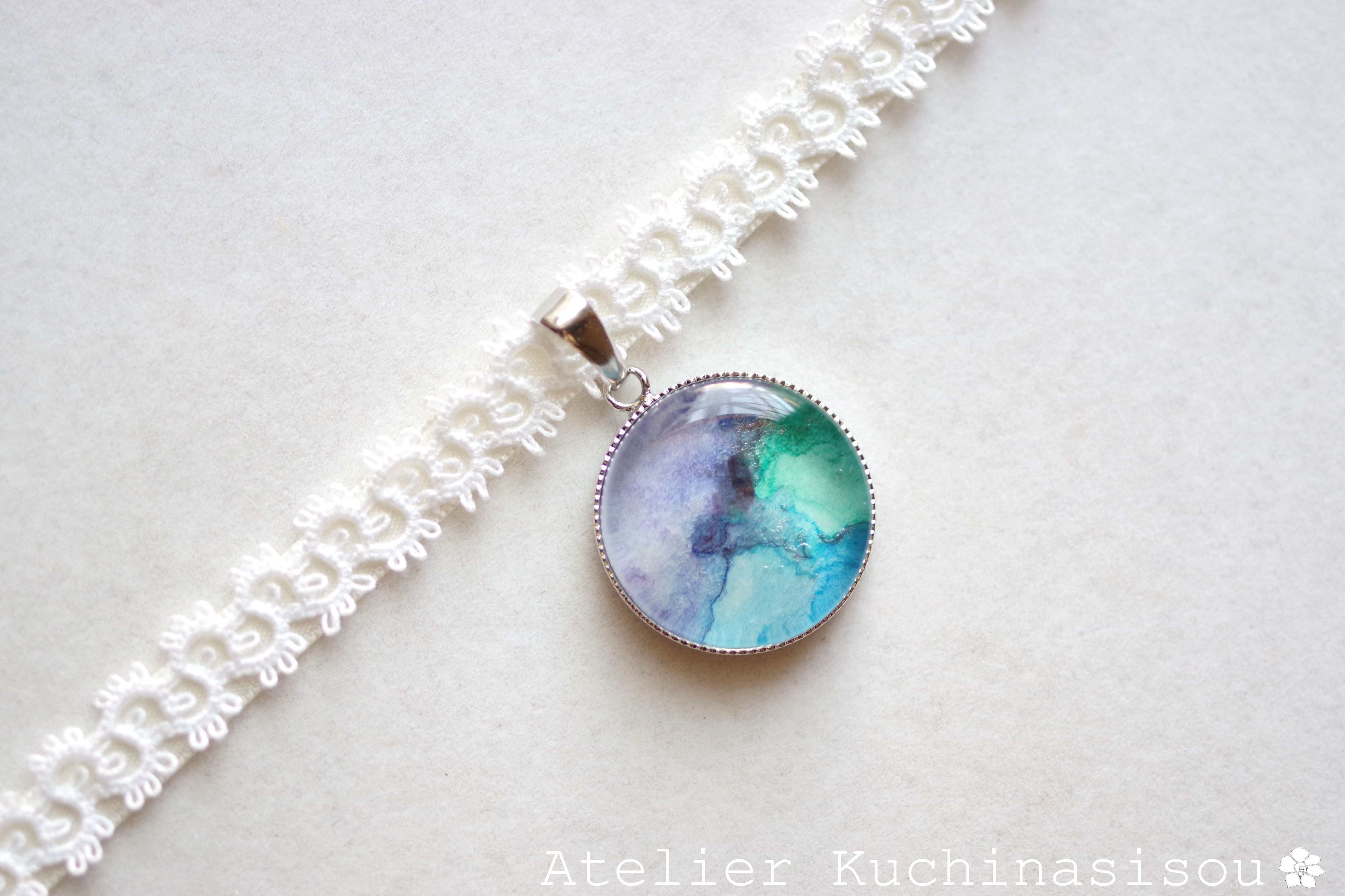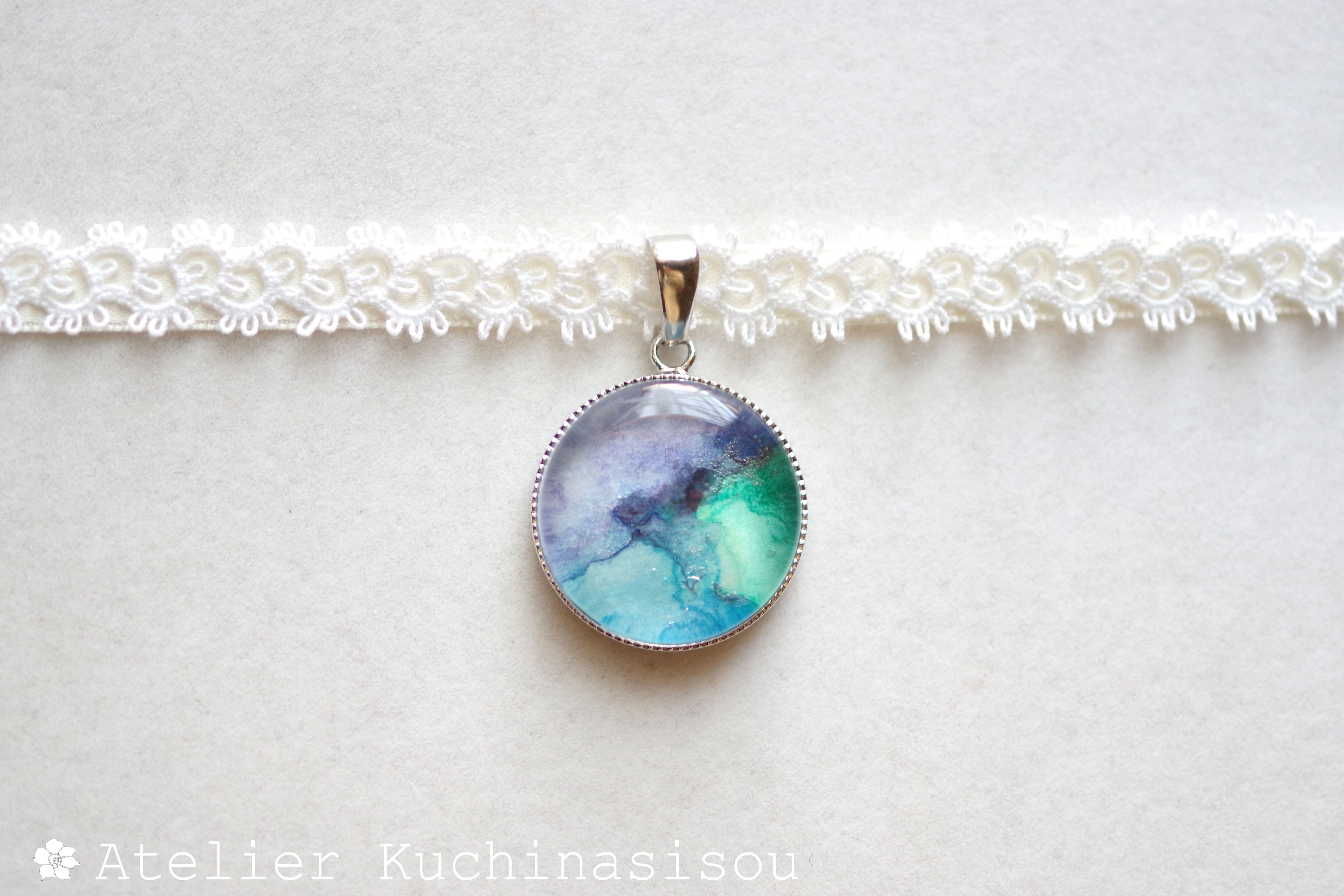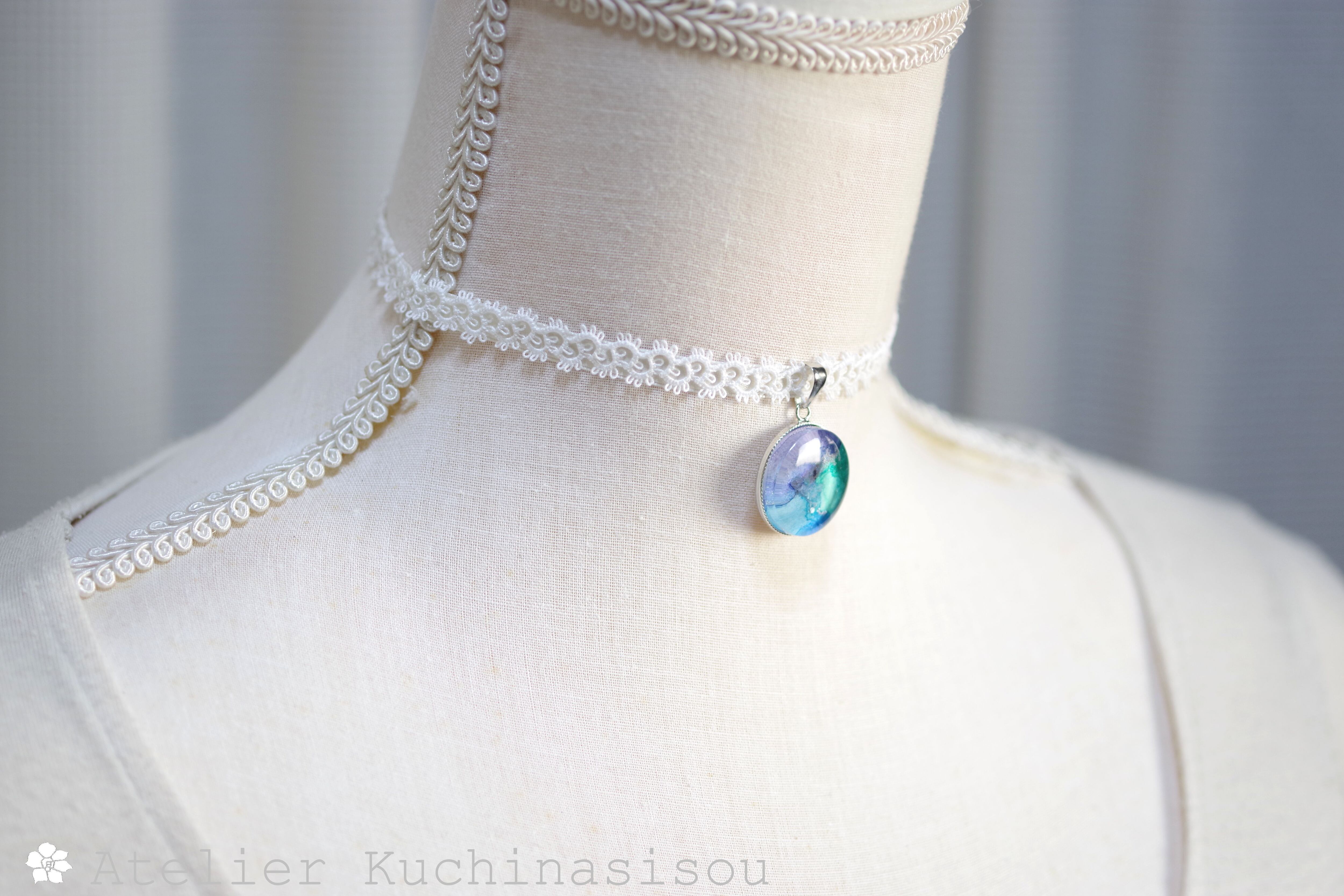 水彩絵の具で描いたような滲んだ紫と緑、青が美しい模様を描いてるレジンを、サテンリボンにタティングレースで装飾を施したチョーカーに仕上げました。