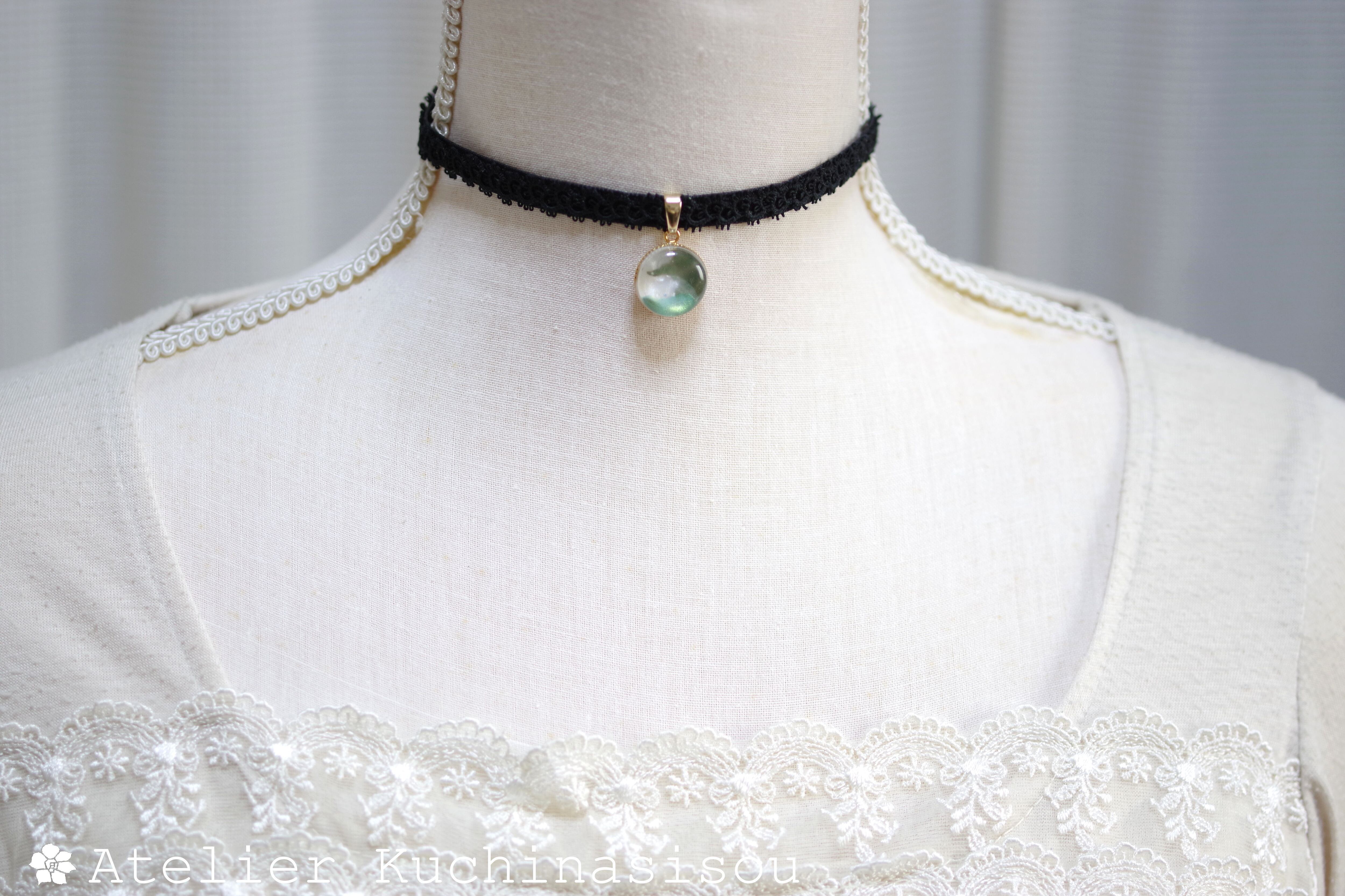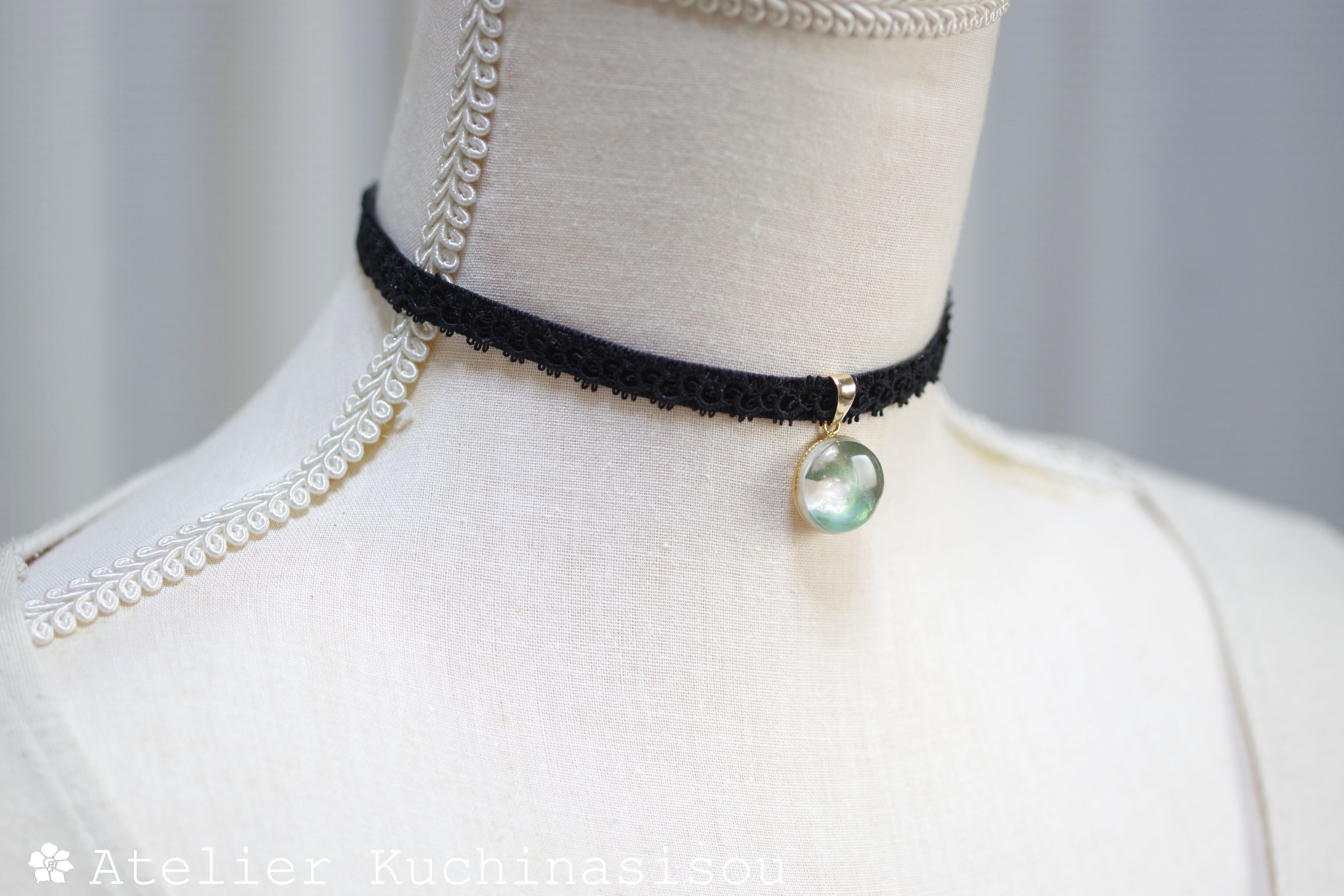 優しい緑色が、まるで午後に吹く風のように爽やかなレジンを、ベルベットリボンにタティングレースで装飾を施したチョーカーに仕上げました。
