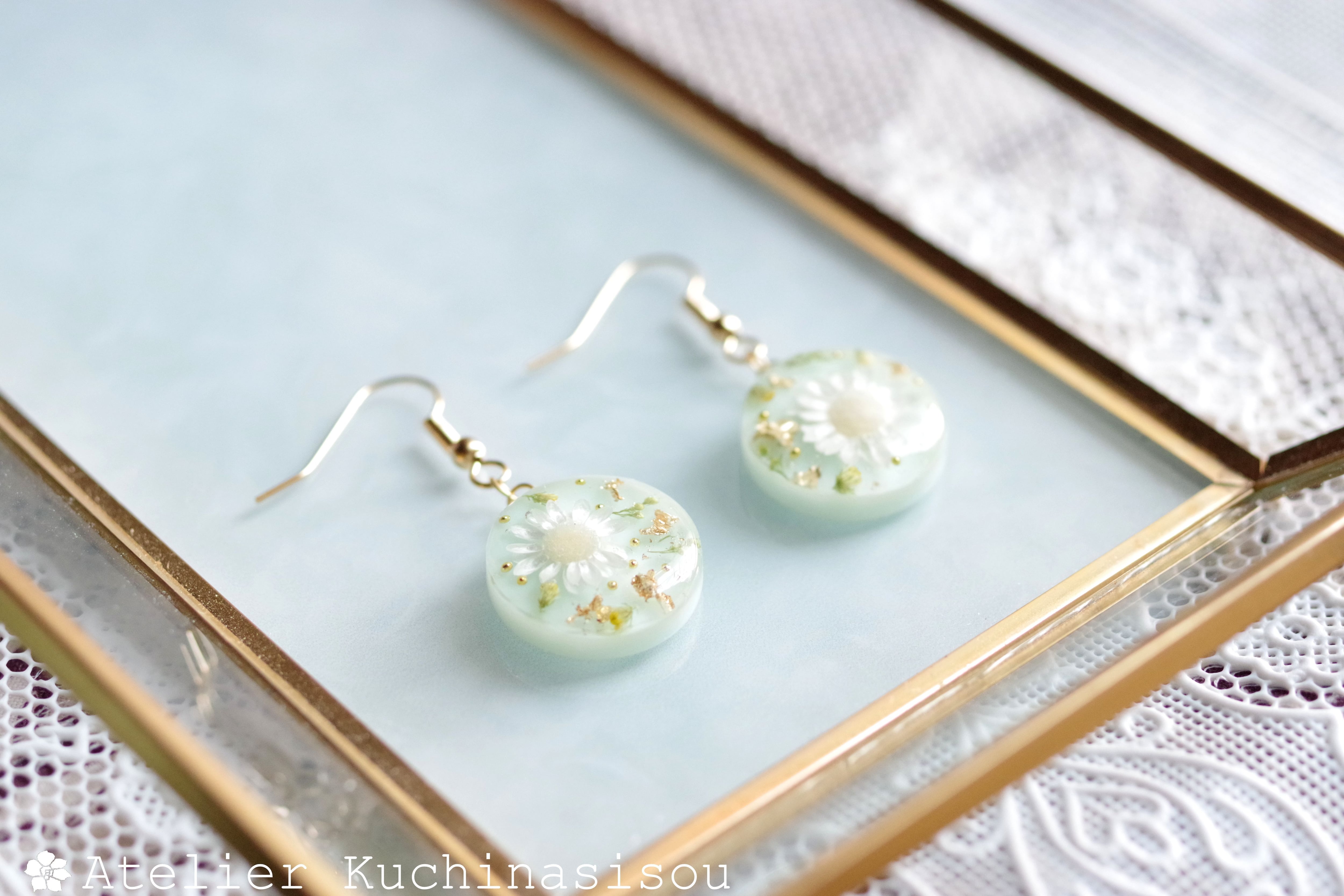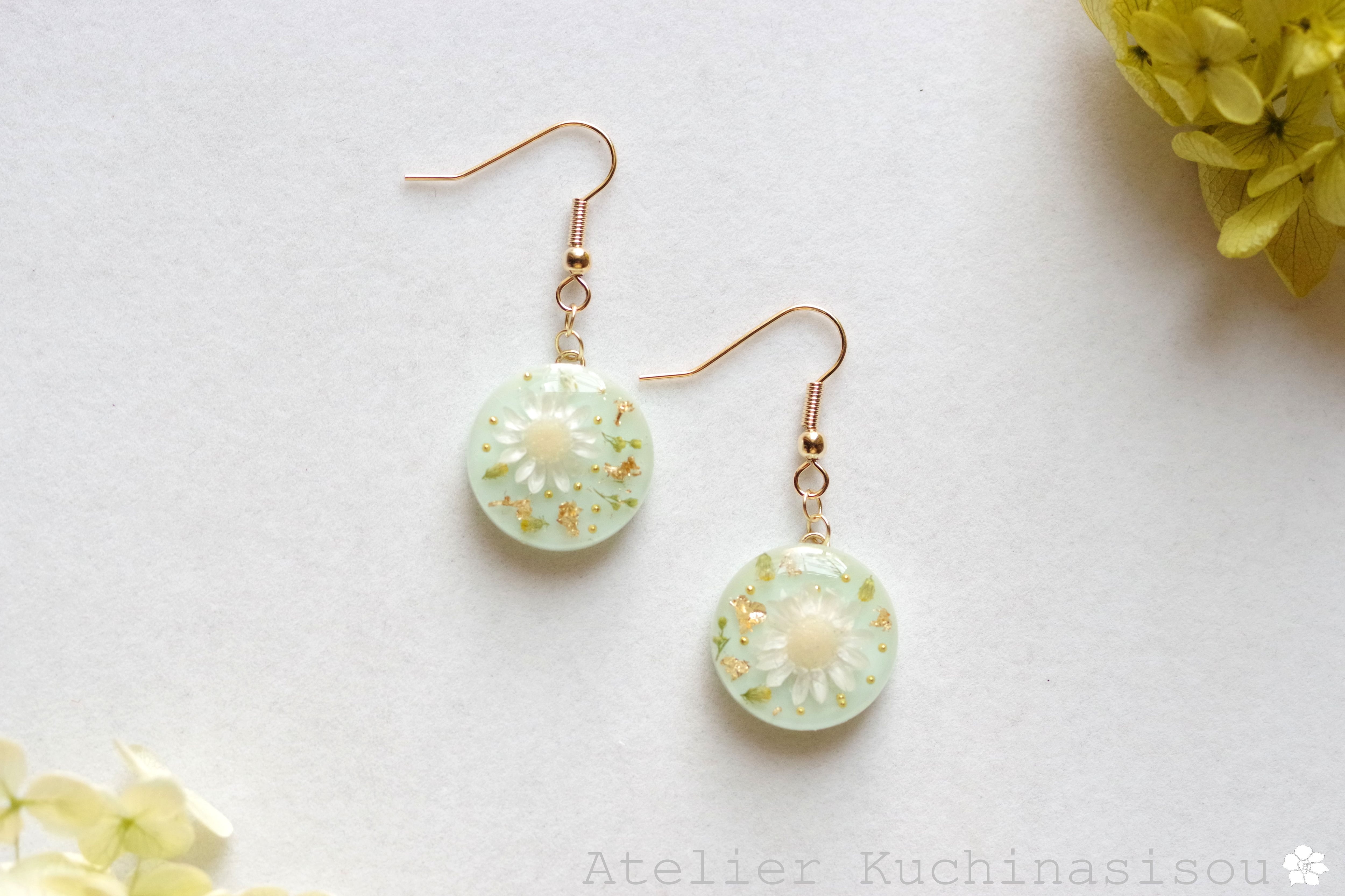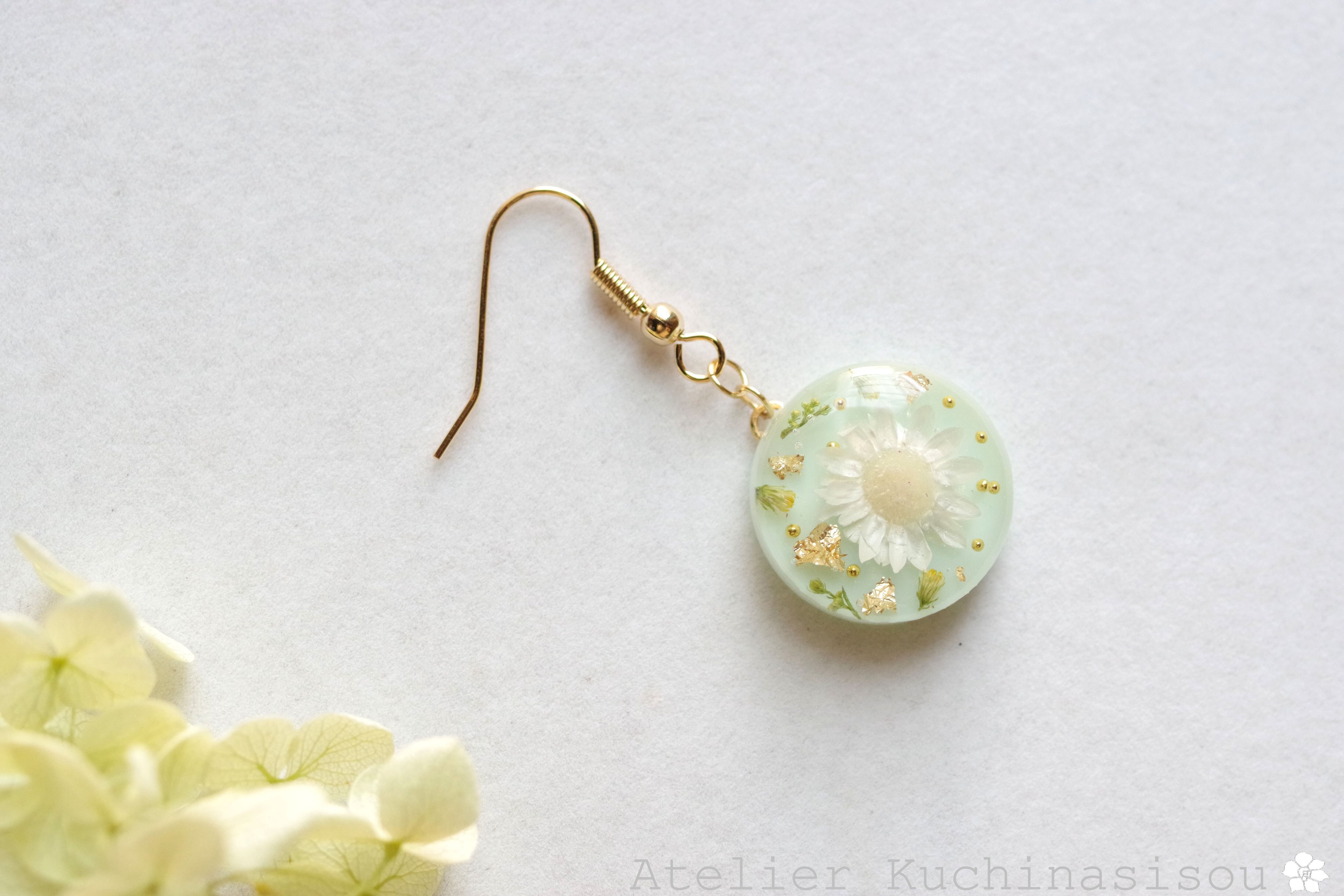優しいグリーンの背景に大きなお花を一輪と、緑のつぼみ、金箔とブリオンを散らした、華やかなピアスです。
