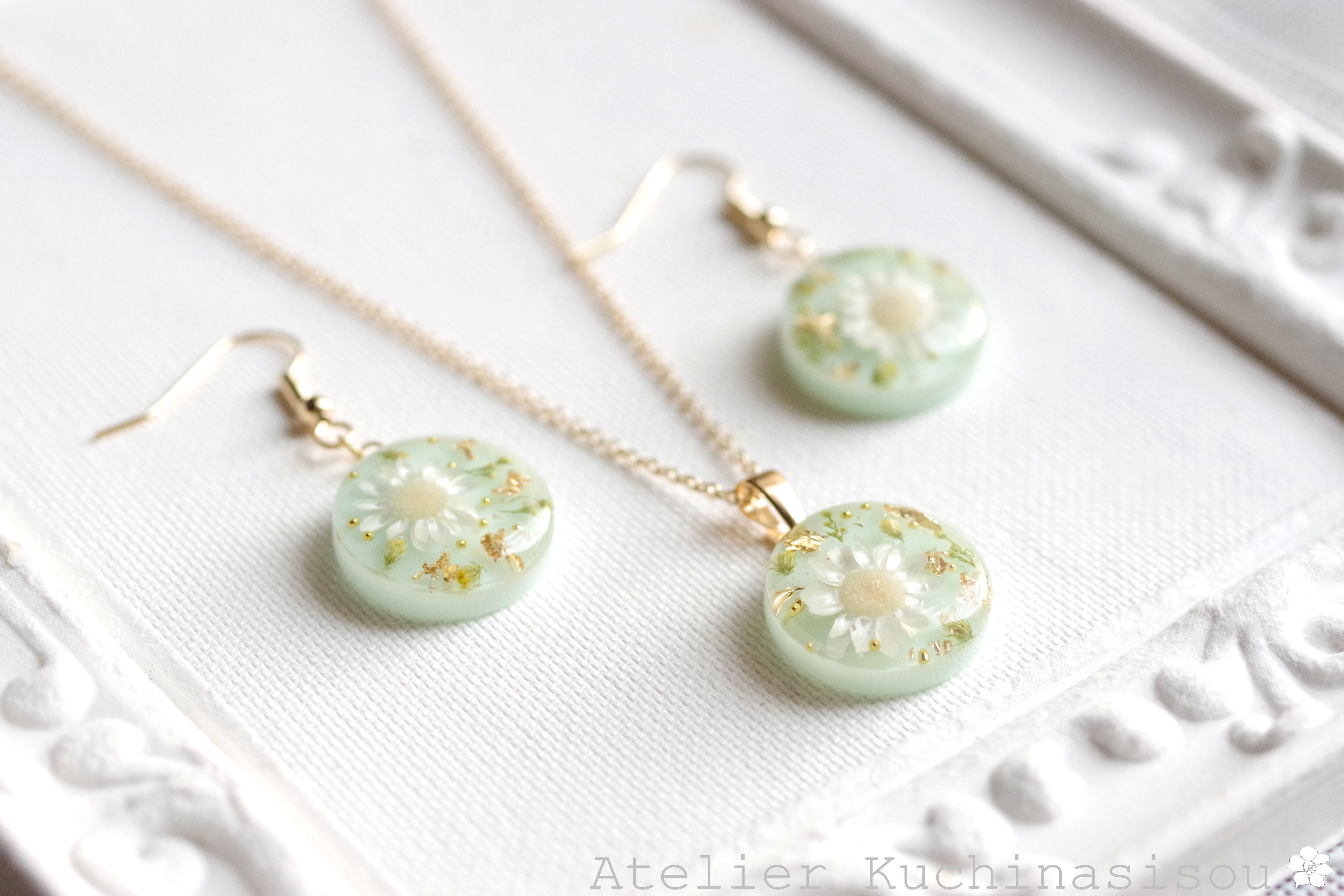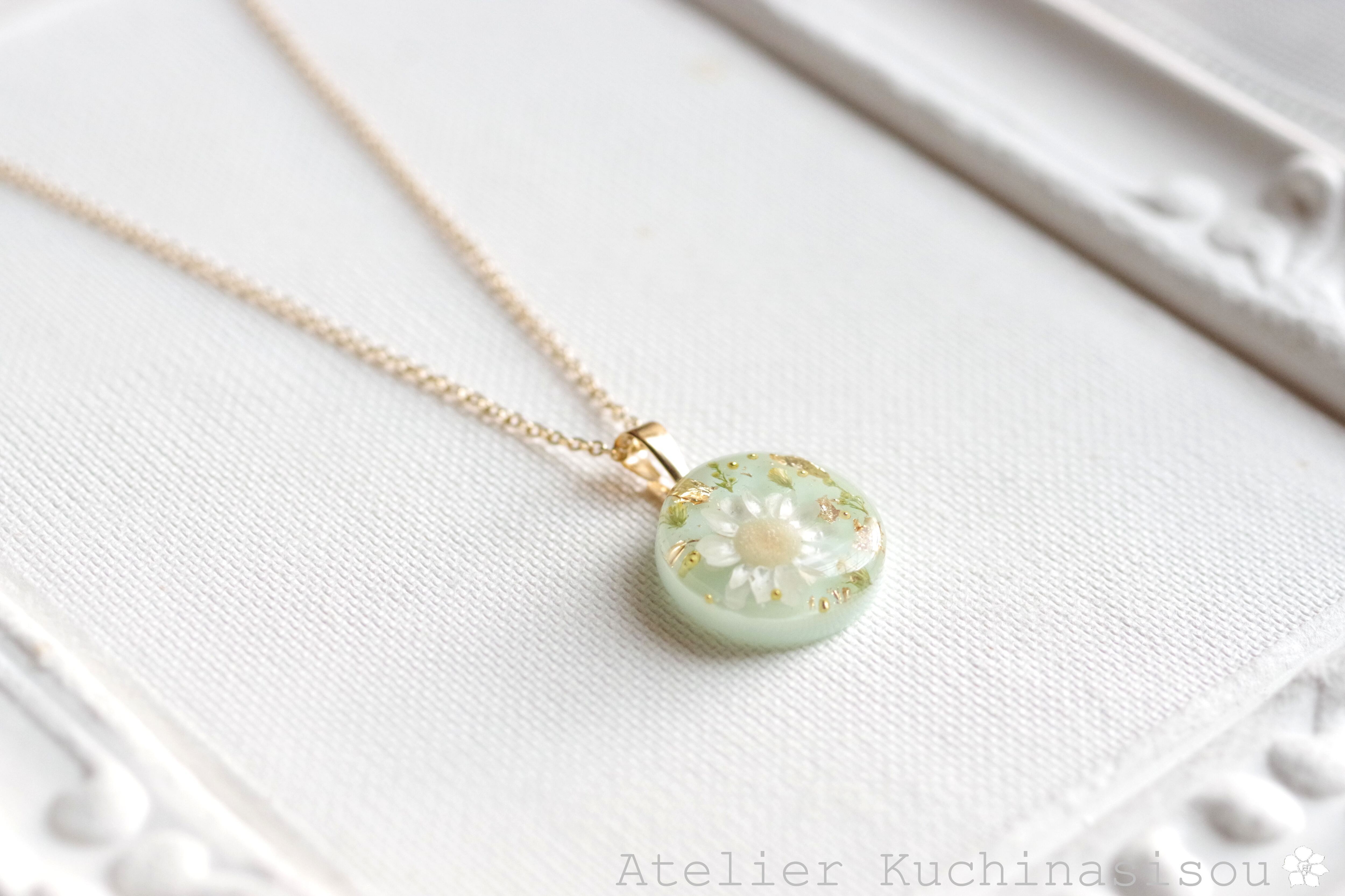 優しいグリーンの背景に大きなお花を一輪と、緑のつぼみ、金箔とブリオンを散らした、華やかなペンダントです。