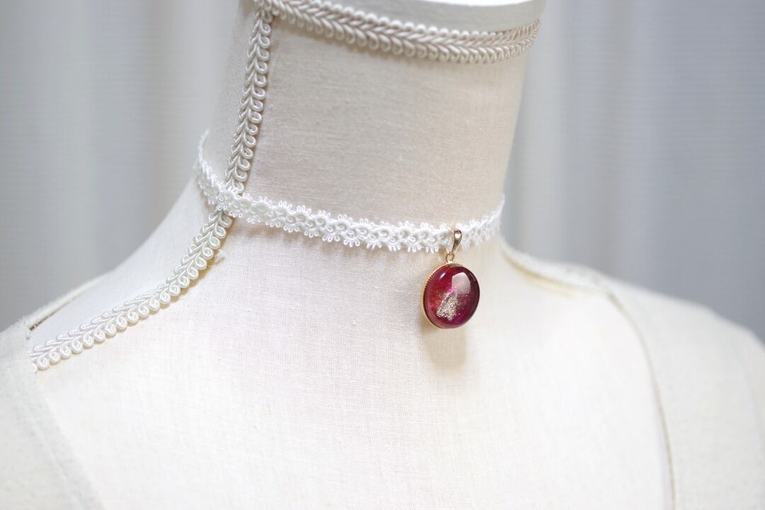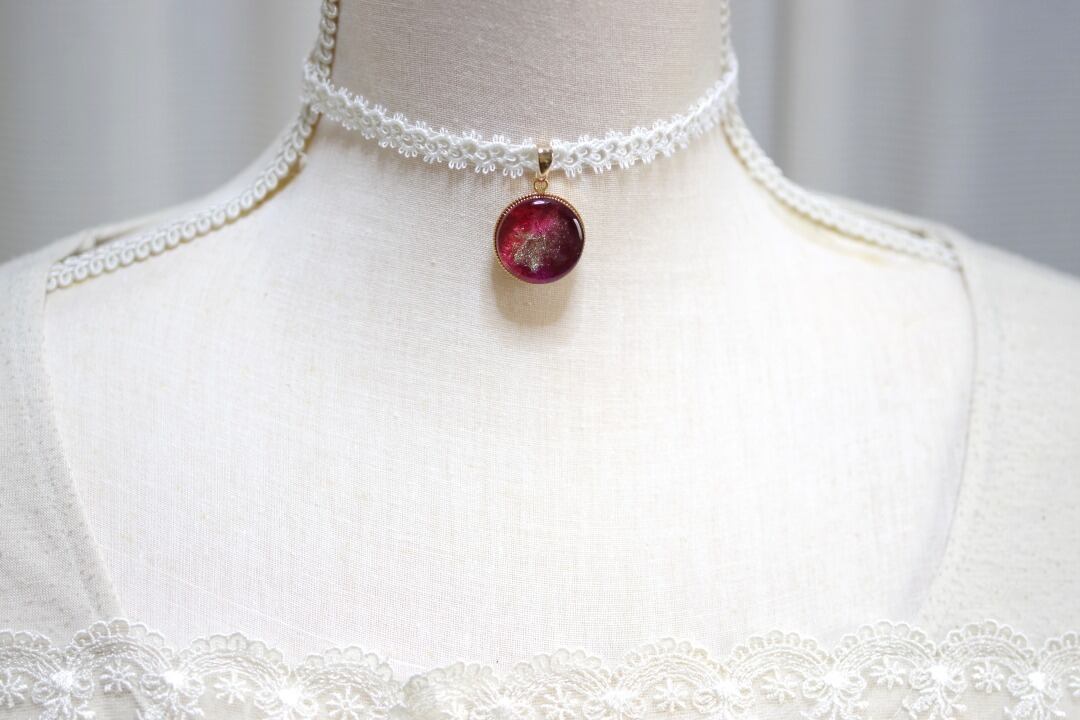 【受注製作】レジンアート ラウンドモチーフとタティングレースとサテンリボンのチョーカー〈紅薔薇〉