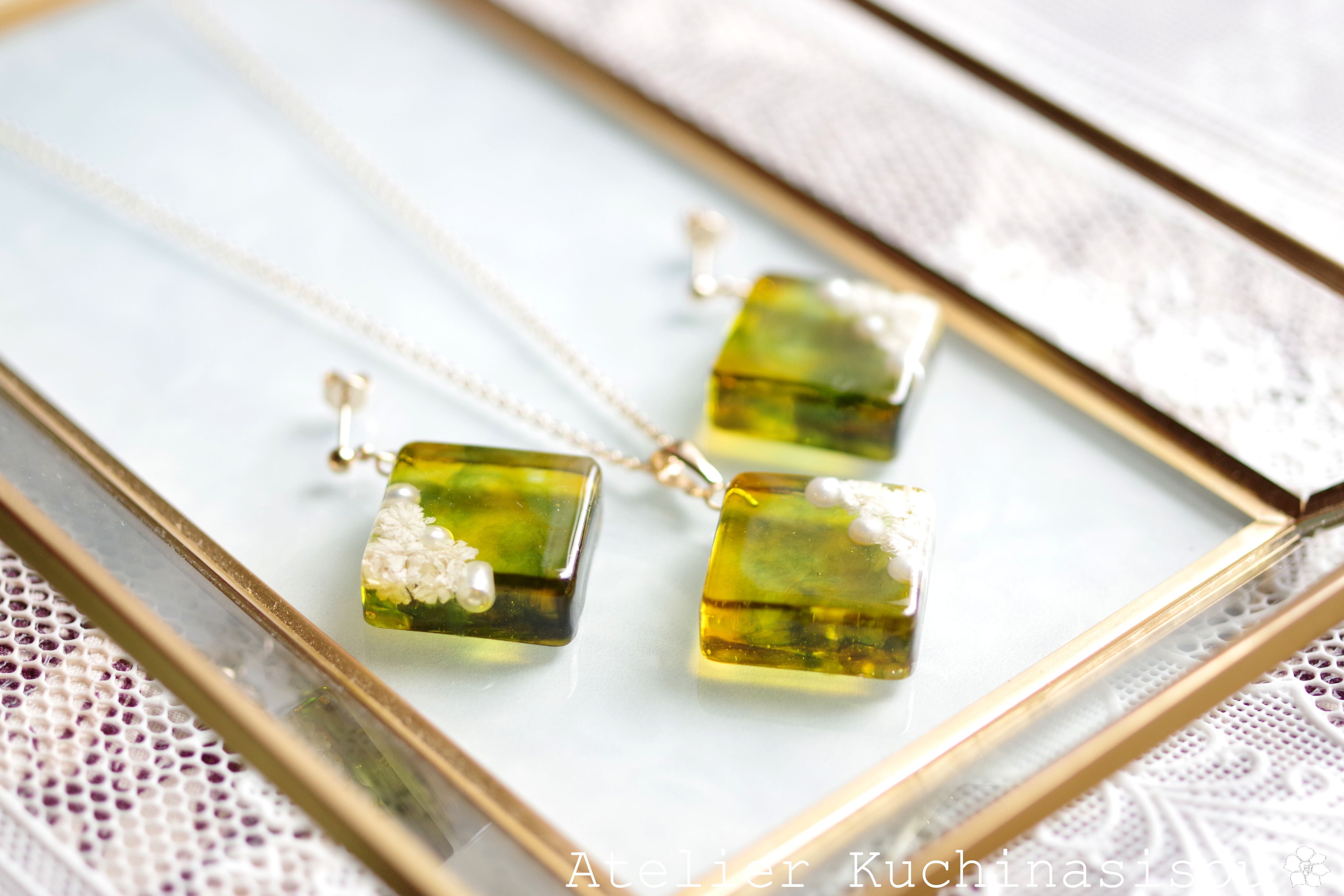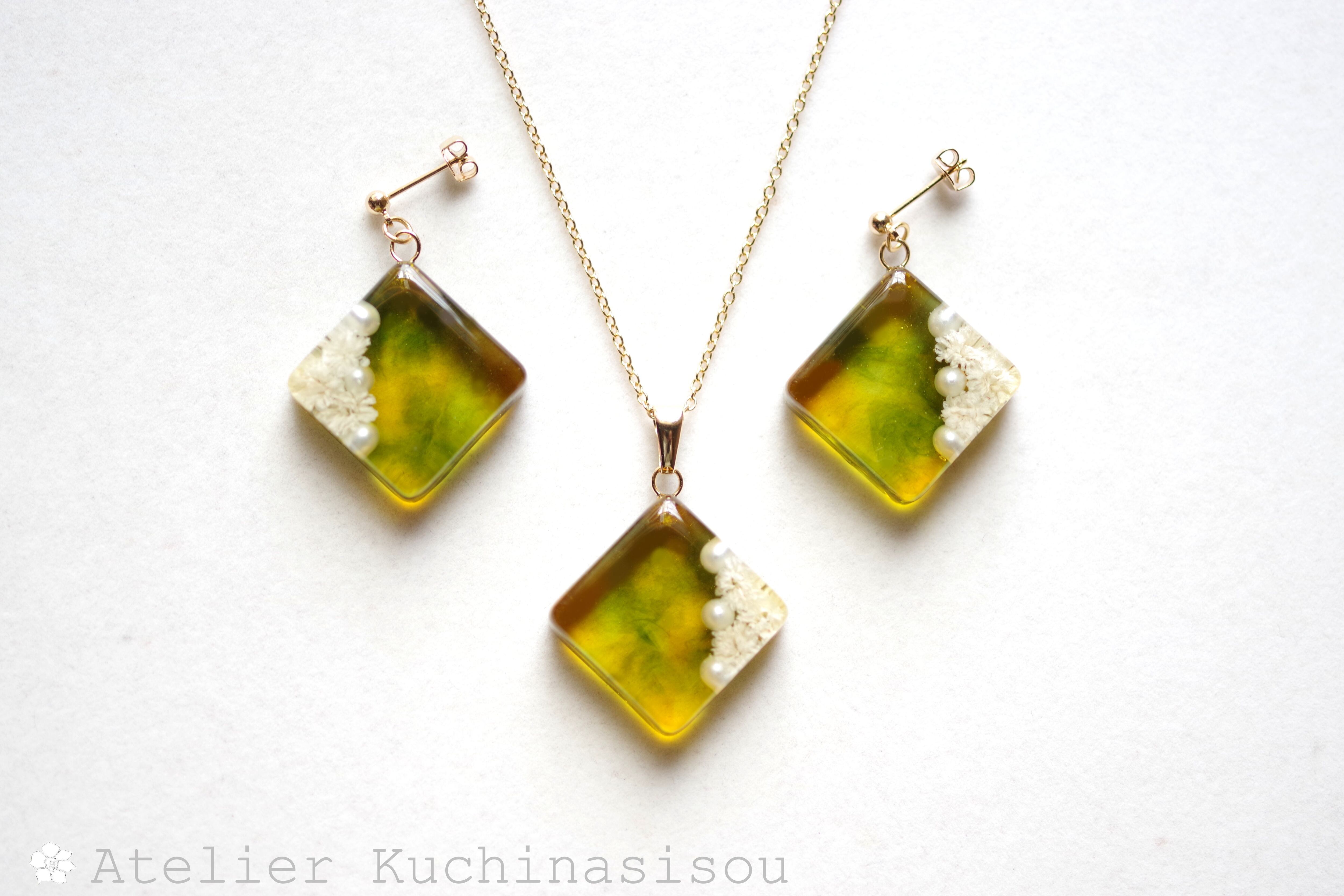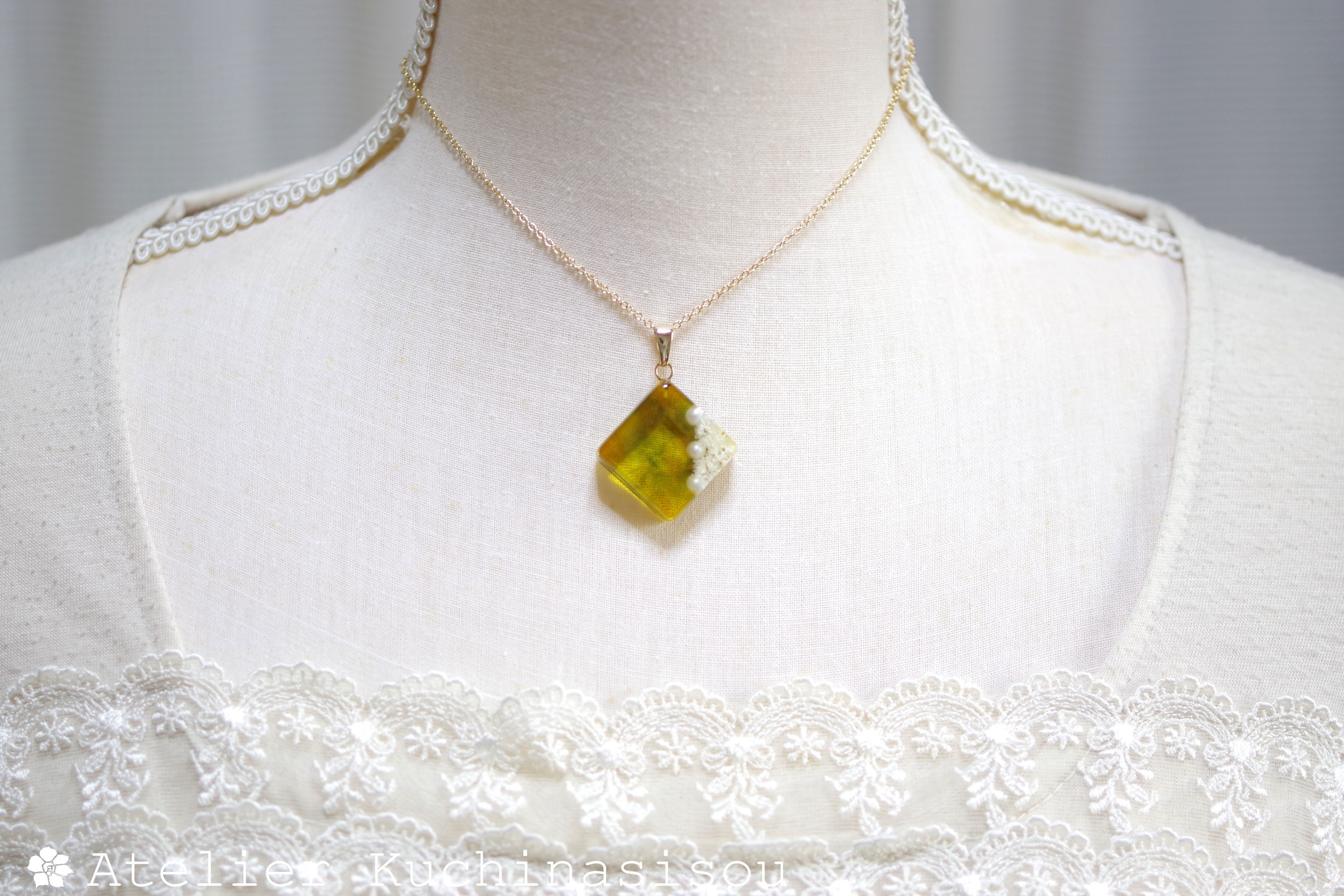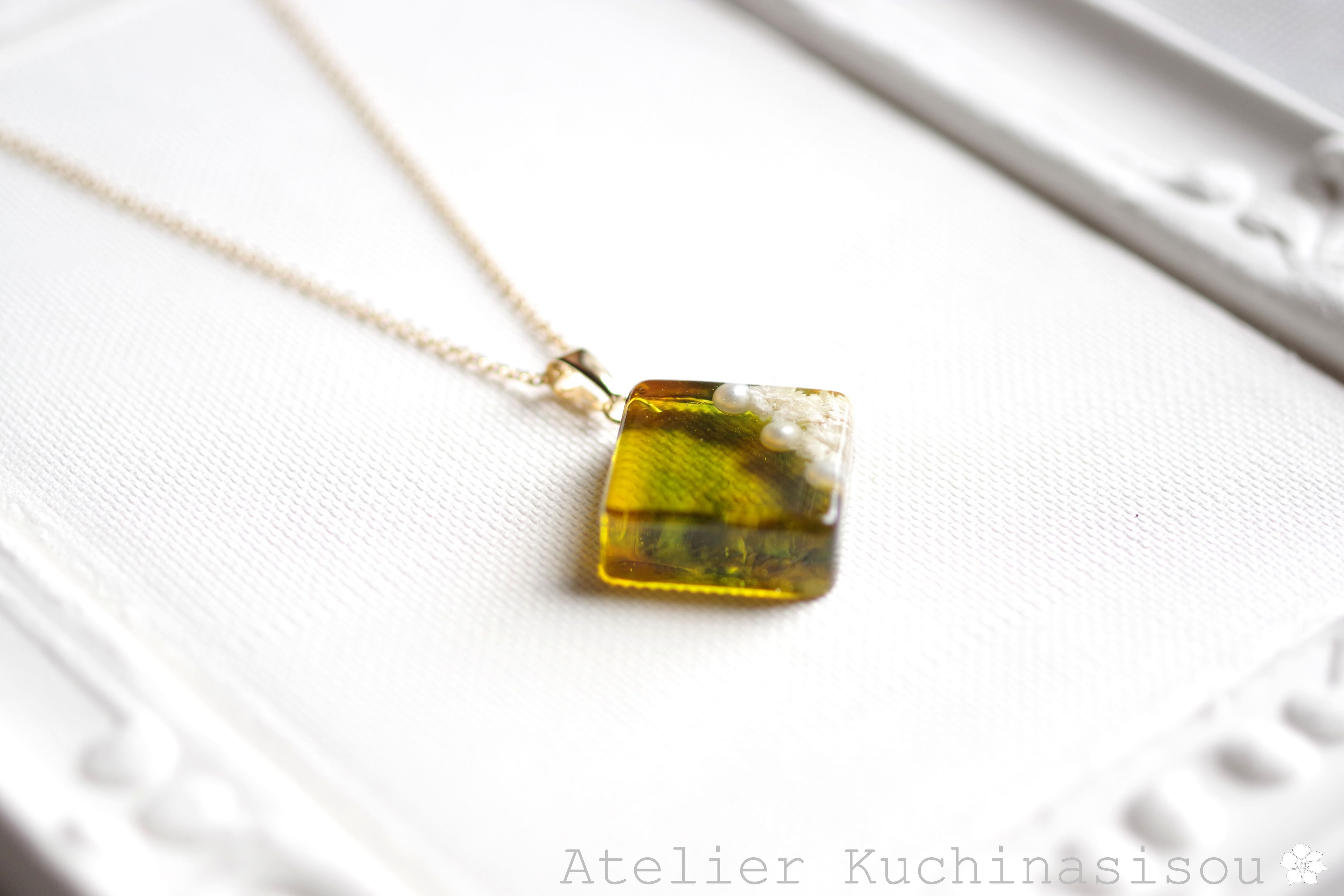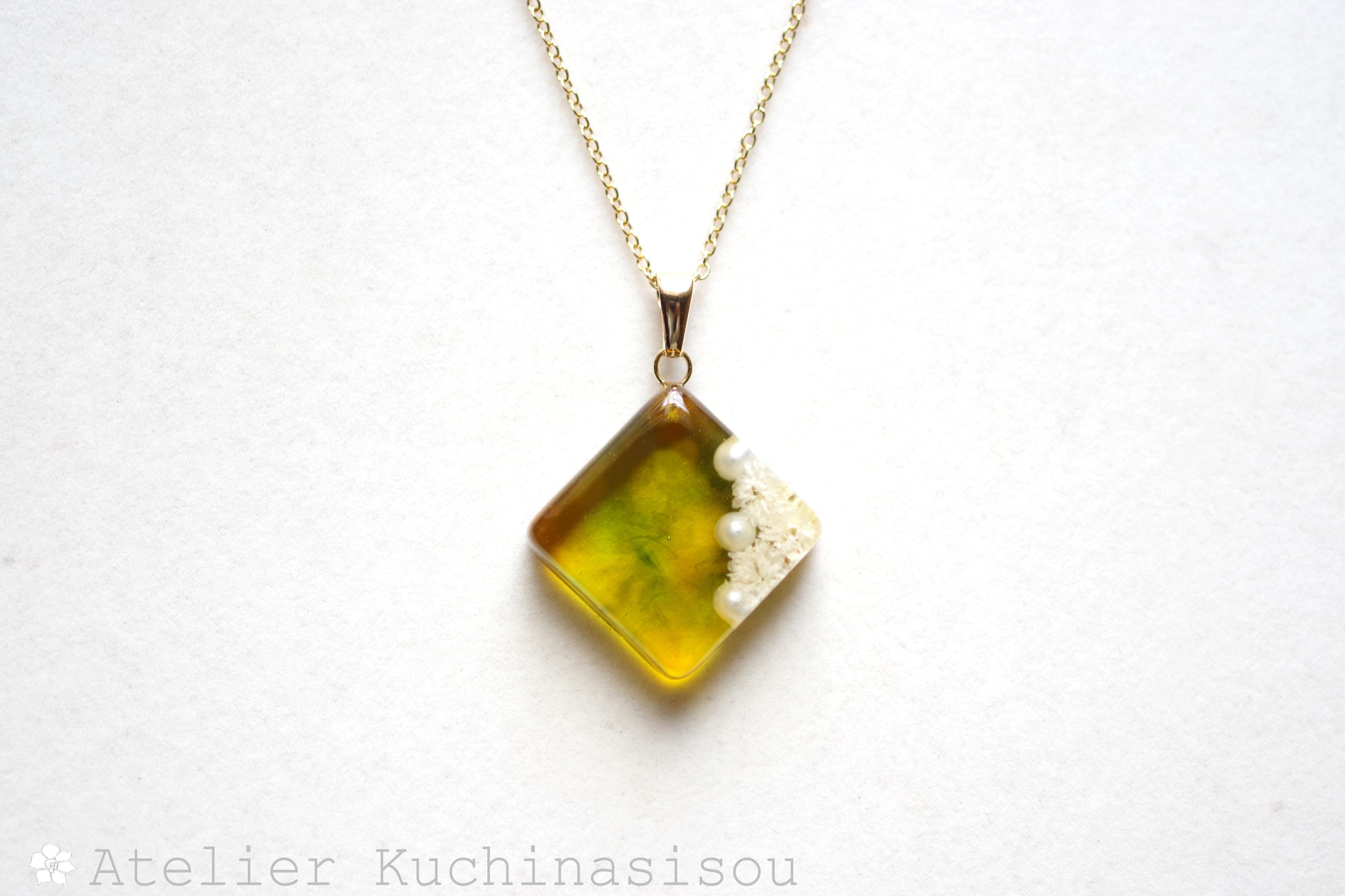 パールとお花をスクエア型のレジンに封じ込め、グリーンとオレンジで着色したペンダント。