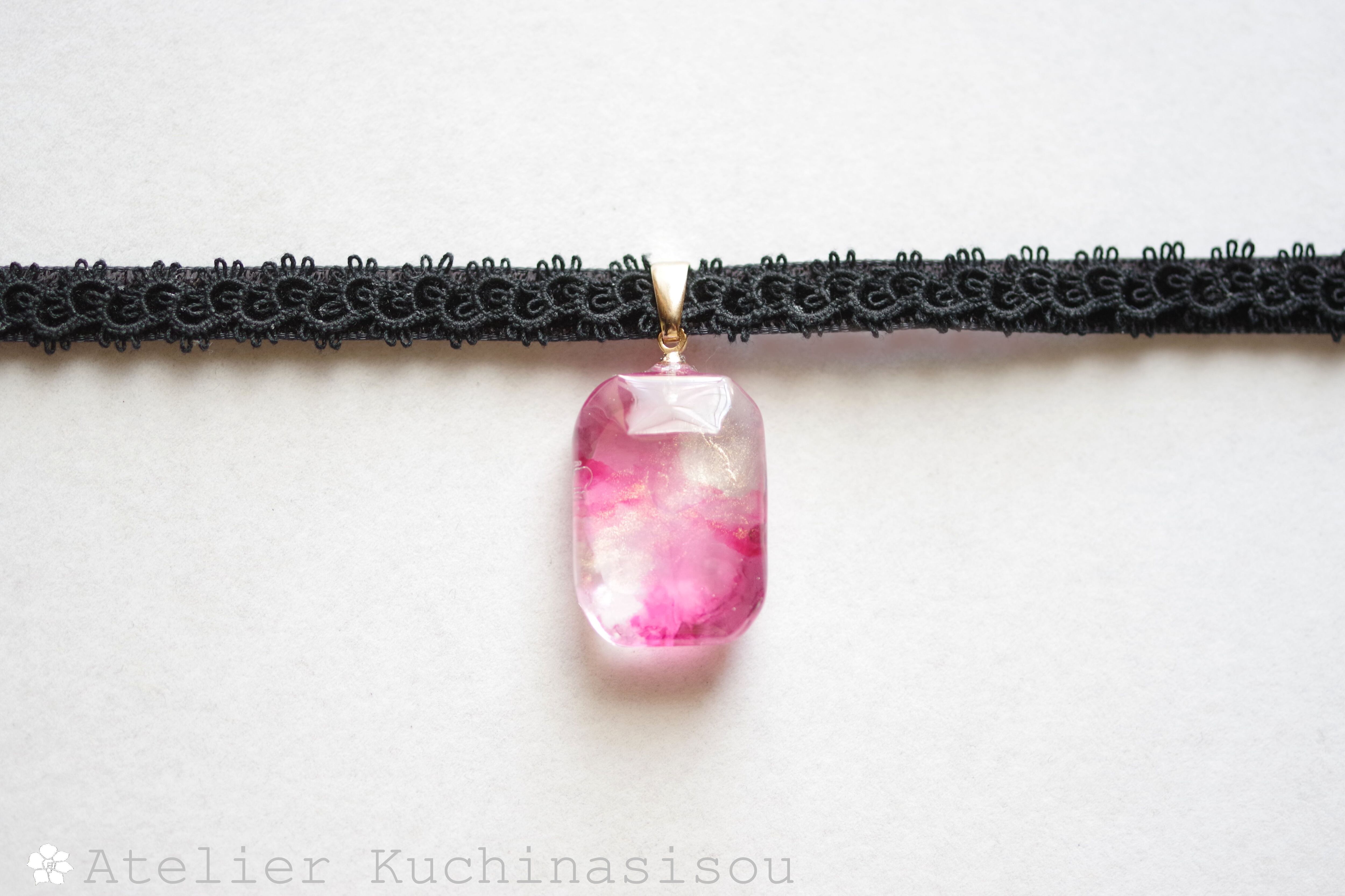 滲んだようなピンクと、横切るゴールドのラインが華やかで存在感のあるレジンを、ベルベットリボンにタティングレースで装飾を施したチョーカーに仕上げました。