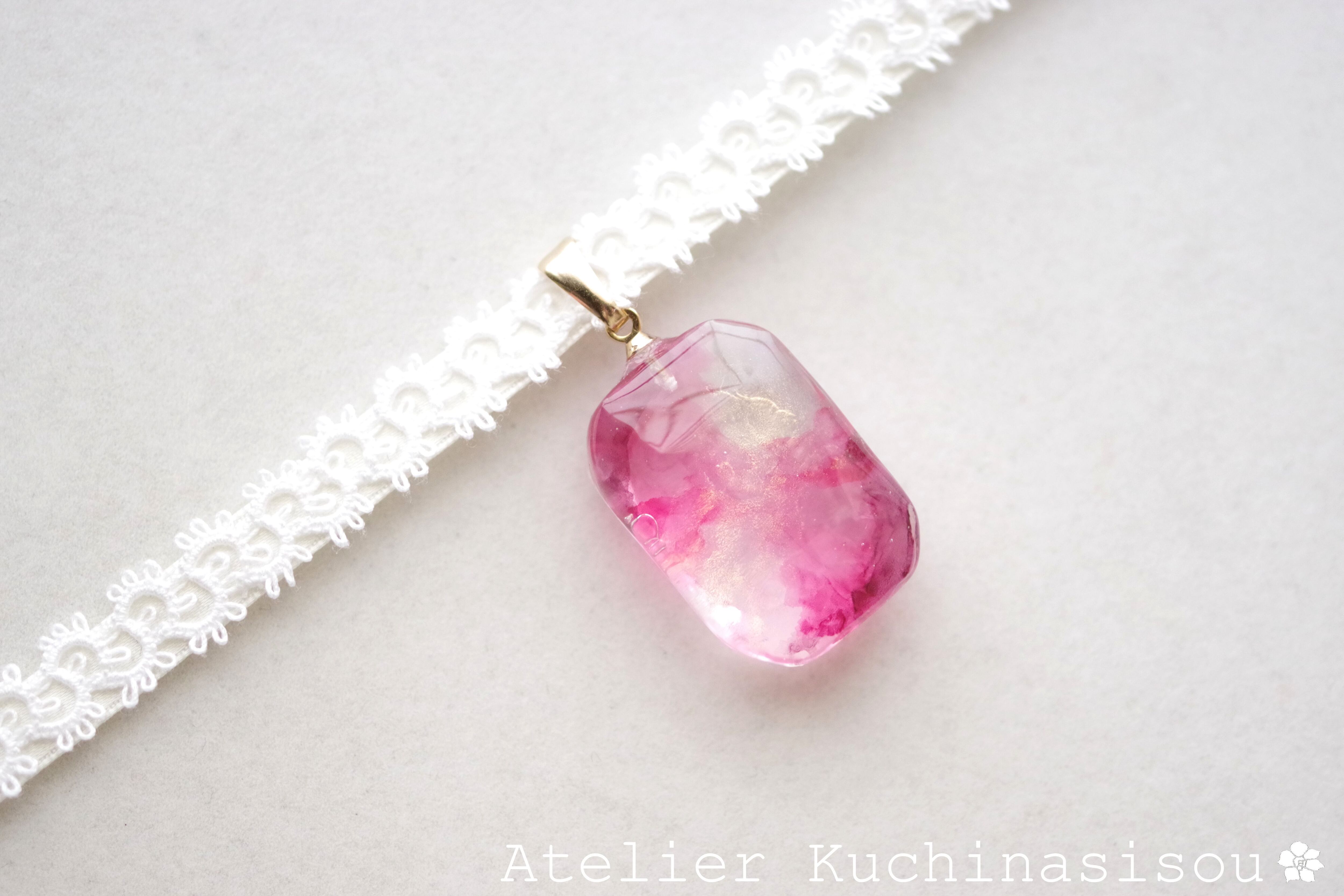 滲んだようなピンクと、横切るゴールドのラインが華やかで存在感のあるレジンを、サテンリボンにタティングレースで装飾を施したチョーカーに仕上げました。