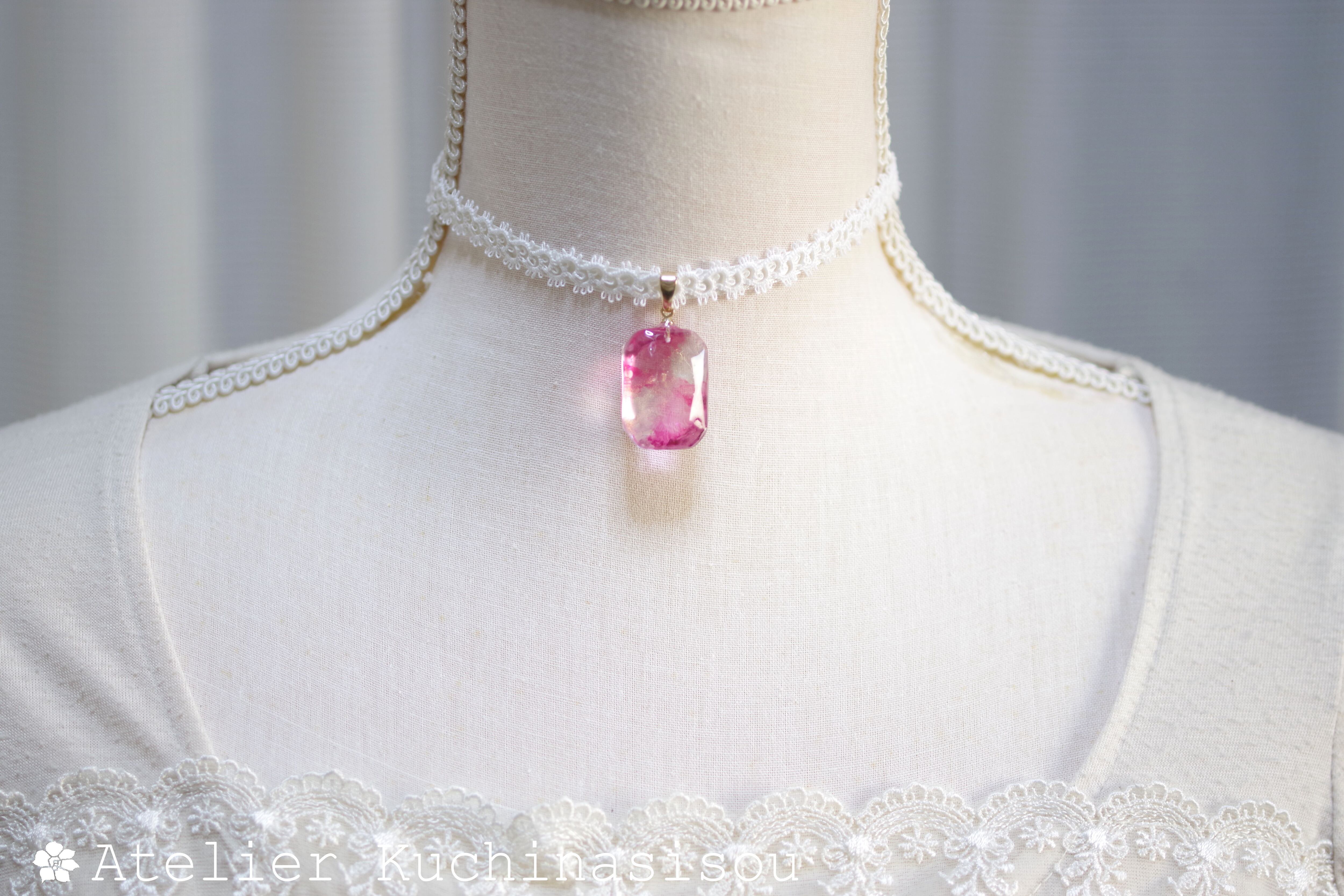 【受注製作】レジンアート エメラルドカットとタティングレースとサテンリボンのチョーカー〈薔薇は降る〉