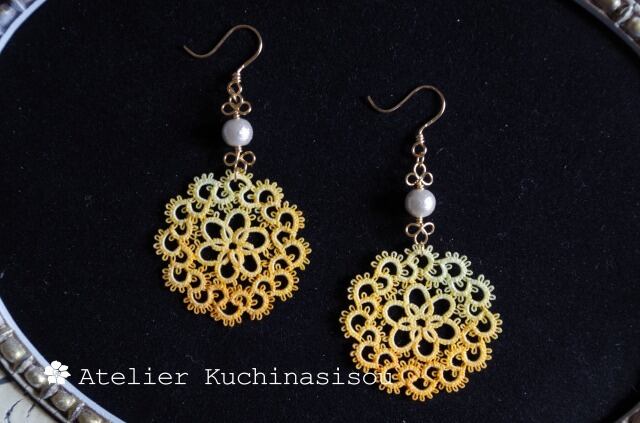 はじけるようなオレンジ色と暖かみのあるカナリヤイエローが夏への気分を高める、タティングレースのピアスです(*´∀`*)