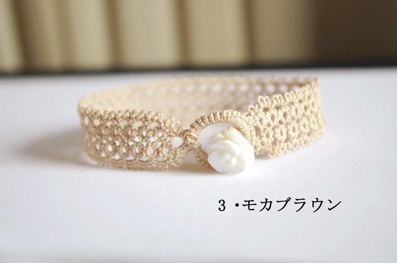 薔薇のビーズを留め具に使ったシンプルながらも存在感のあるタティングレースのブレスレットです。