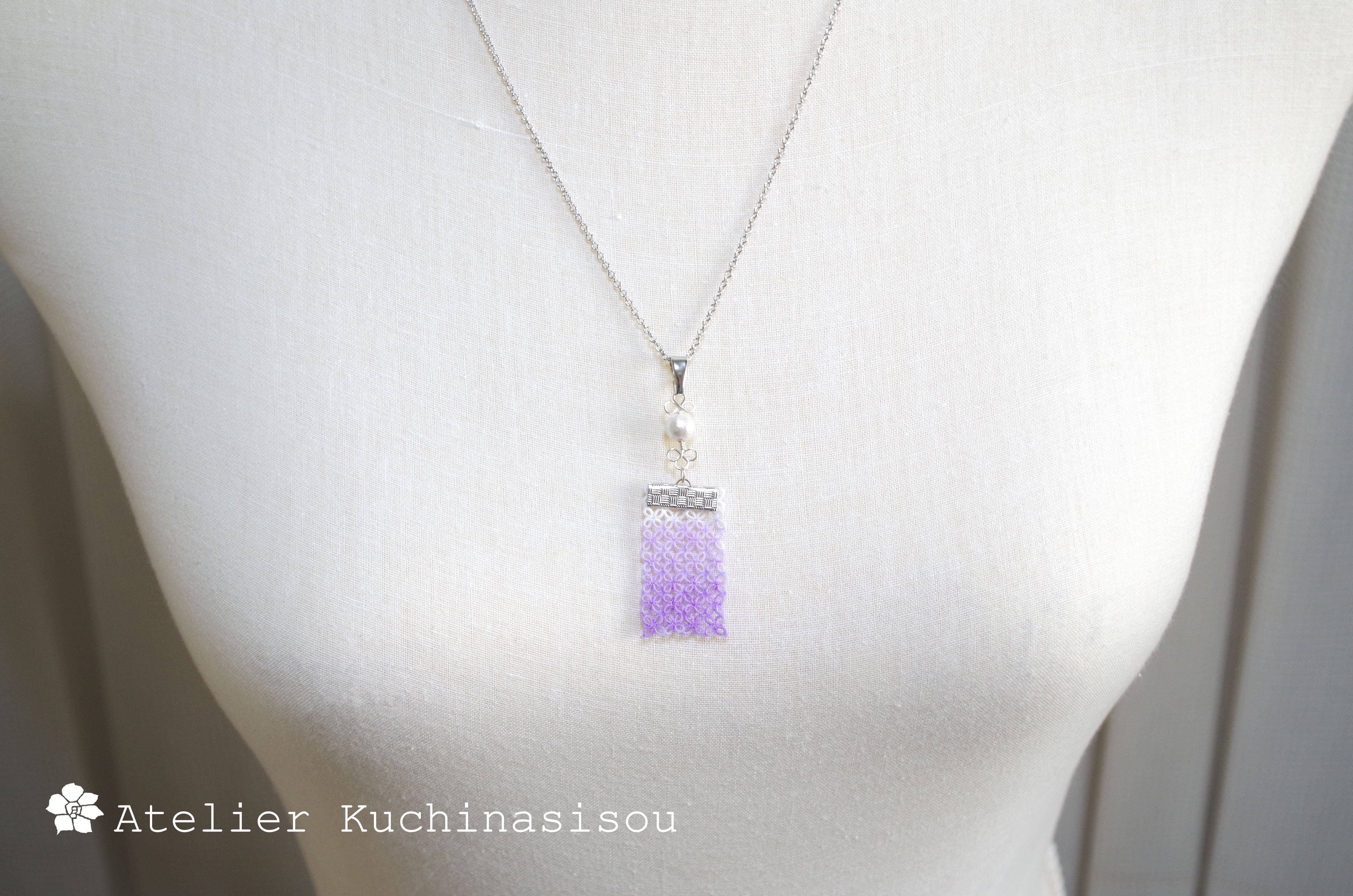 5㎜にも満たない小さなモチーフをつなぎ合わせて作った短冊形のレースをすみれの花を思わせる鮮やかな紫色のグラデーションに染め上げました。