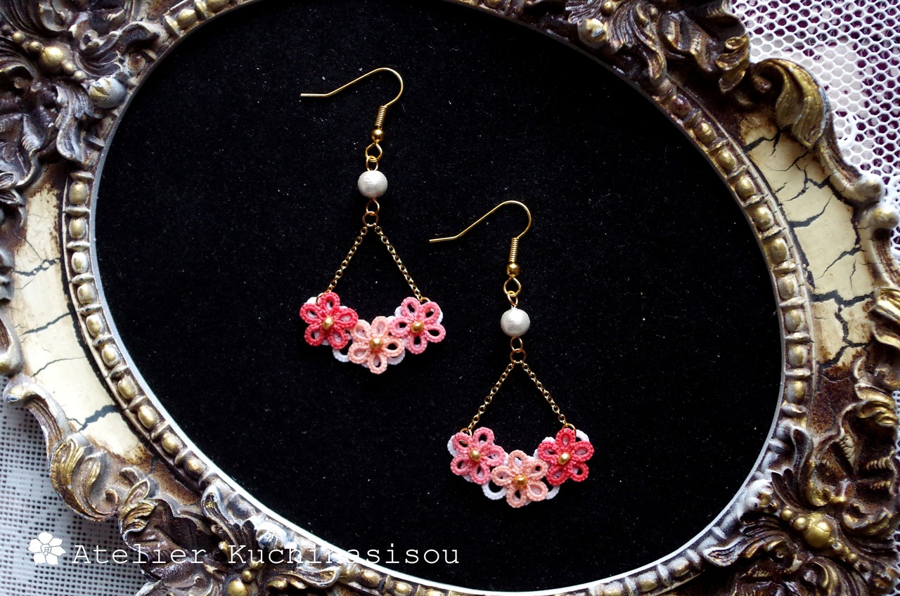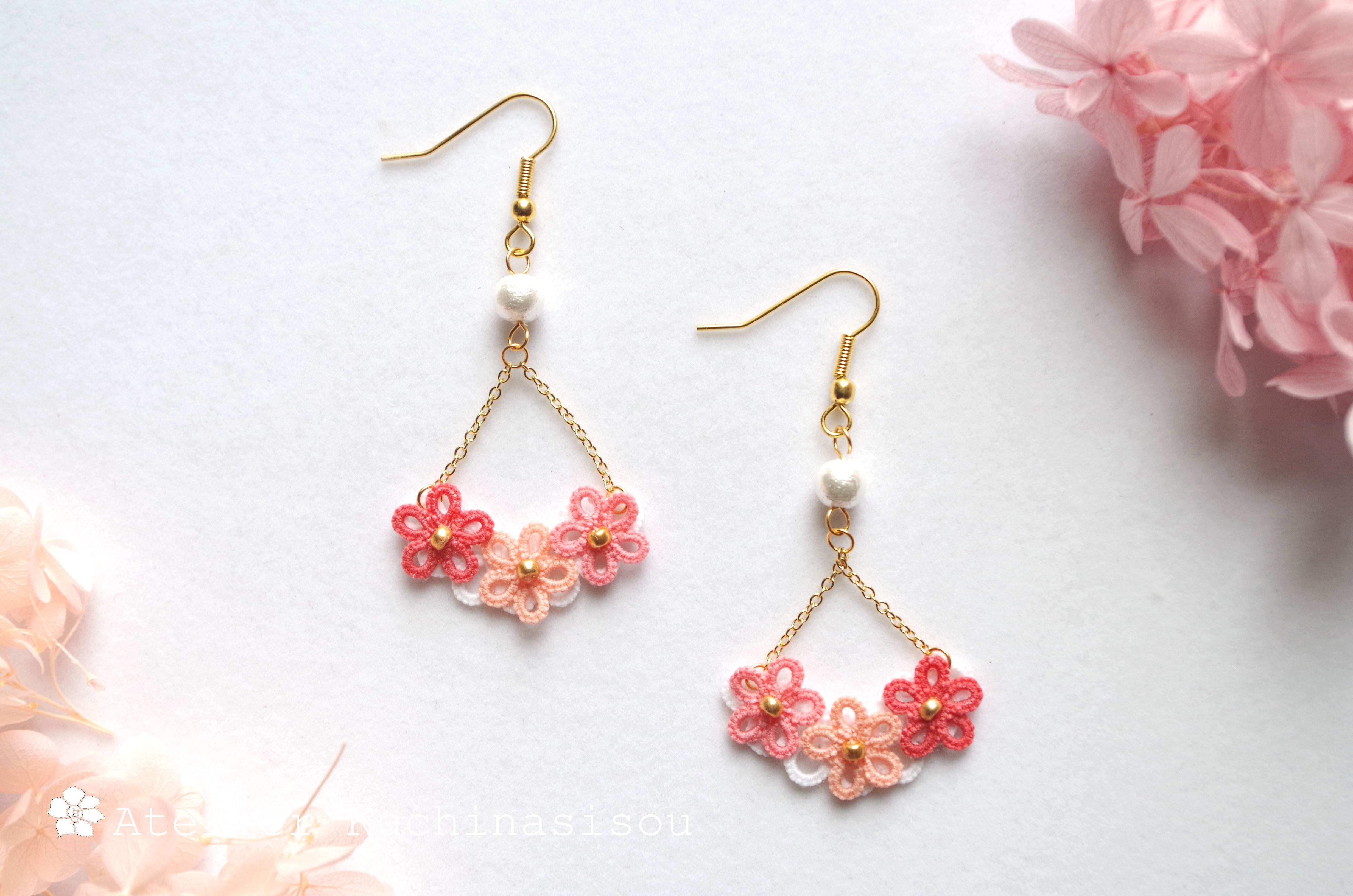 三輪のタティングレースのお花とコットンパールが揺れる可憐なピアスができました♪