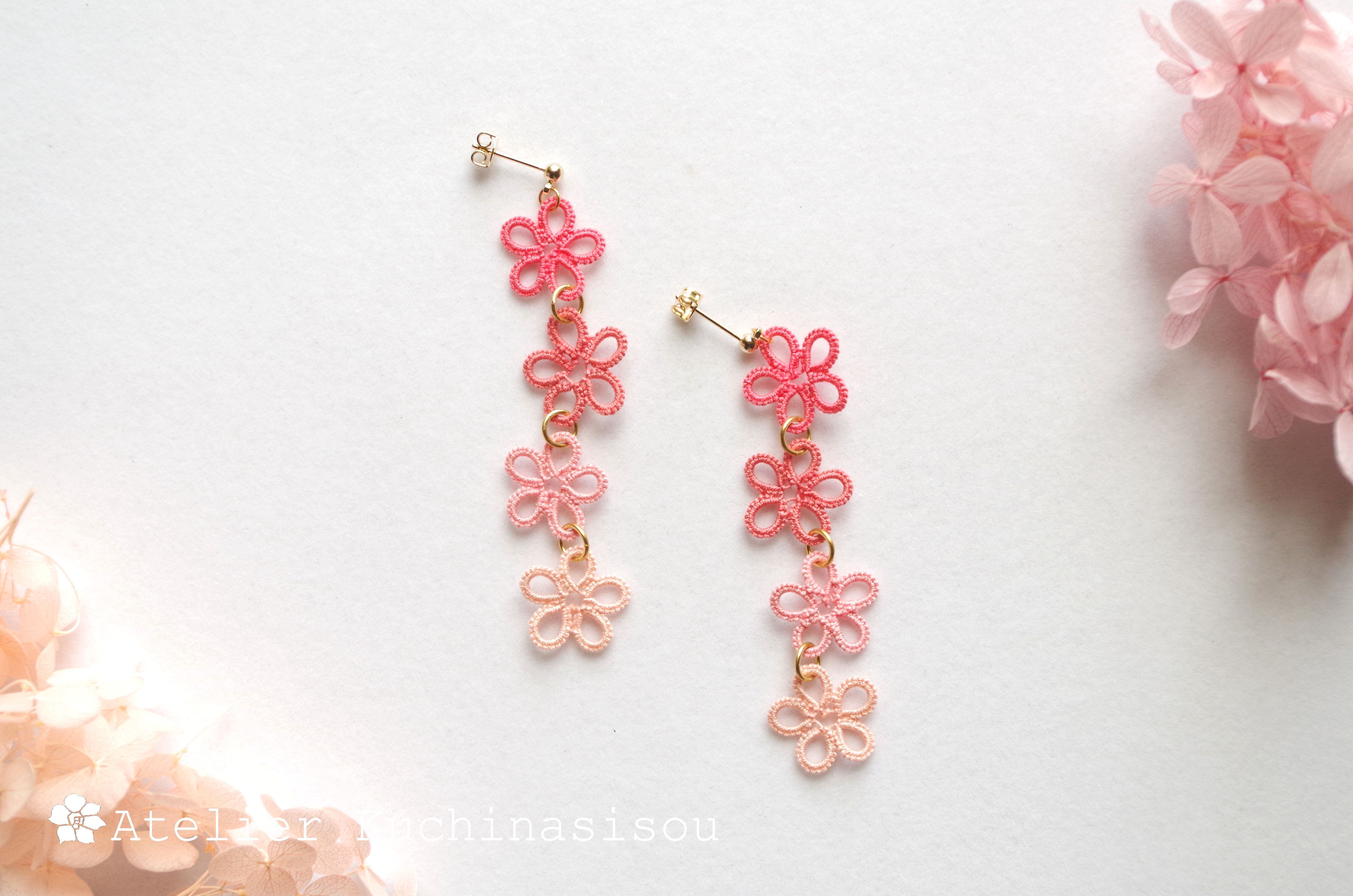 タティングレースのお花を連ねた、ありそうでなかったシンプルで可憐なピアスです♪