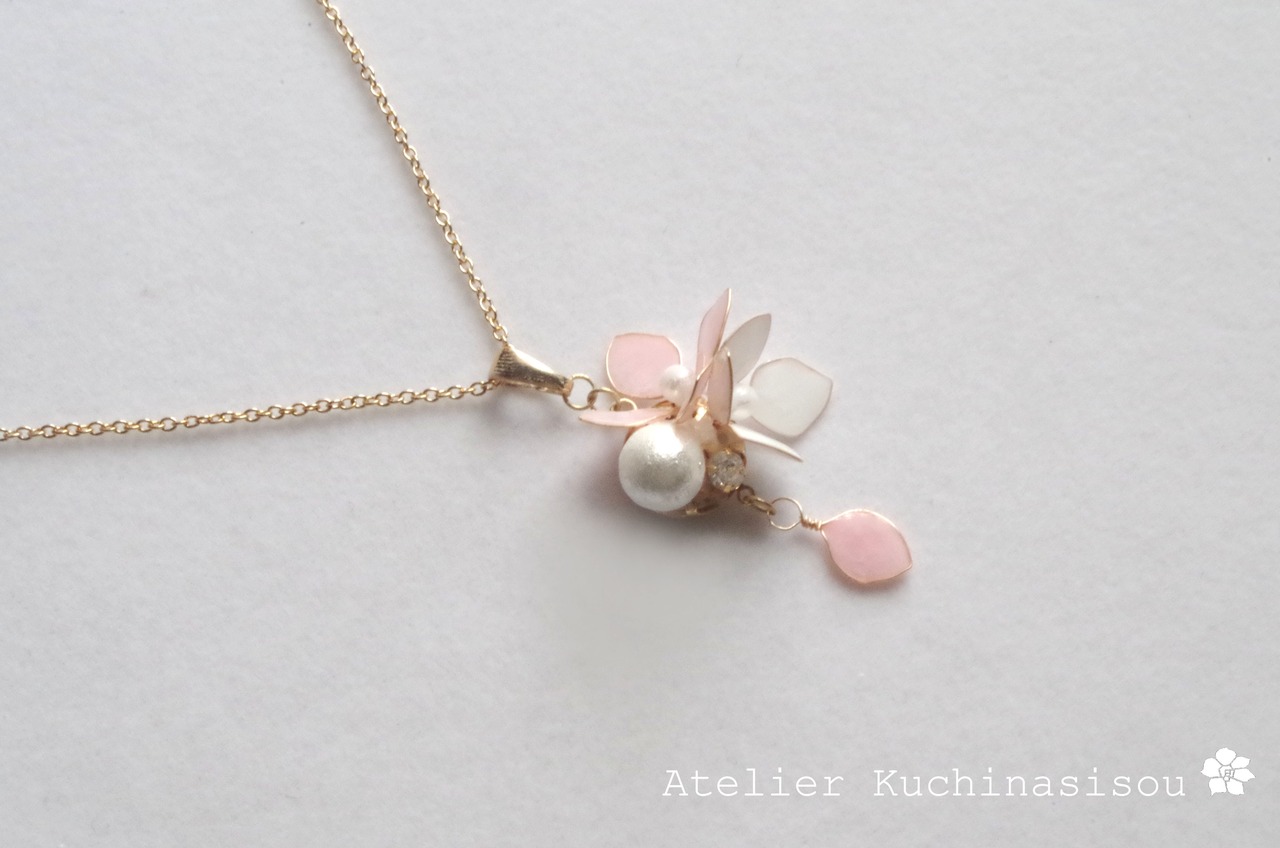 マニキュアフラワーの紫陽花とコットンパールのペンダントができました♪