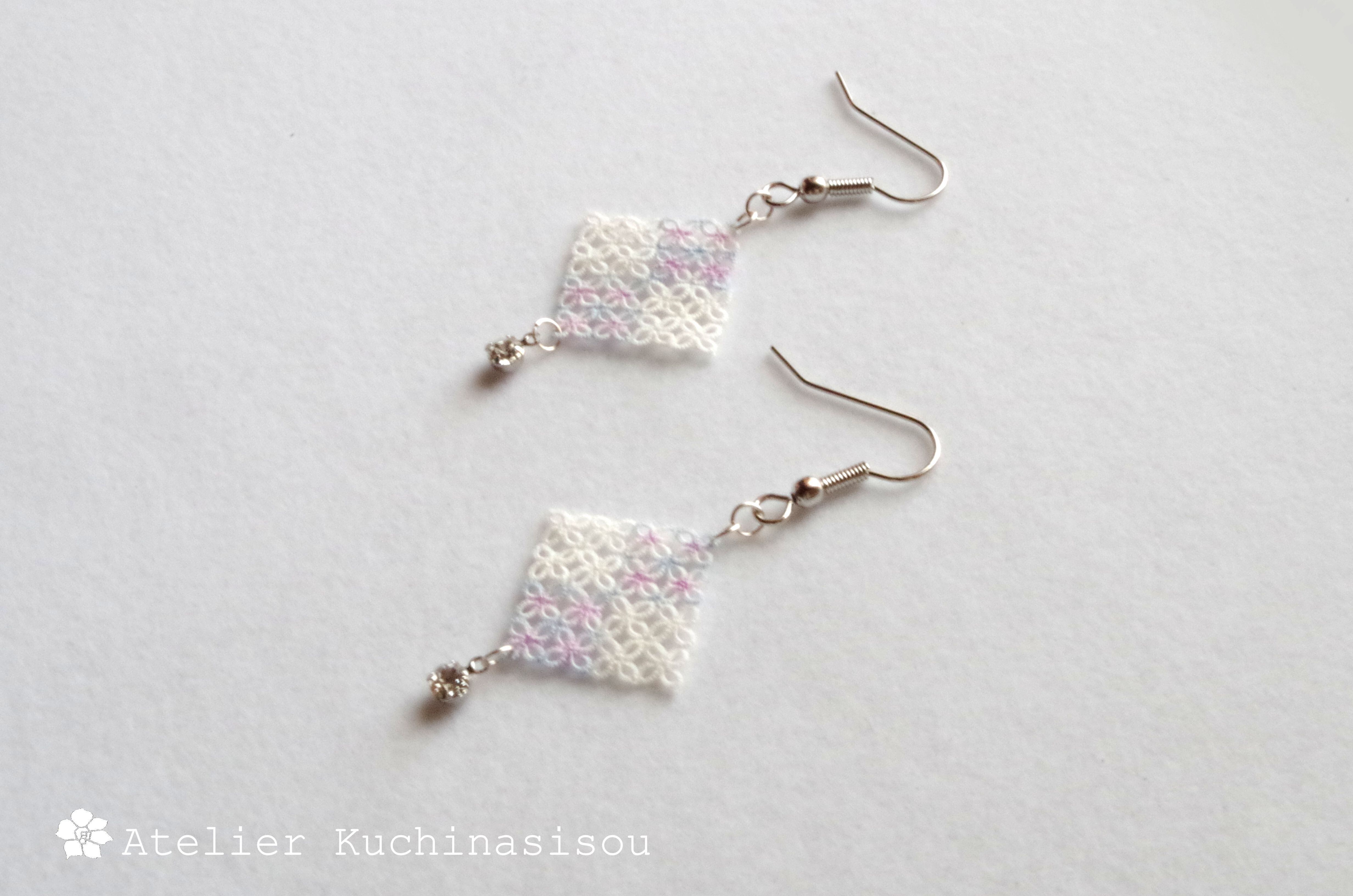 タティングに使うレース糸の中ではおよそ最も細いのではないか?と思われる160番の超極細糸を使用した、華奢で繊細なタティングレースのピアスです(*'▽'*)