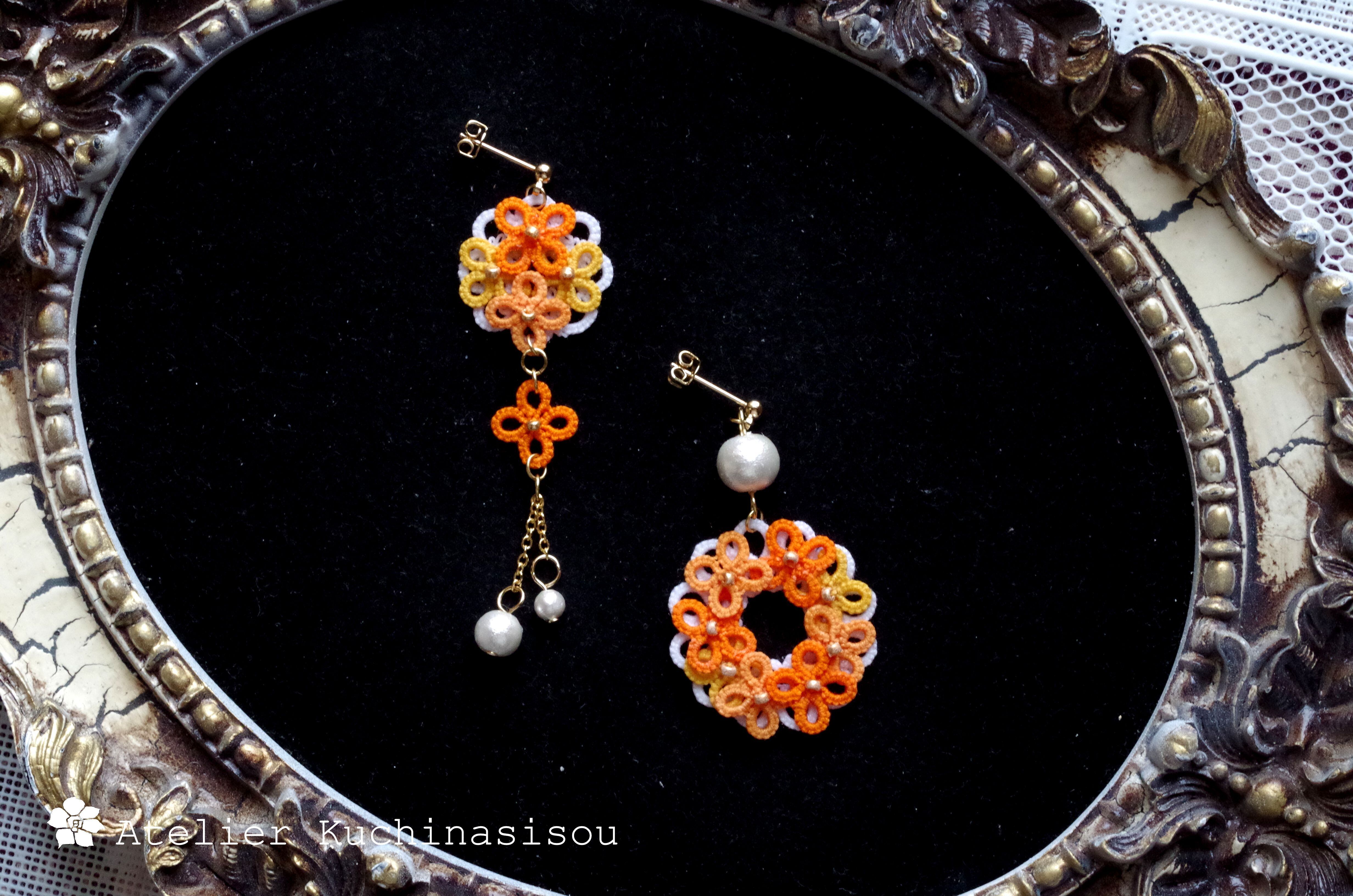 鮮やかなオレンジ色が秋への郷愁をかきたてるタティングレースとコットンパールのアシンメトリーピアスができました♪