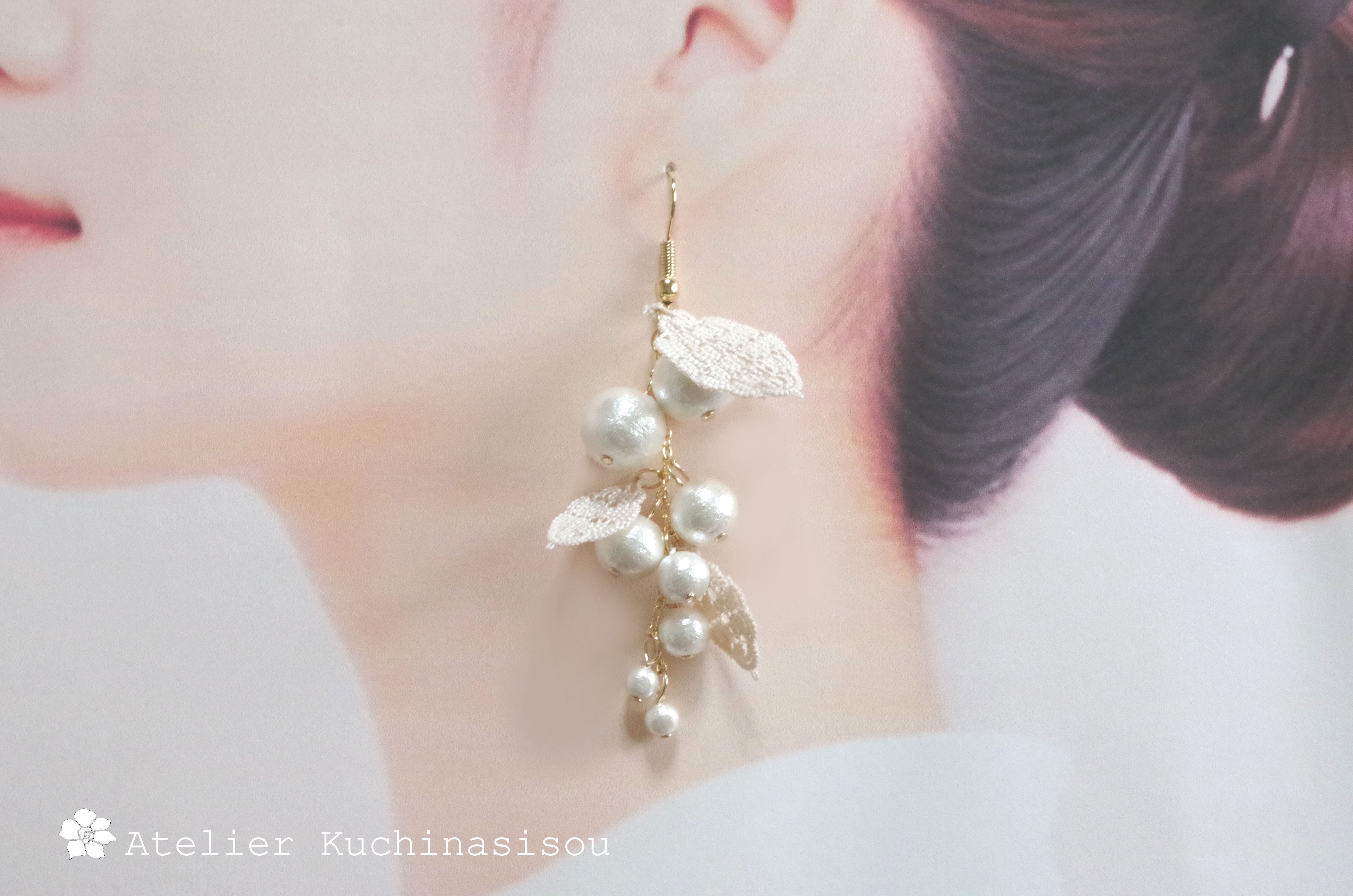 鈴なりになったコットンパールとタティングレースの葉っぱがとても愛らしく、耳元をパッと明るく彩ります。