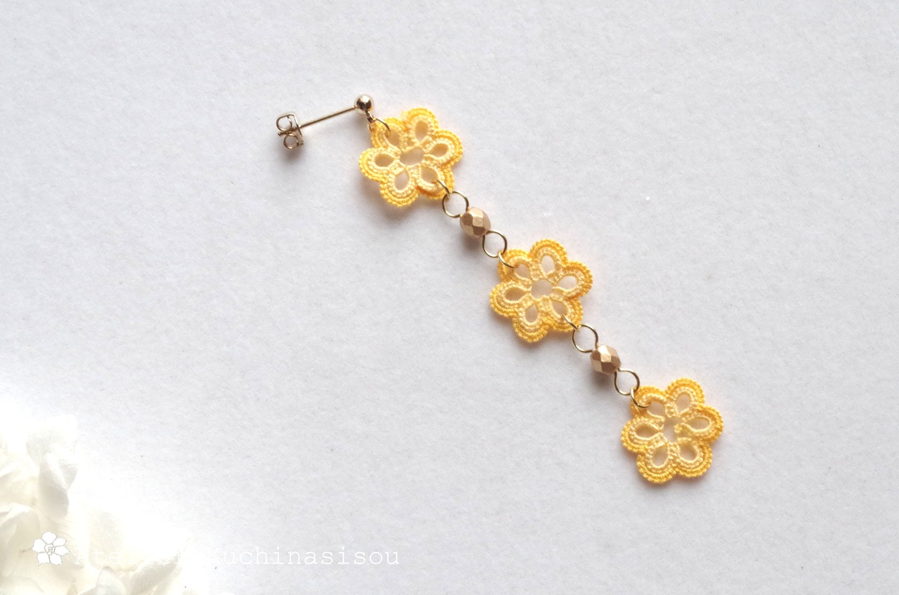 タティングレースのお花とチェコビーズを連ねた愛らしいピアスができました♪