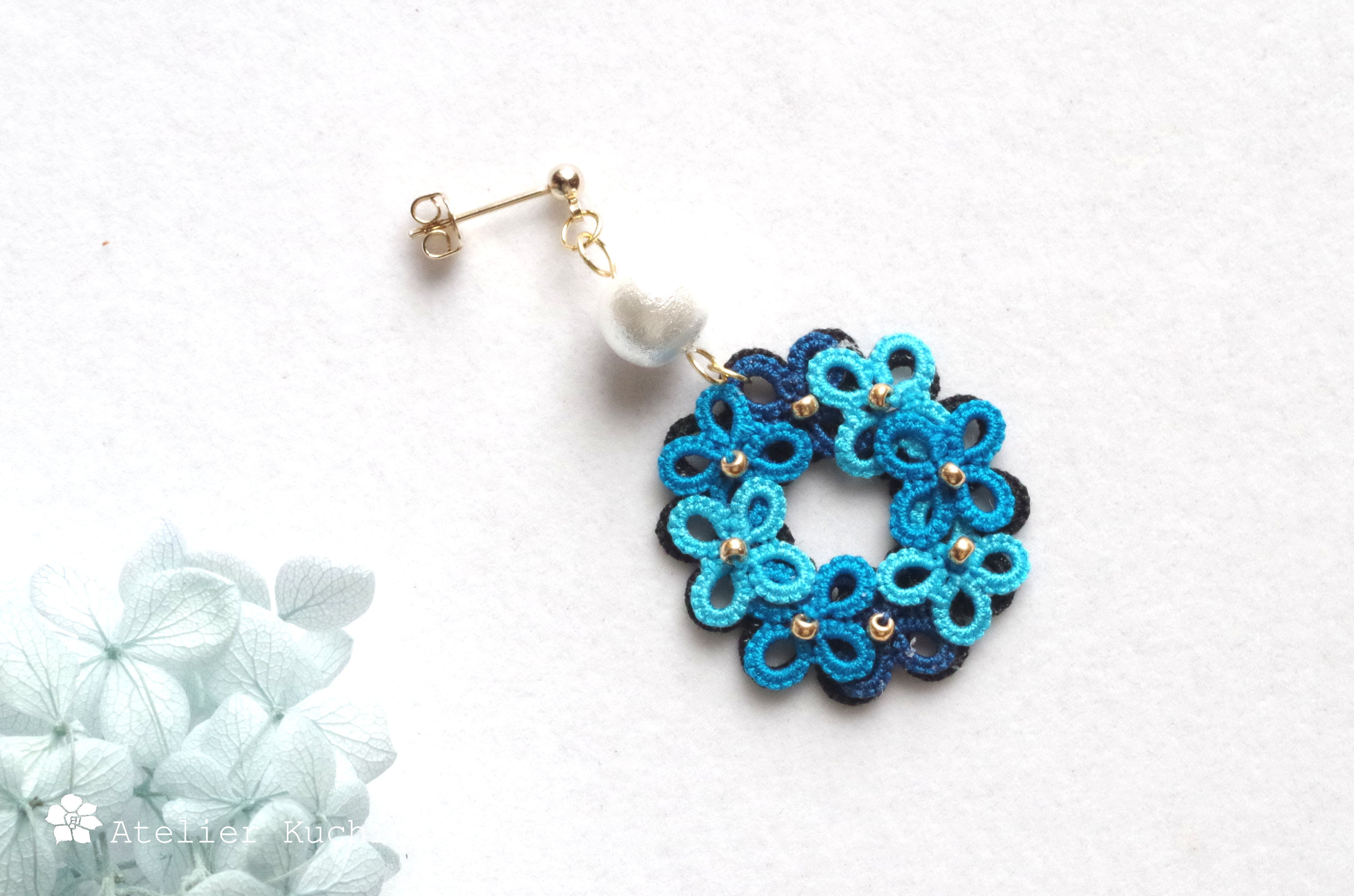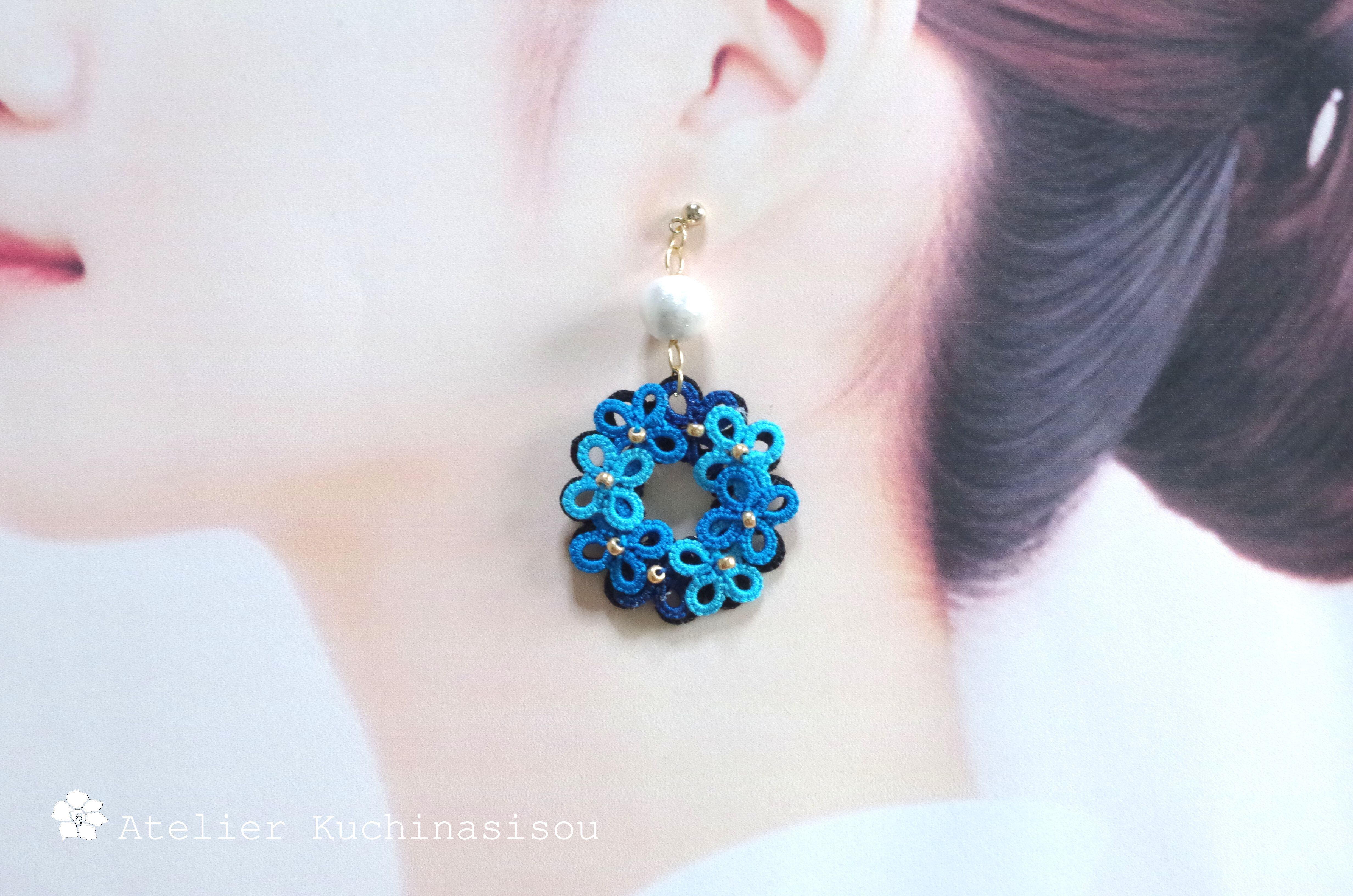 パキッとした鮮やかなサファイアブルーの小花が印象的なタティングレースのアシンメトリーピアスができました♪