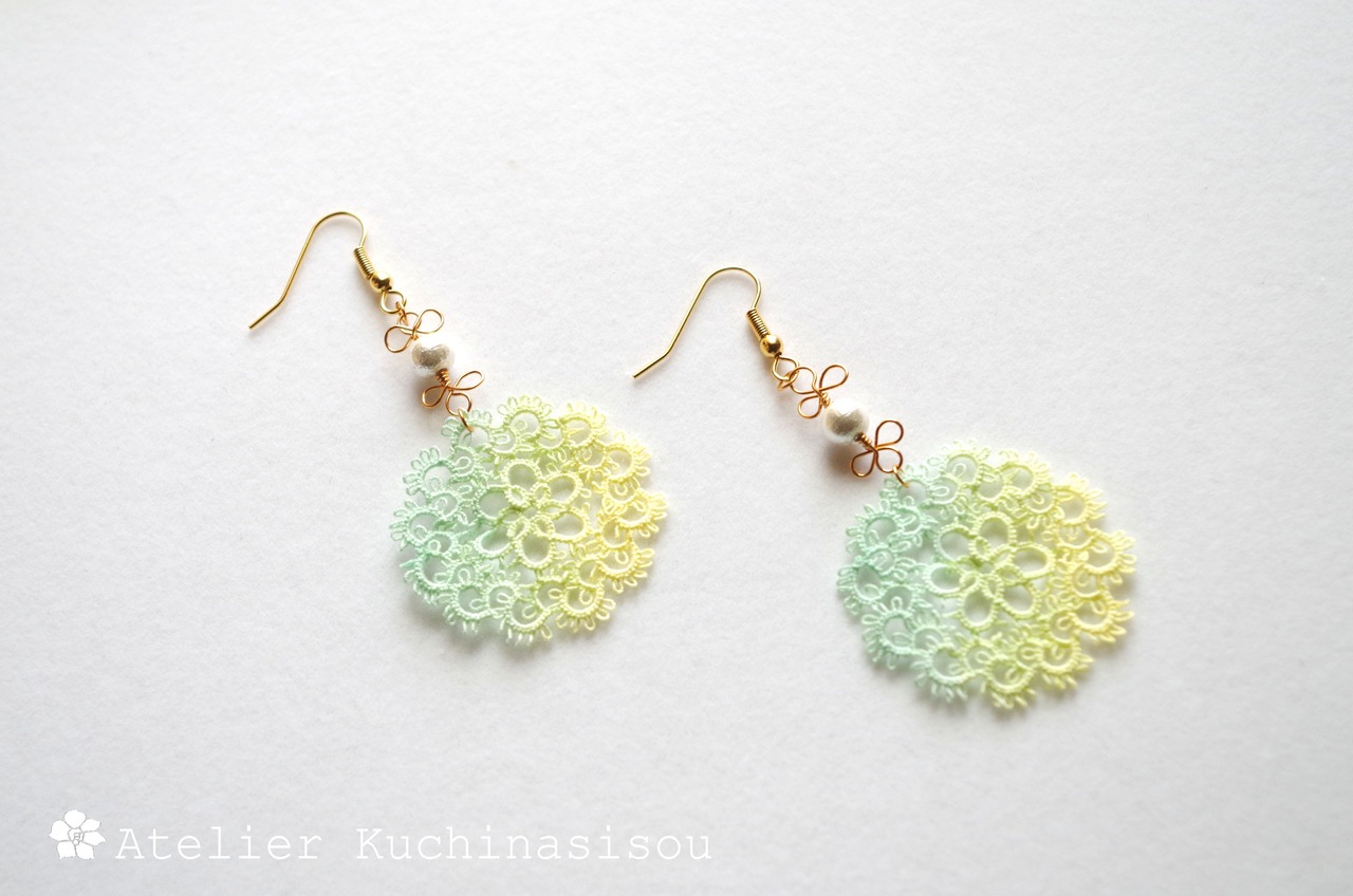 見ているだけで心が弾むような明るいイエローと、さわやかなグリーンの組み合わせが安心感を覚える、普段使いにぴったりのタティングレースのピアスです♪