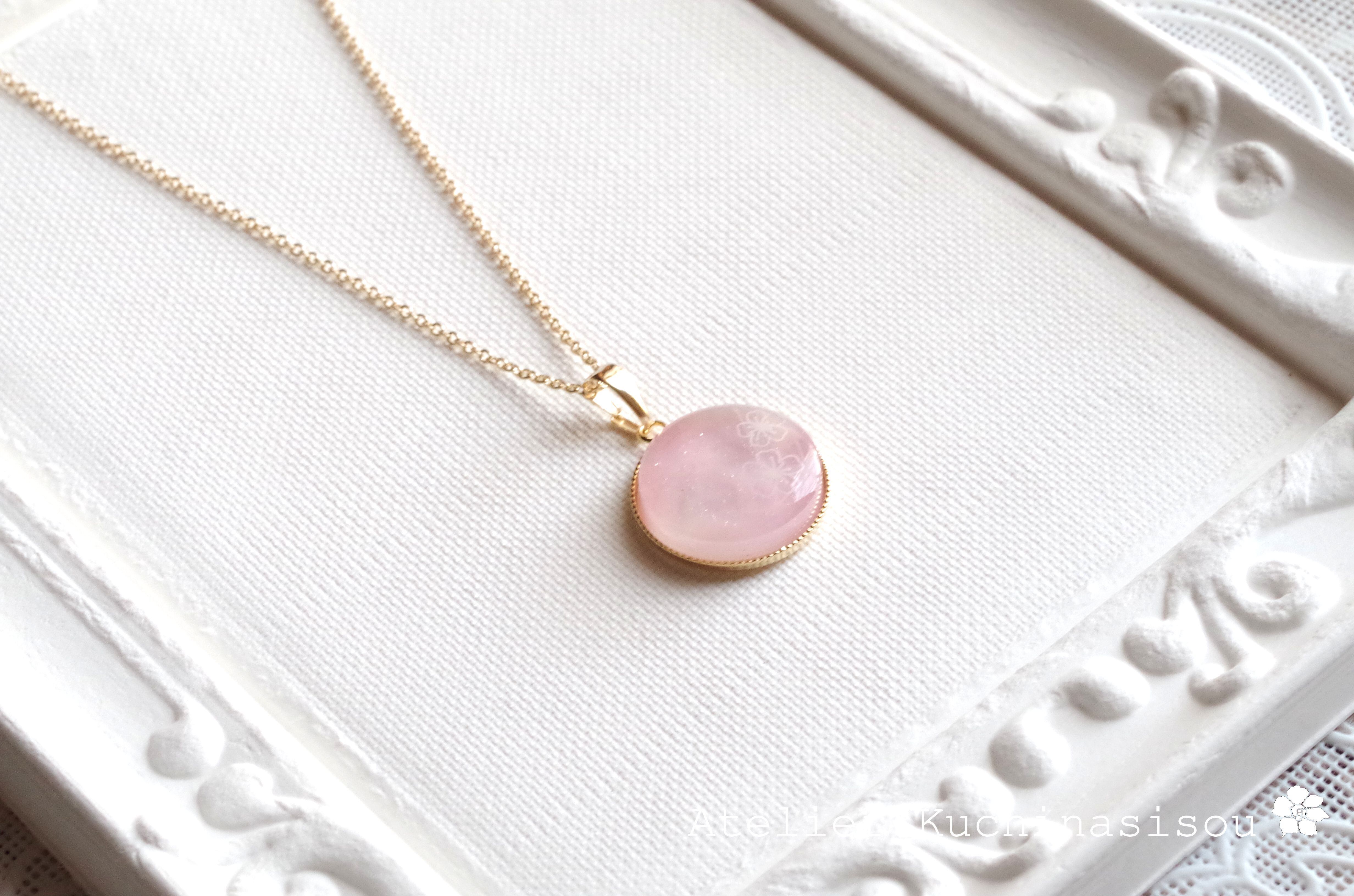 淡いピンク色が優しくうららかな、春を思わせるカラーリングのペンダント。