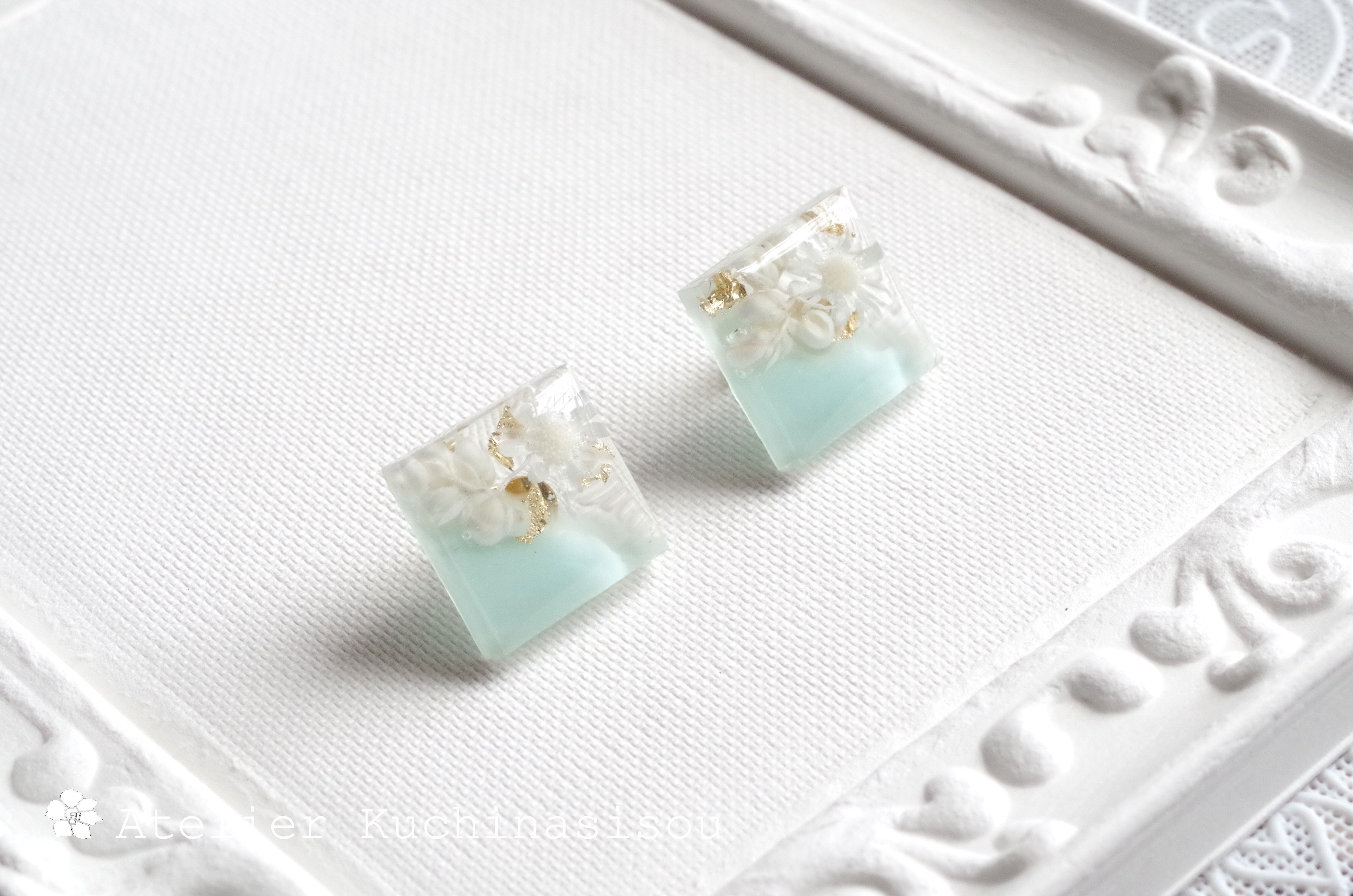 レジンでスクエアモチーフにお花を封じ込めたピアスを作りました♪