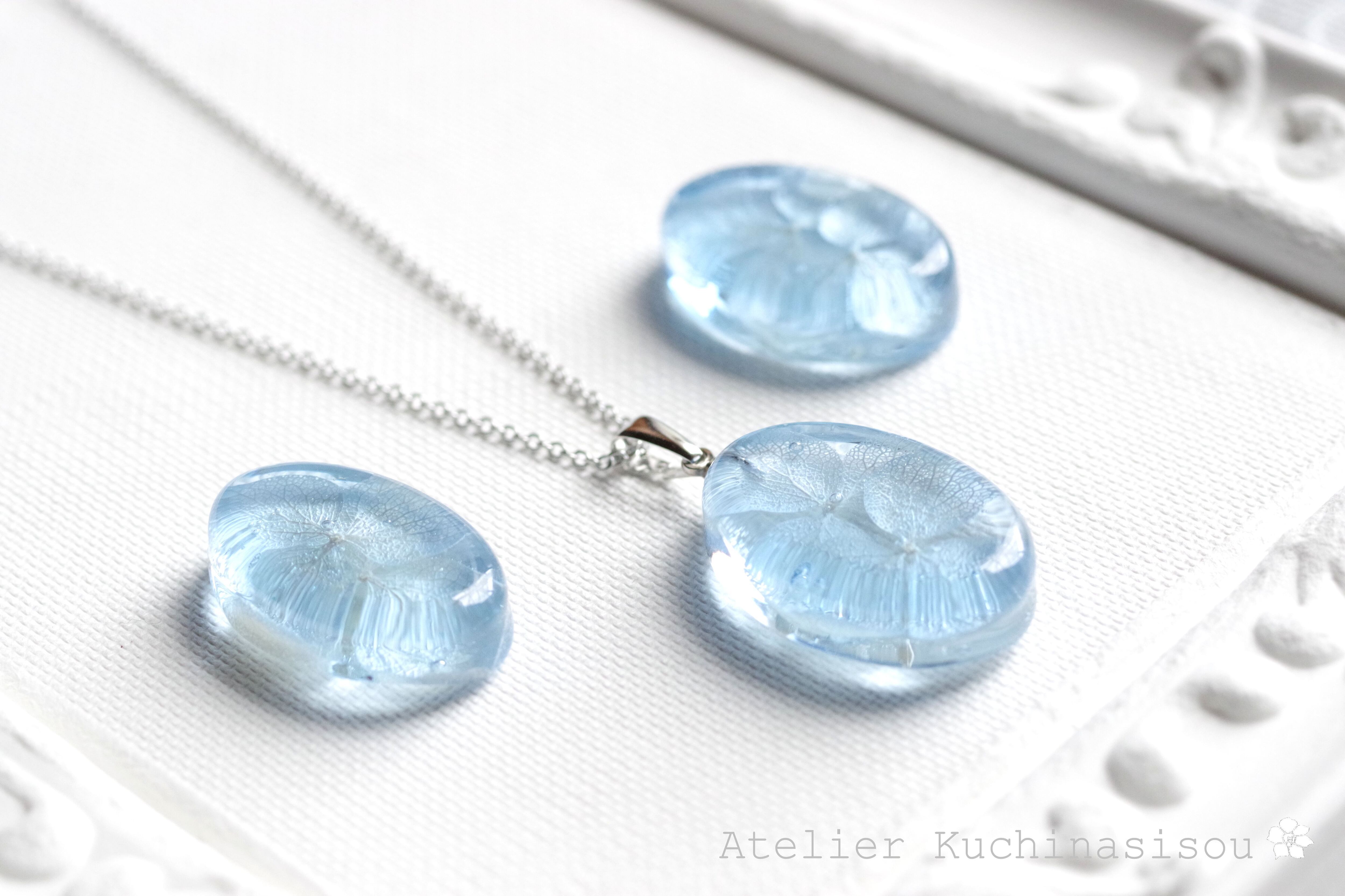 紫陽花のプリザーブドフラワーを青いレジンに沈めた愛らしく爽やかなペンダント。
