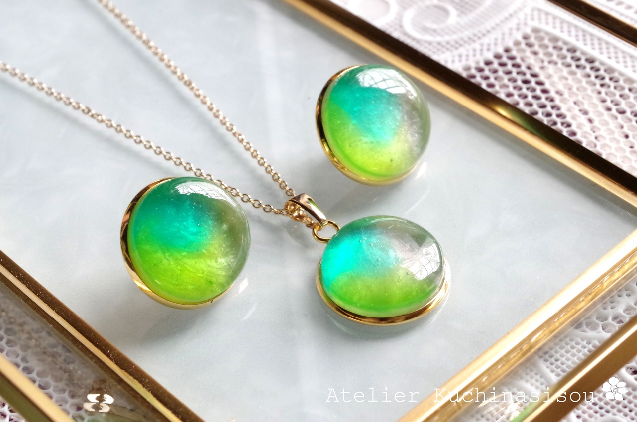 木々のささやきが聞こえてきそうな鮮やかな緑色が初夏、夏にぴったりのピアス。
