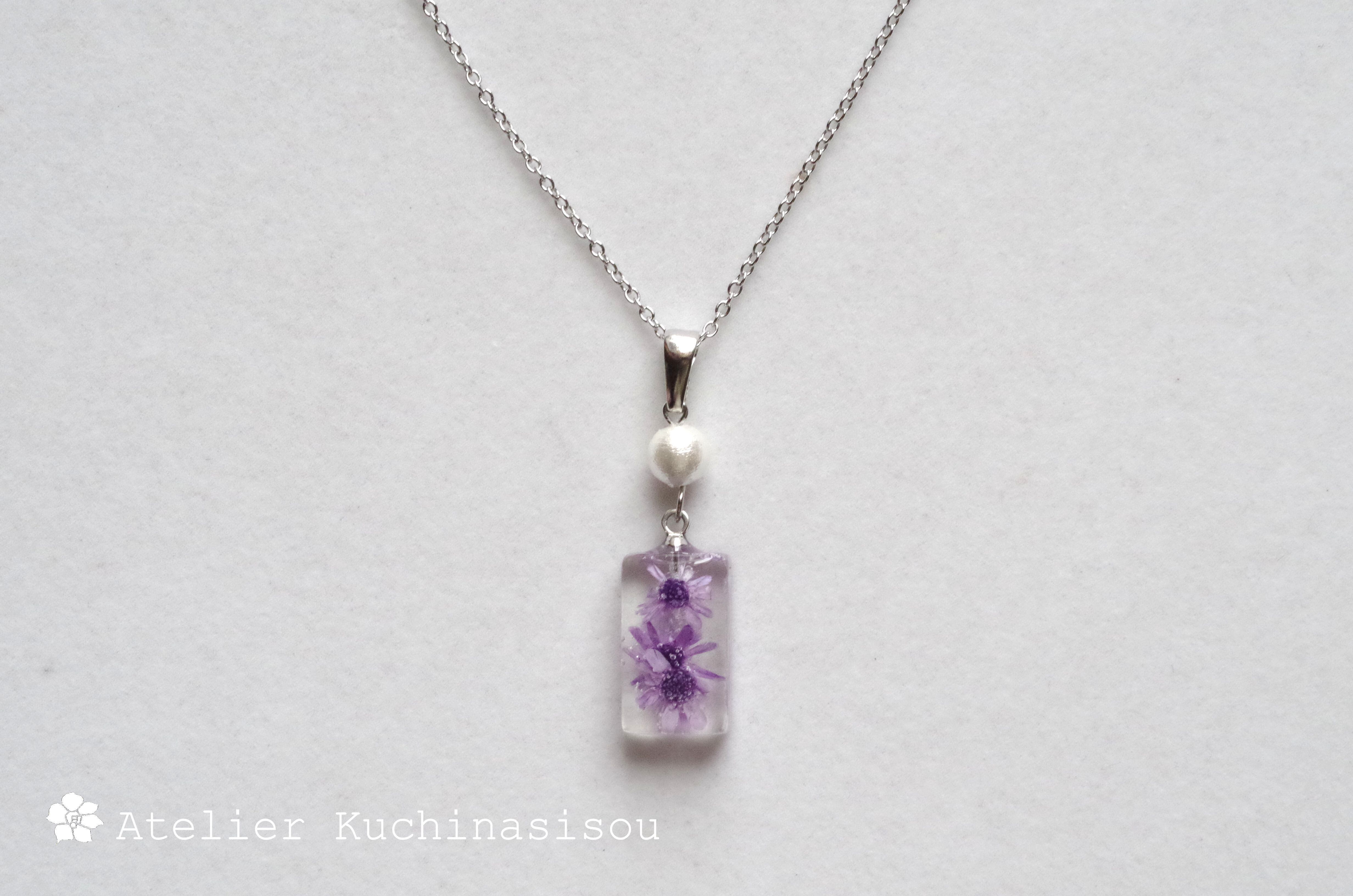レジンアート お花とコットンパールのペンダント〈紫〉(シルバー)