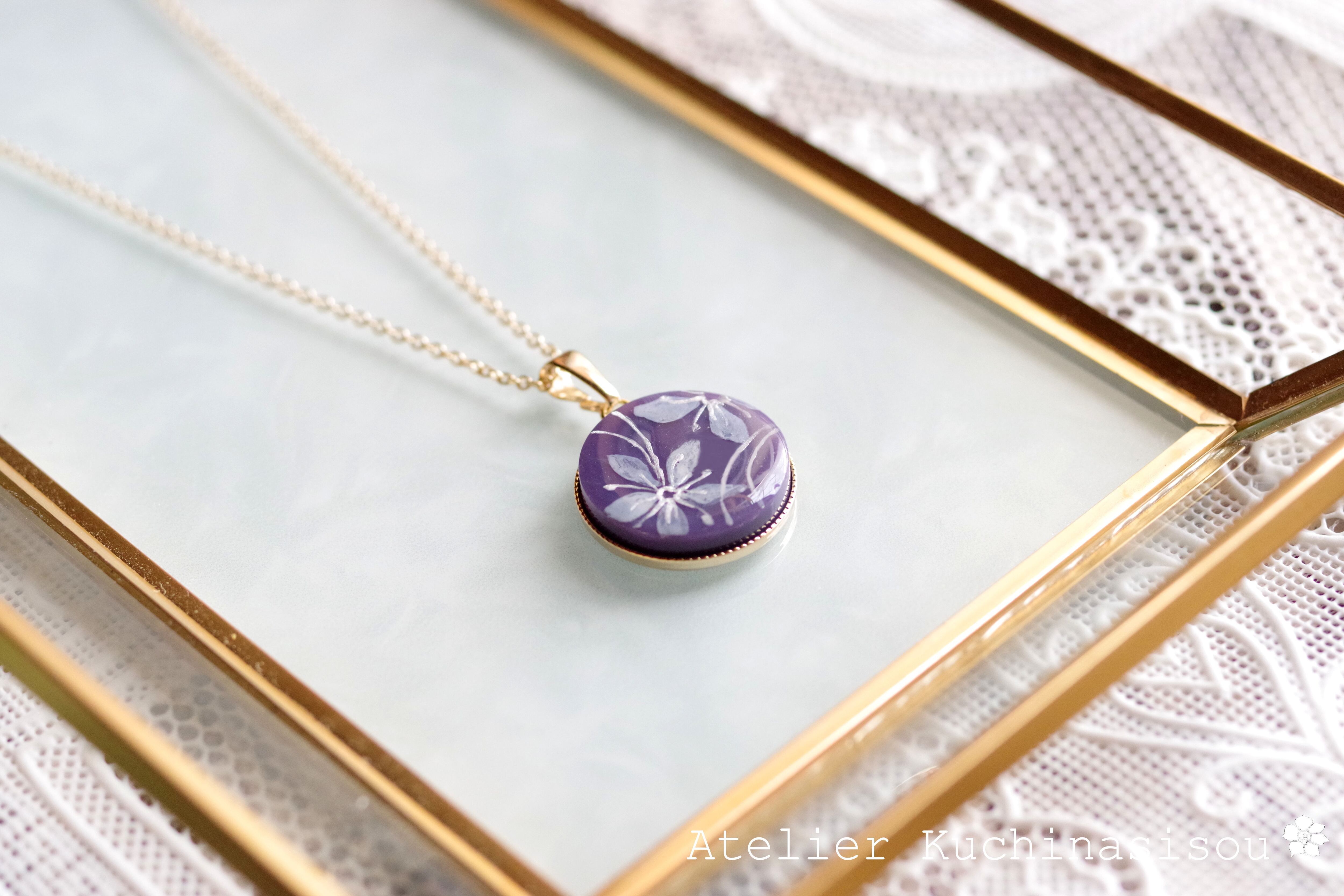 バイオレットの背景に白いお花を咲かせたシンプルなデザインのペンダント。