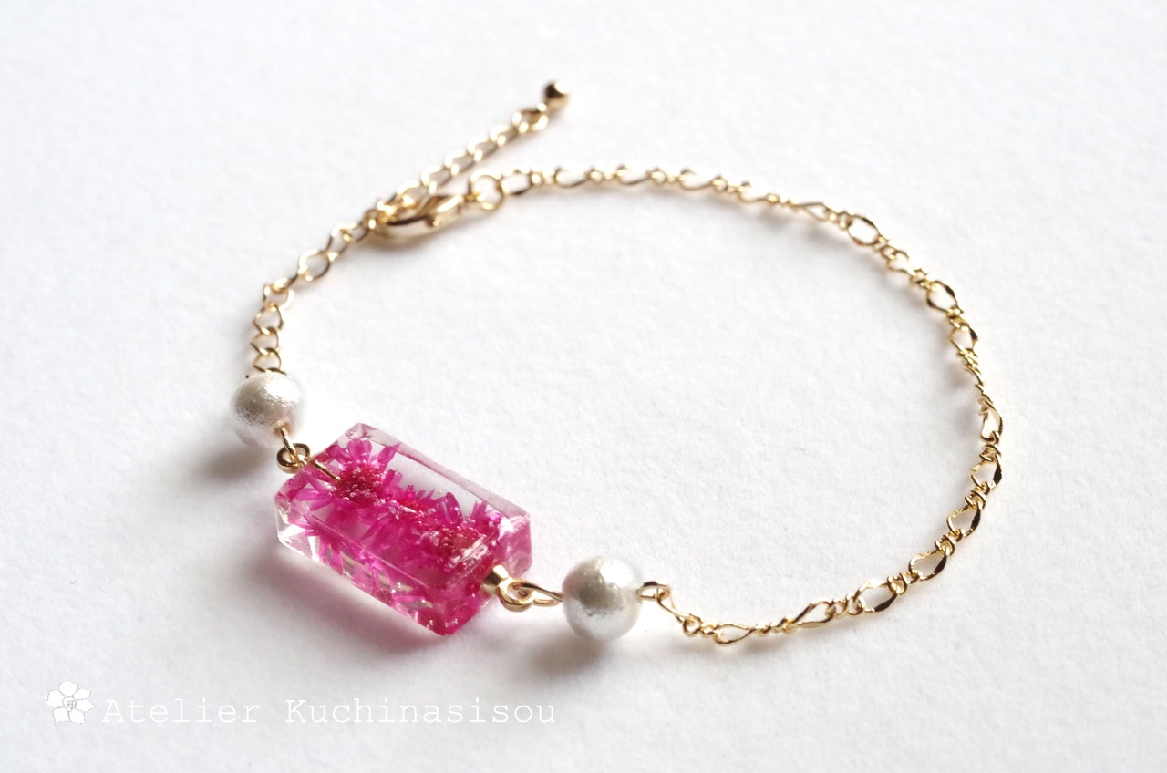 レジンにお花を閉じ込めコットンパールと連ねた可憐なブレスレットを作りました♪