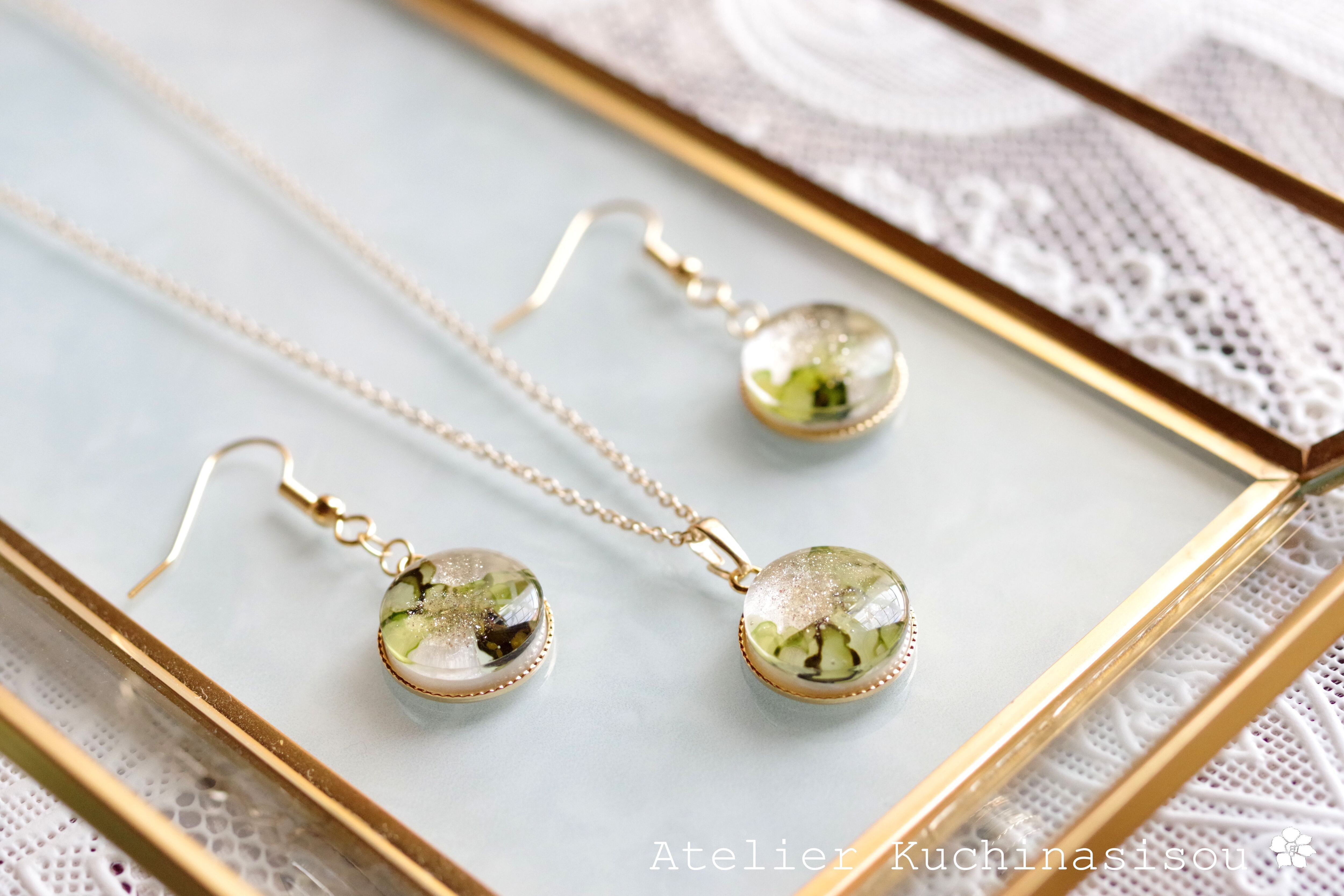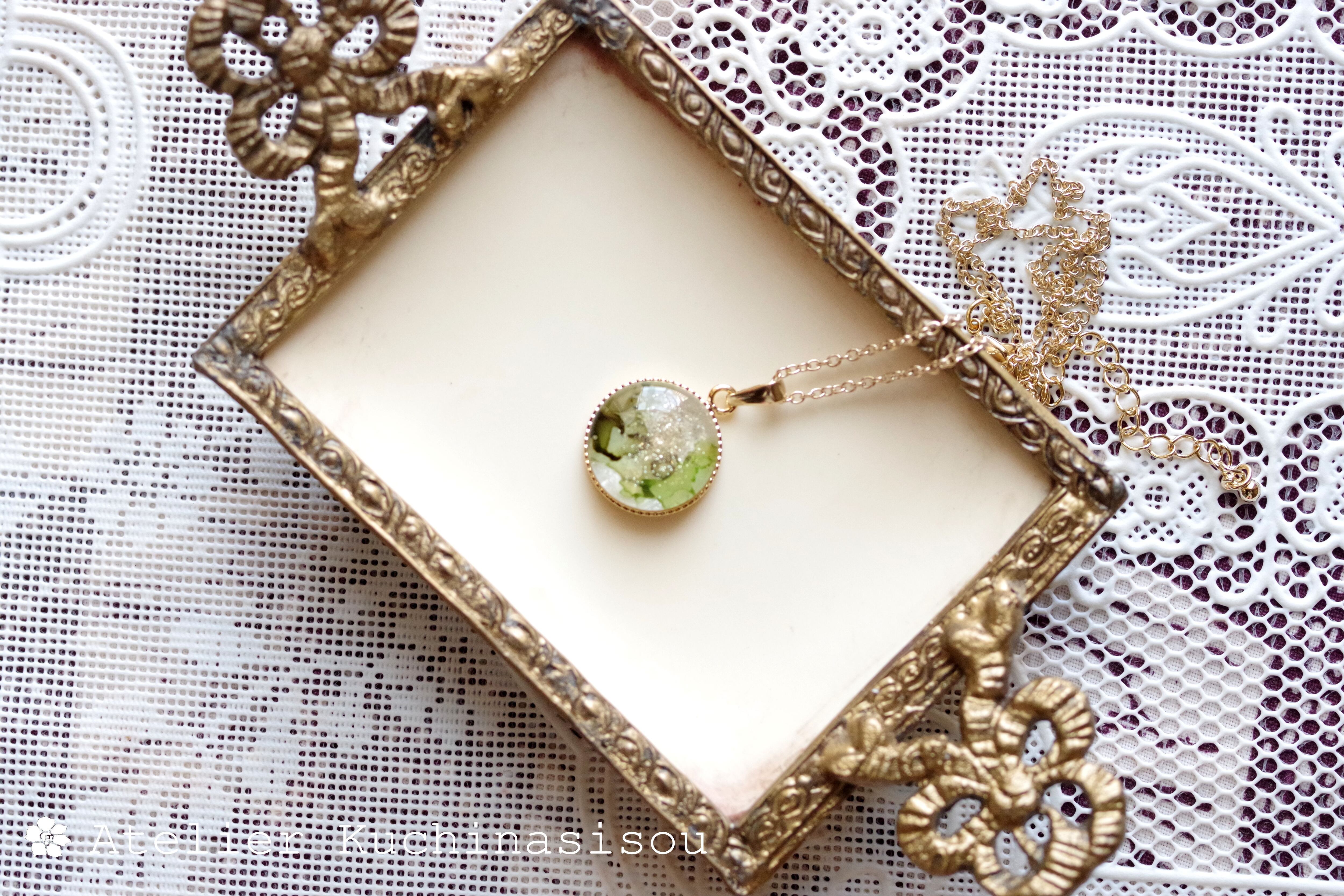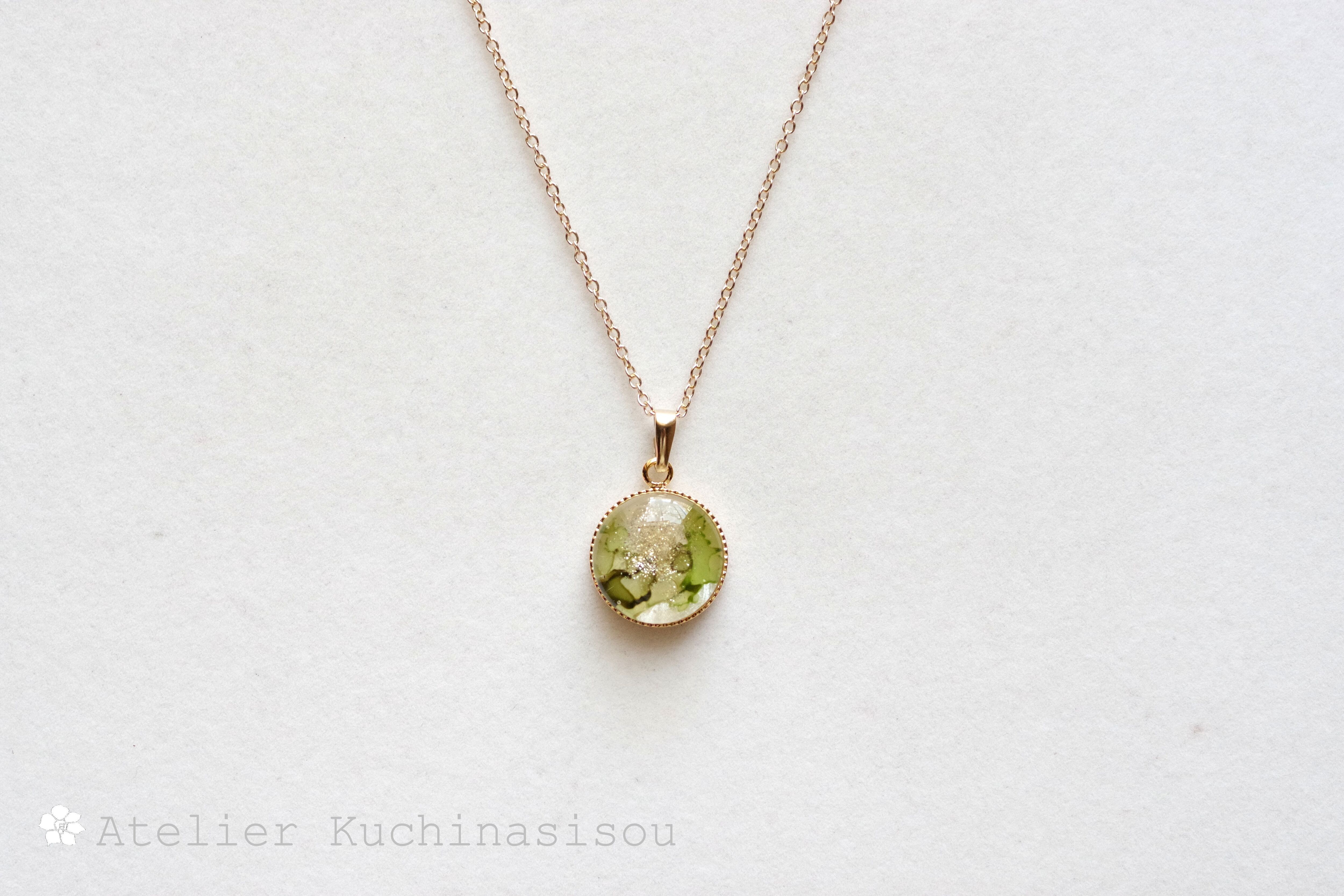 落ち着いた黄緑色が肌によくなじむカラーリングのペンダント。