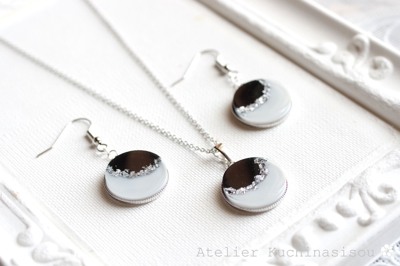 銀箔を境にバイカラーになった白と黒のコントラストがくっきりとした印象を与えるシンプルなペンダント。