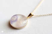 薄紫色のワンポイントにベージュのラメを組み合わせた、優雅な佇まいが特徴のペンダント。