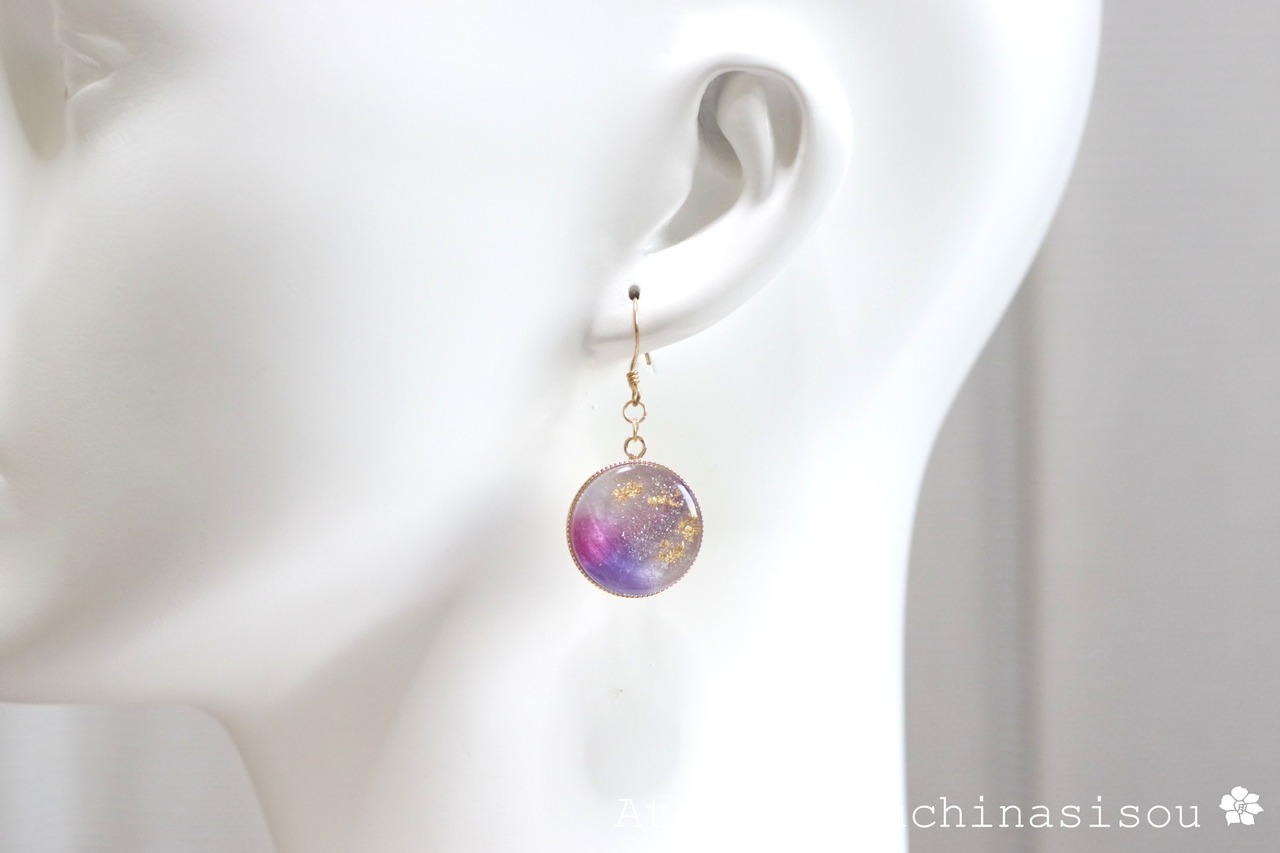 赤紫と青紫が奏でる淑やかなハーモニーに魅入ってしまうピアス。散らした金箔が華やかさを添えています。